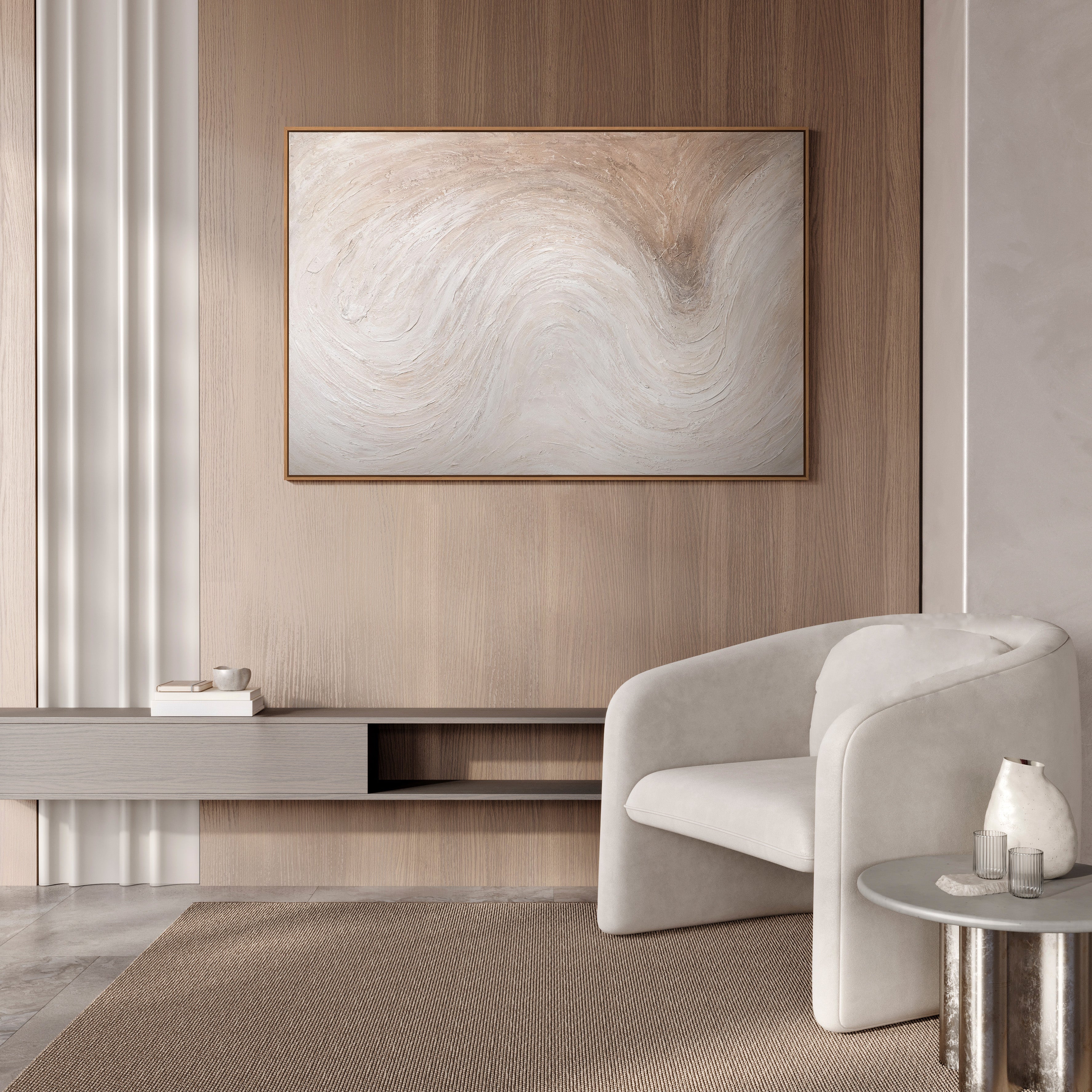 „Lichtstrom“ ist eine abstrakte Acrylmalerei mit sanften, fließenden Bewegungen und einer hellen, natürlichen Farbpalette aus Creme-, Beige- und warmen Sandtönen. Die strukturierte Oberfläche erzeugt Tiefe und eine ruhige Dynamik, die an Licht, Luft und langsame Bewegung erinnert.