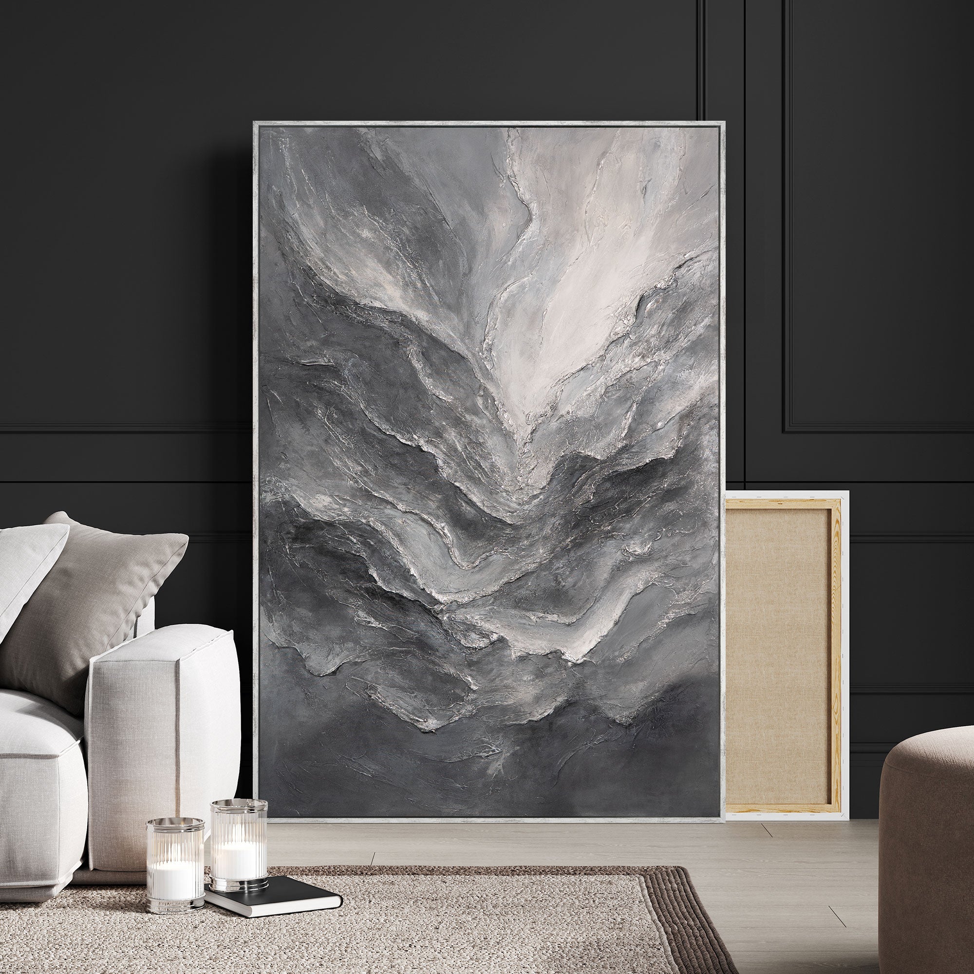 „Erinnerung der Felsen“ ist ein handgemaltes Acrylgemälde, das die Kraft und Beständigkeit der Natur widerspiegelt. In unterschiedlichen Grautönen und steinartigen Nuancen entfalten sich abstrakte Formen, die an Felsformationen erinnern. Die pastose Struktur bringt Tiefe und Lebendigkeit in das Bild und betont seine erdige Eleganz.