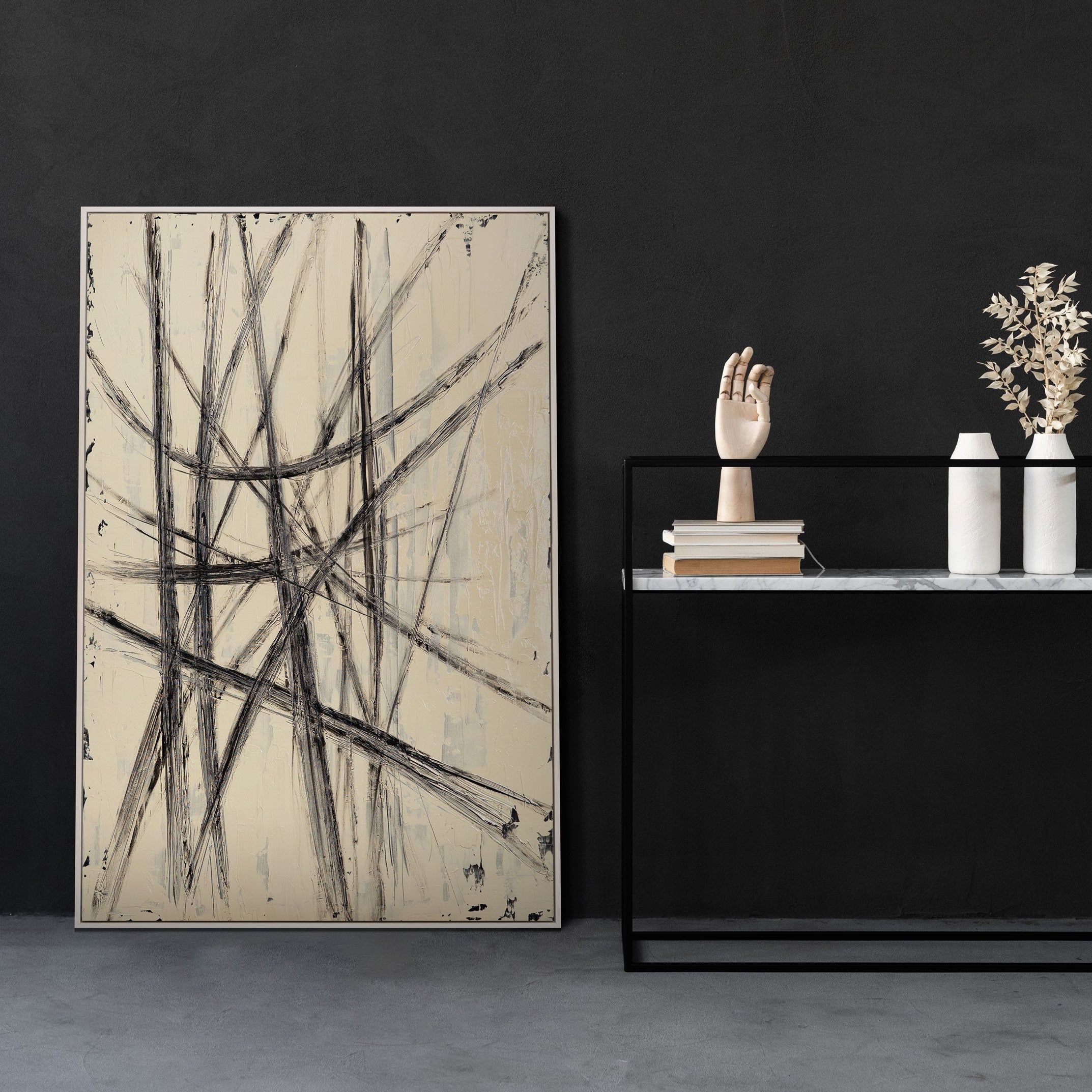 „Parallelen und Schnittpunkte“ vereint Bewegung und Struktur in einem einzigen Ausdruck. Schwarze Linien durchkreuzen die sanfte beigefarbene Fläche, schaffen Rhythmus, Energie und visuelle Tiefe. Das Zusammenspiel von Kontrast und Textur vermittelt Spannung und Balance zugleich – ein Bild, das den Raum belebt und gleichzeitig ordnet.