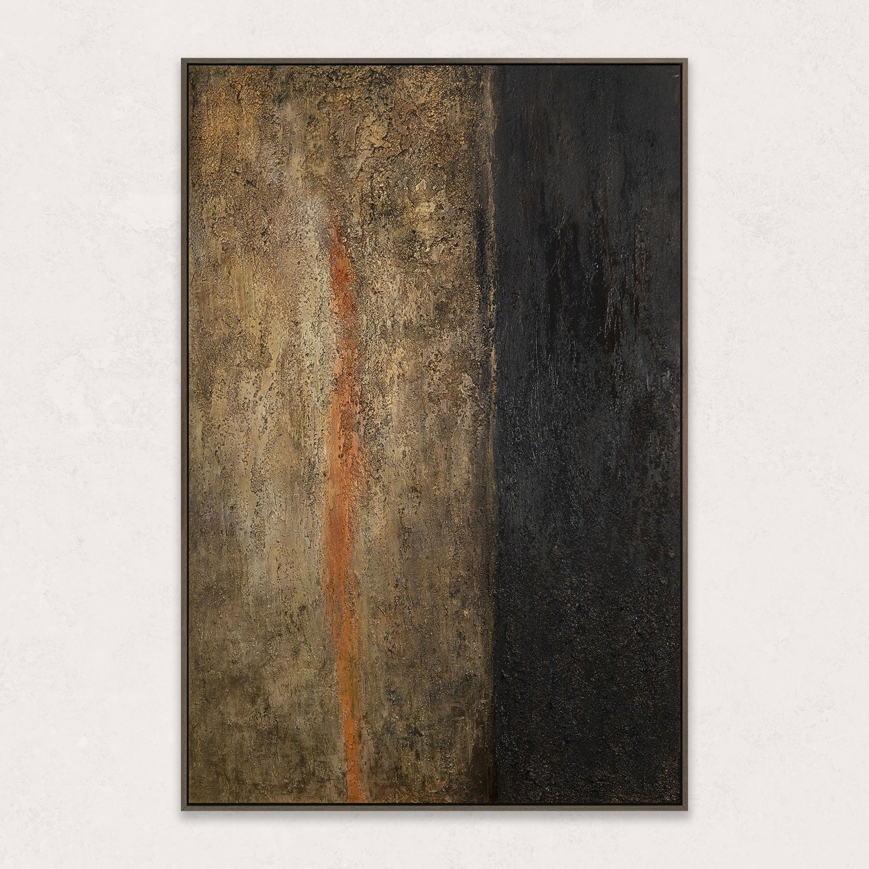 „Tiefe der Zeit“ ist ein kraftvolles, handgemaltes Acrylgemälde, das durch seine kontrastreiche Farbgebung und intensive Struktur besticht. Die Kombination aus tiefem Schwarz, warmen Brauntönen, edlem Gold und einem feinen Rotakzent erzeugt eine mystische und zugleich elegante Wirkung. Die reliefartige Oberfläche verleiht dem Werk Tiefe und Ausdruckskraft.