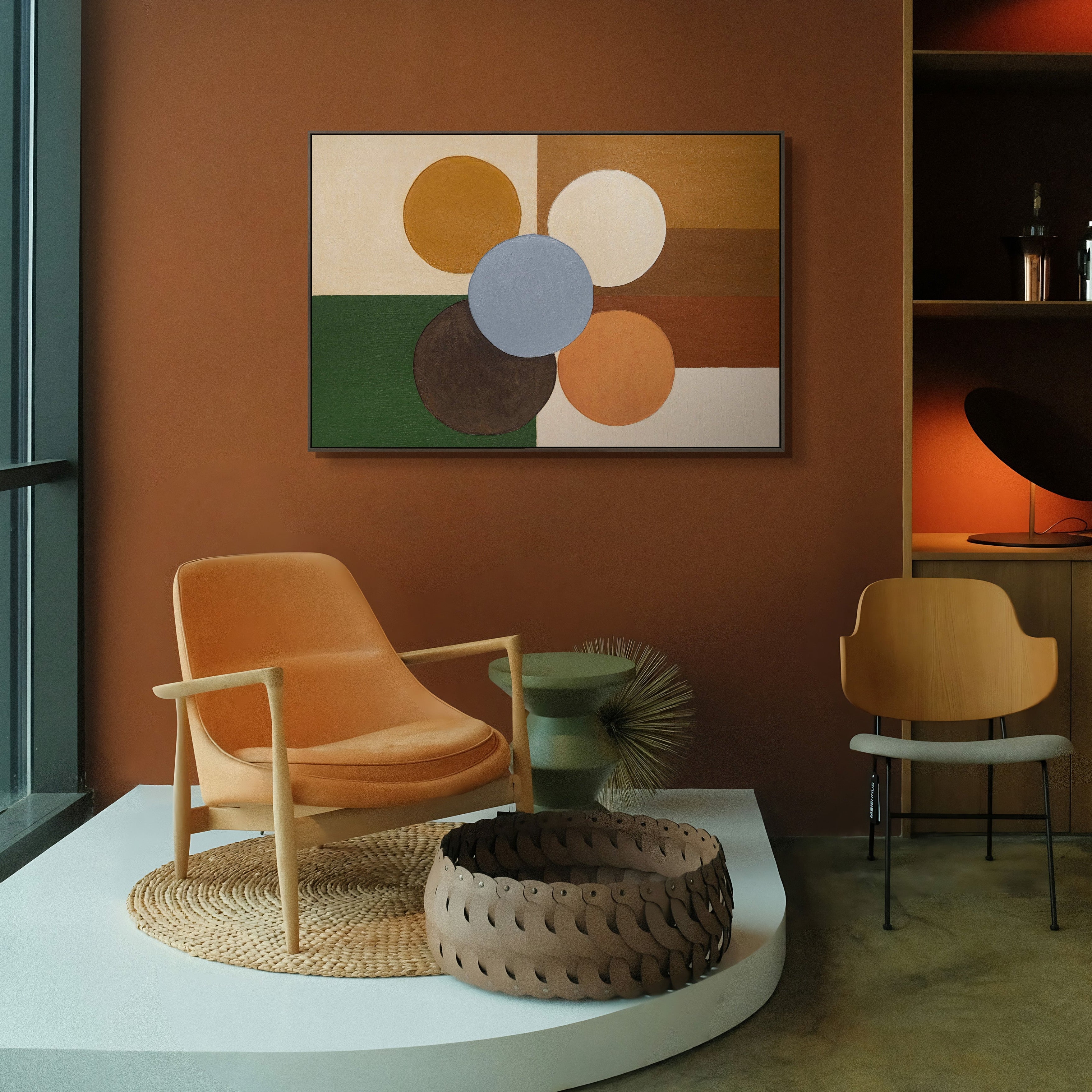 „Sphäre der Balance“ verbindet geometrische Klarheit mit warmer Farbwirkung. Das Bild schafft Ordnung und Ruhe im Raum und wirkt gleichzeitig modern und zeitlos ohne aufdringlich zu sein.