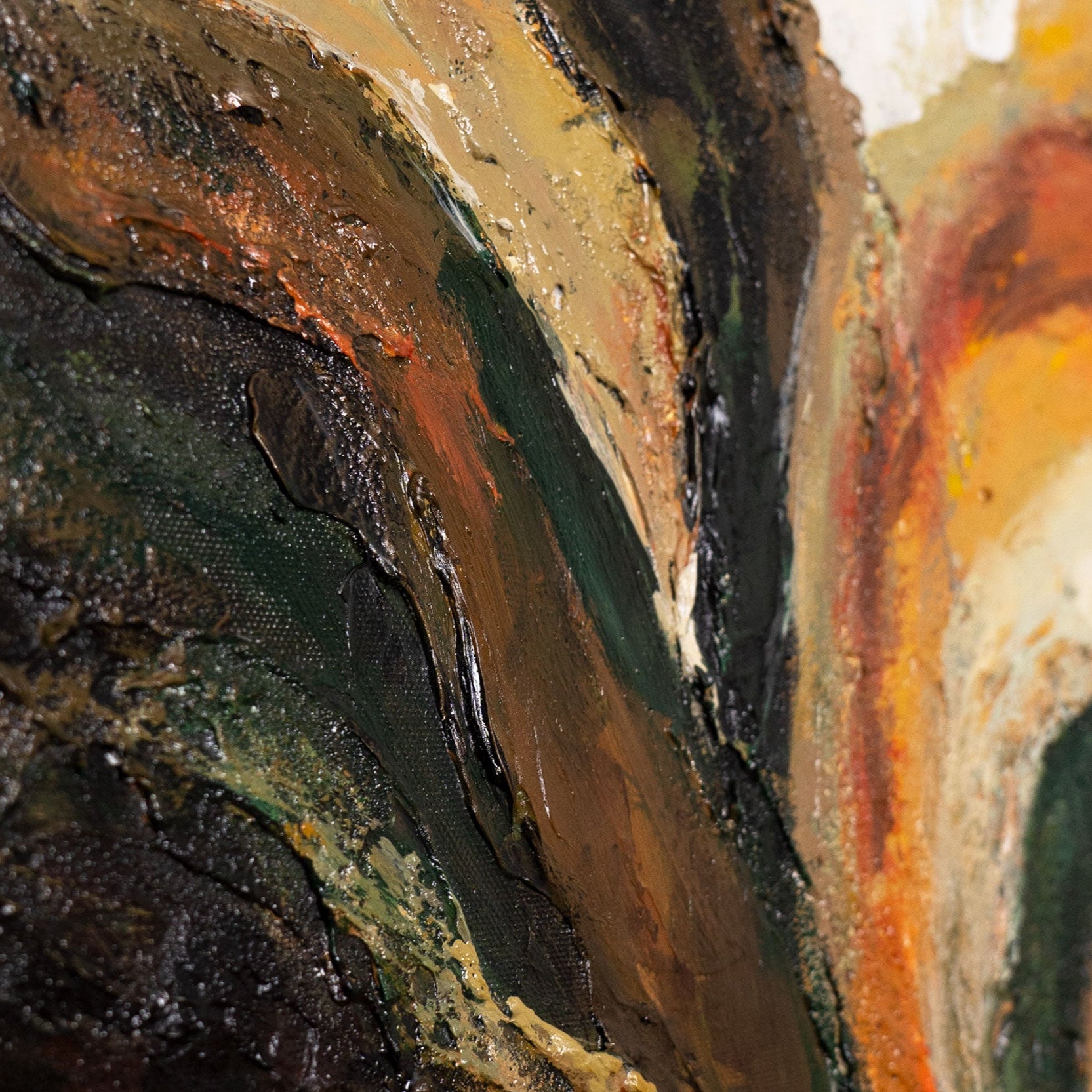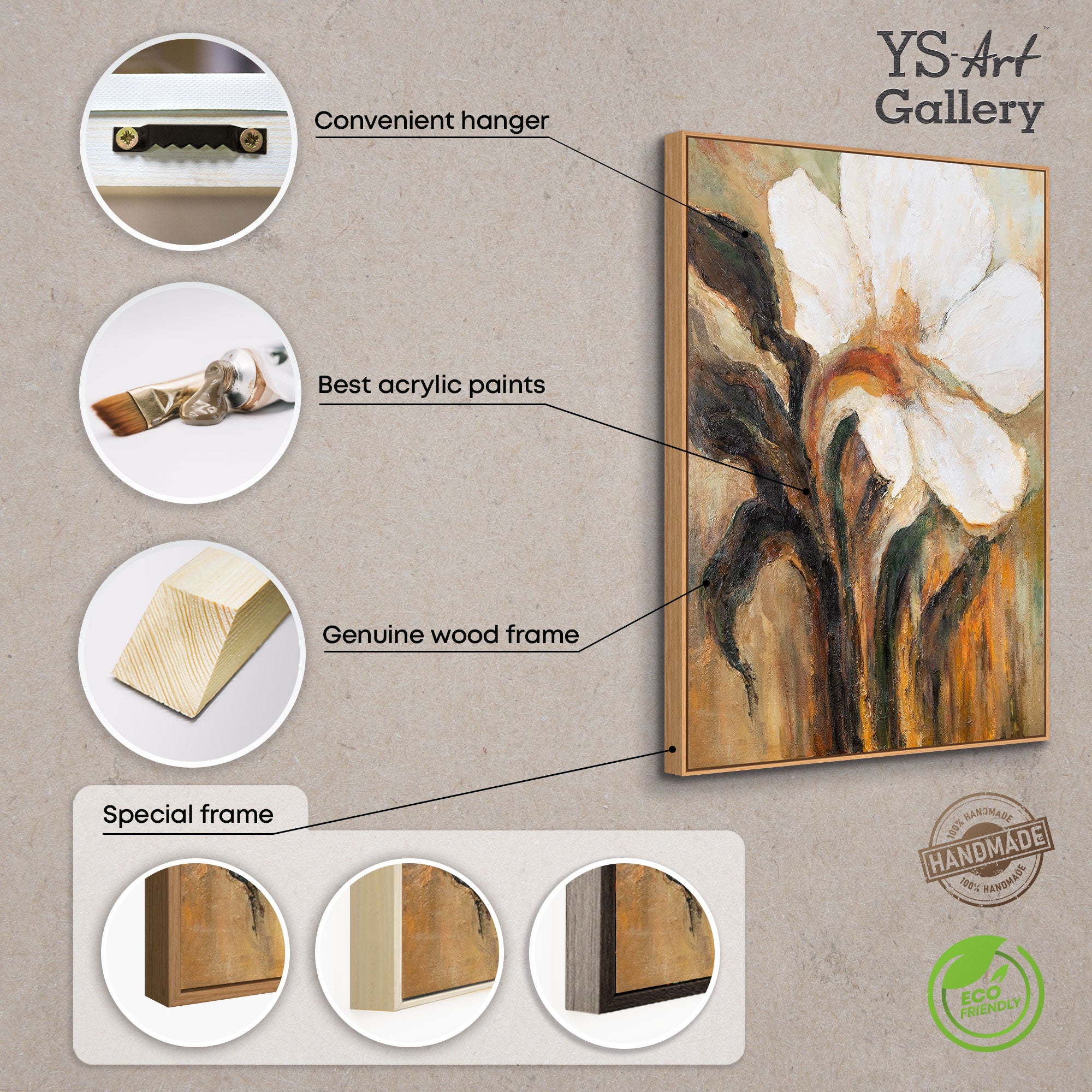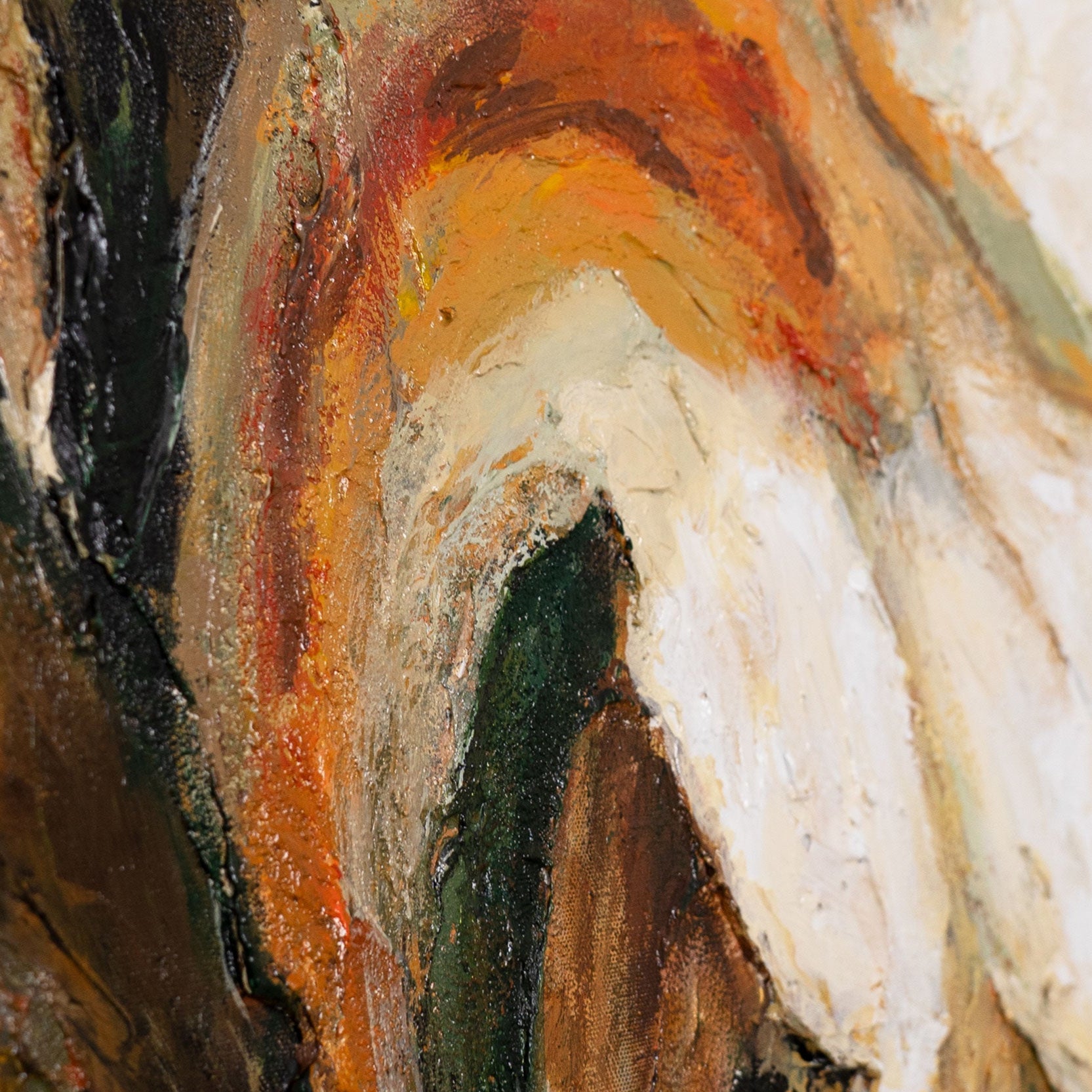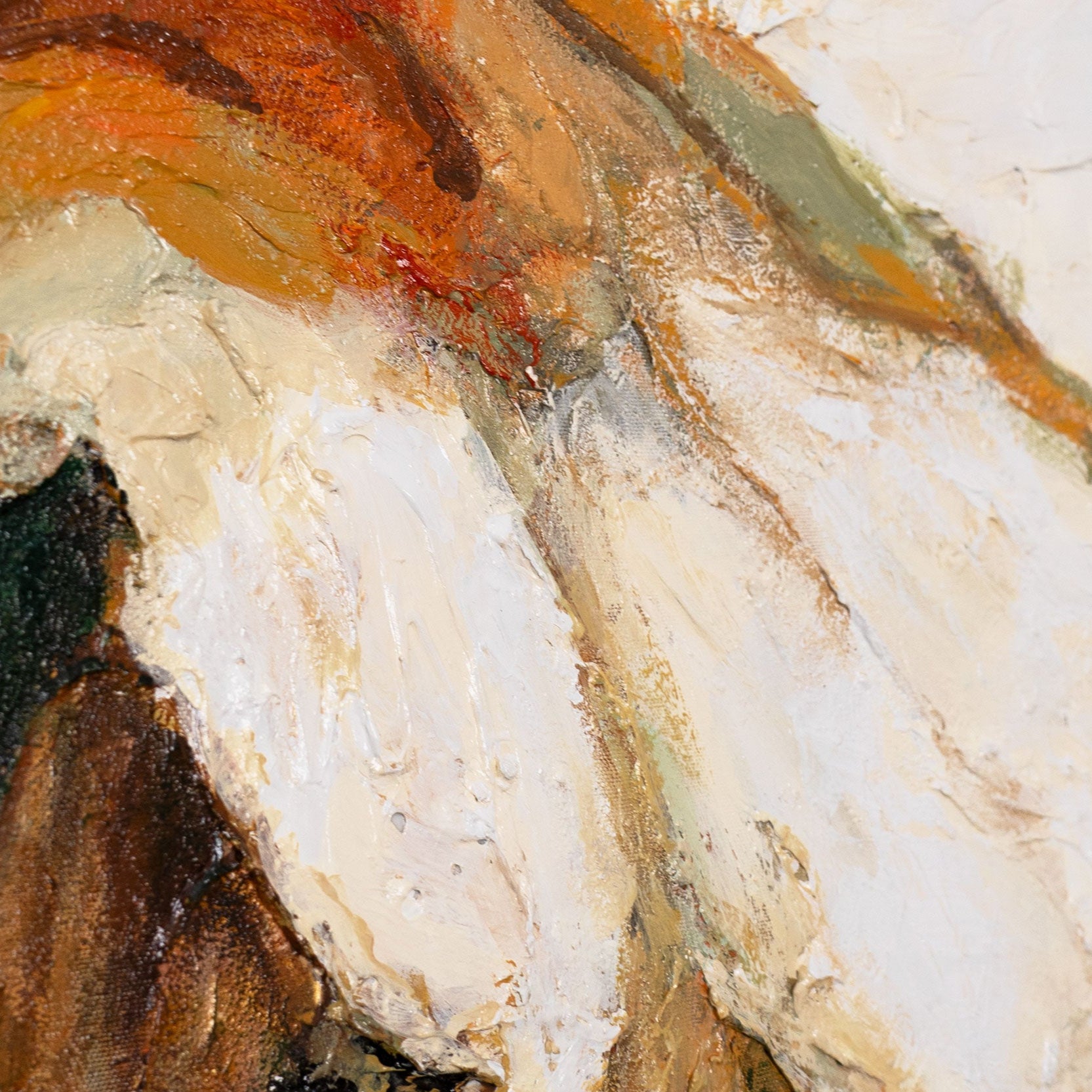 Das handgemalte Leinwandbild „Vergehen der Zeit“ zeigt eine eindrucksvolle weiße Blüte, deren Textur und Farben eine harmonische Verbindung von Natürlichkeit und künstlerischer Ausdruckskraft schaffen. Warme Braun- und Grüntöne, durchzogen von sanften Orange- und Goldnuancen, verleihen der Blume Tiefe und Lebendigkeit. Die strukturierte Oberfläche betont die plastische Wirkung und macht jedes Detail spürbar.