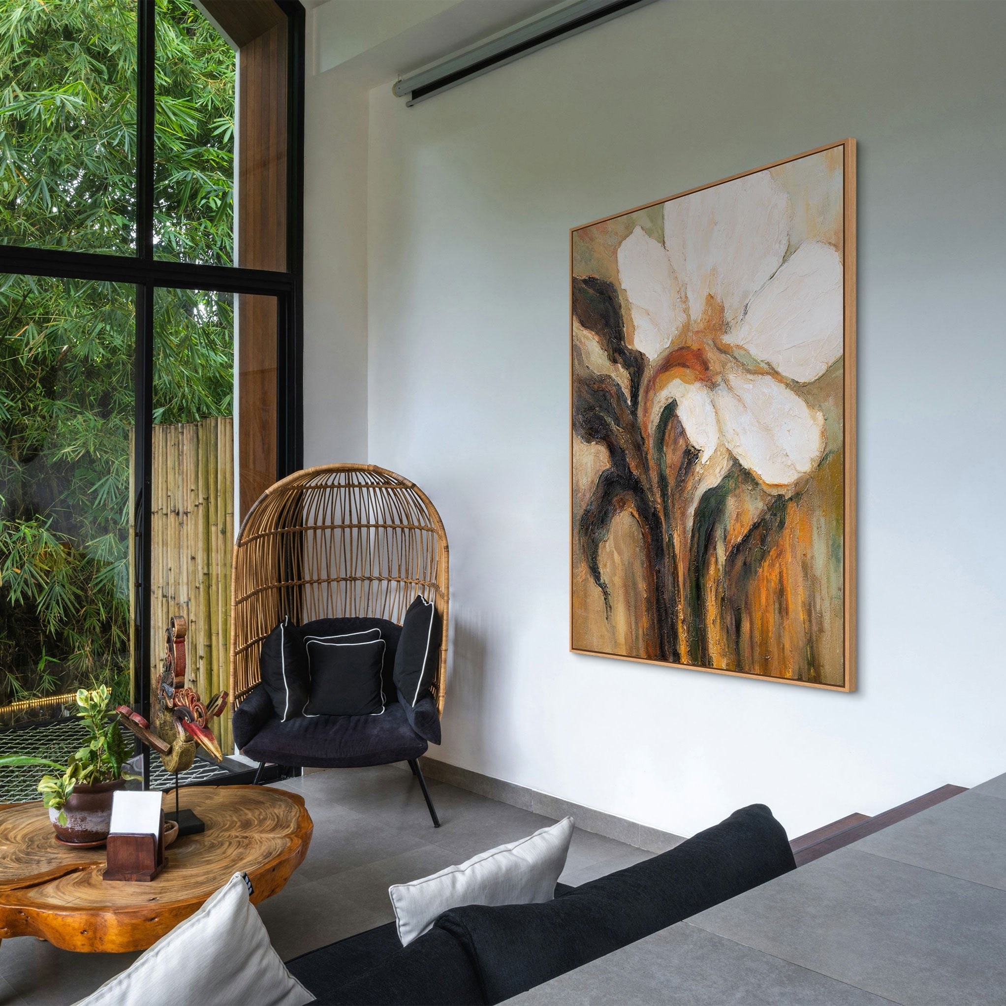 Dieses florale Kunstwerk ist die perfekte Wahl für Liebhaber von moderner und zugleich zeitloser Wanddeko. Es passt hervorragend in Wohnzimmer, Schlafzimmer oder Esszimmer und bringt eine warme, elegante Atmosphäre in Ihr Zuhause.