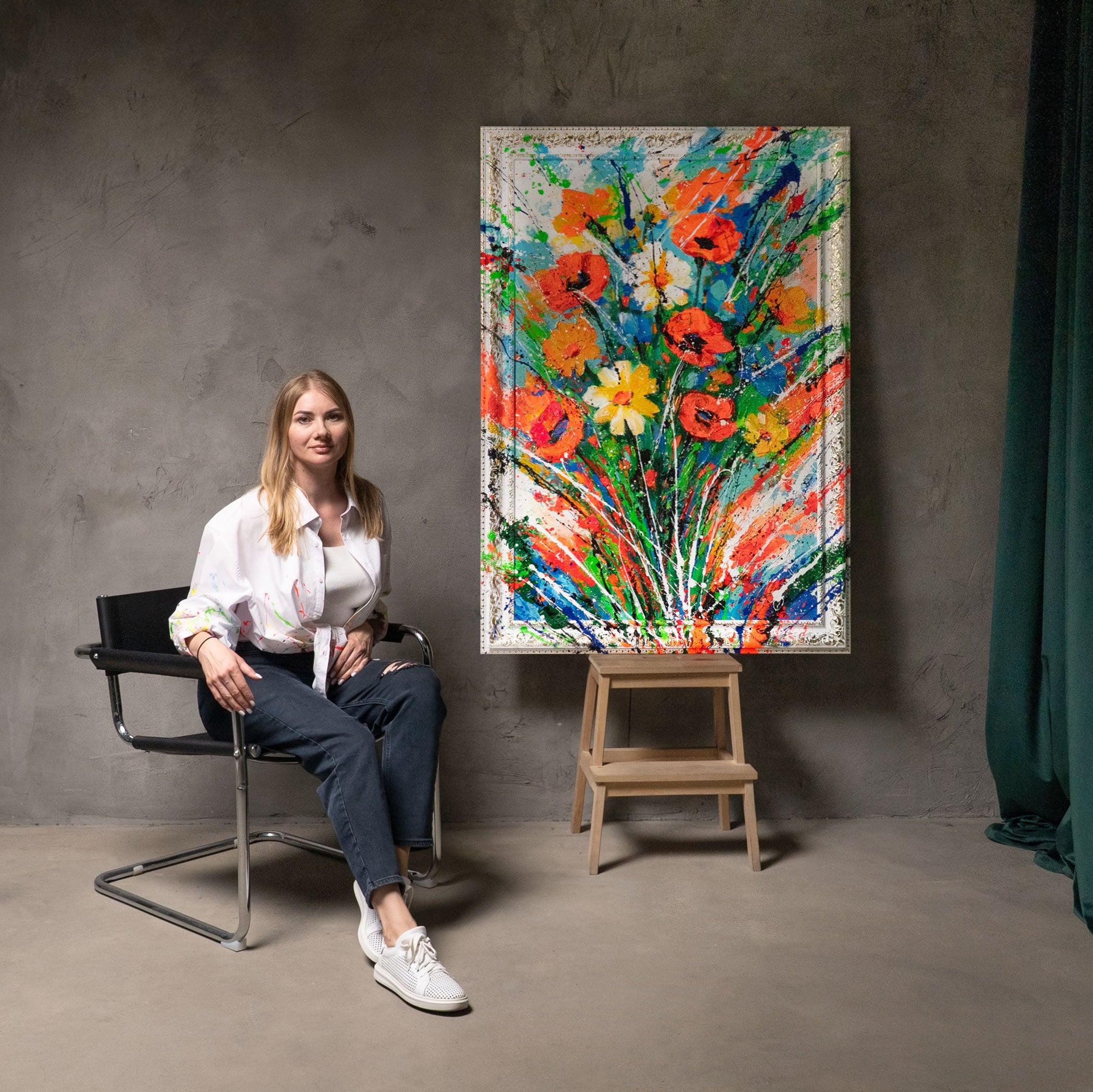 „Wärme der Blütenblätter“ zeigt einen explosiven Strauß aus Mohnblumen, Margeriten und Fantasieblüten – gemalt in leuchtendem Rot, Gelb, Orange, Grün und Blau. Die expressiven Farbspuren und Spritzer verleihen dem Werk Energie, Lebendigkeit und Tiefe. Jeder Pinselstrich ist handgemalt und bringt die Intensität der Natur auf die Leinwand.