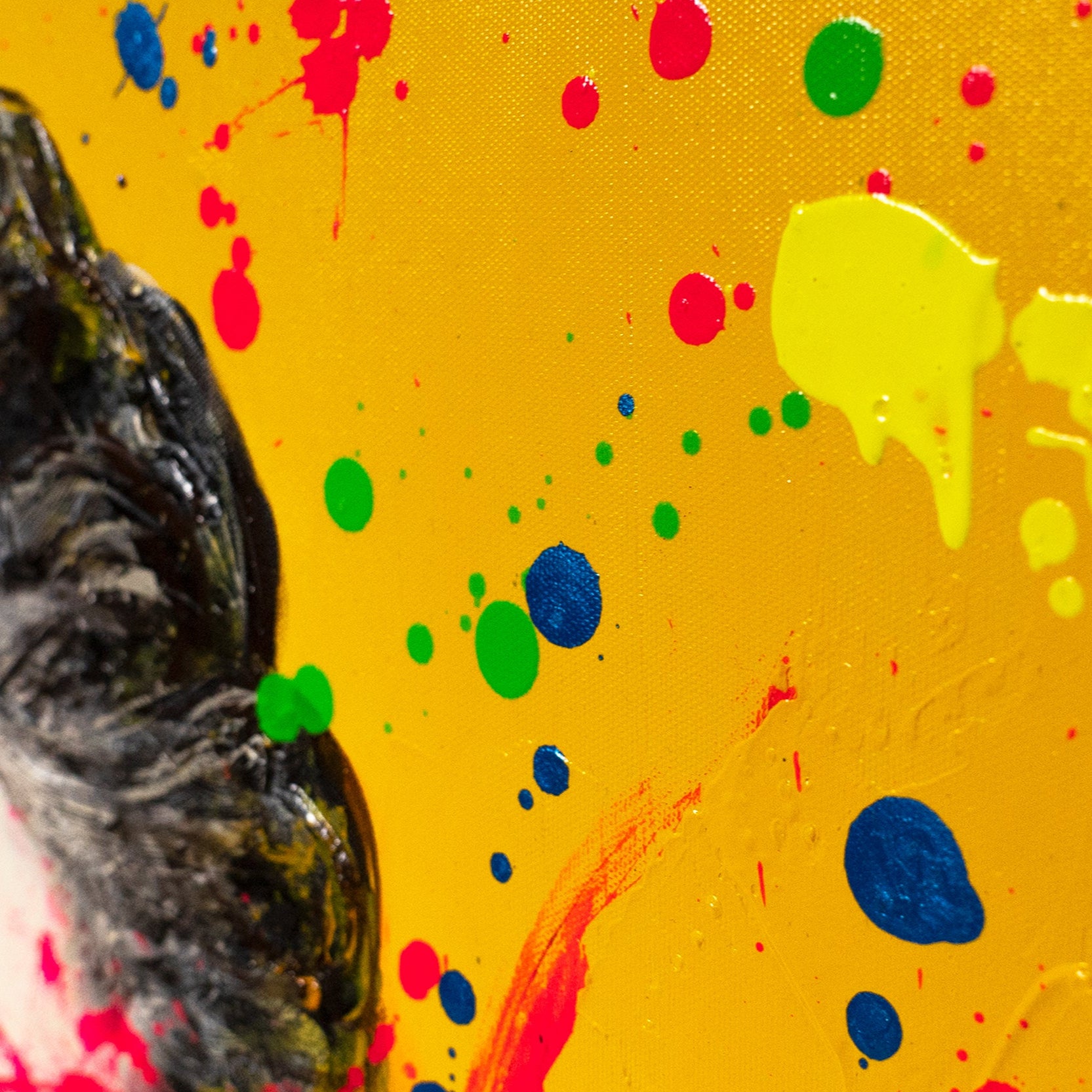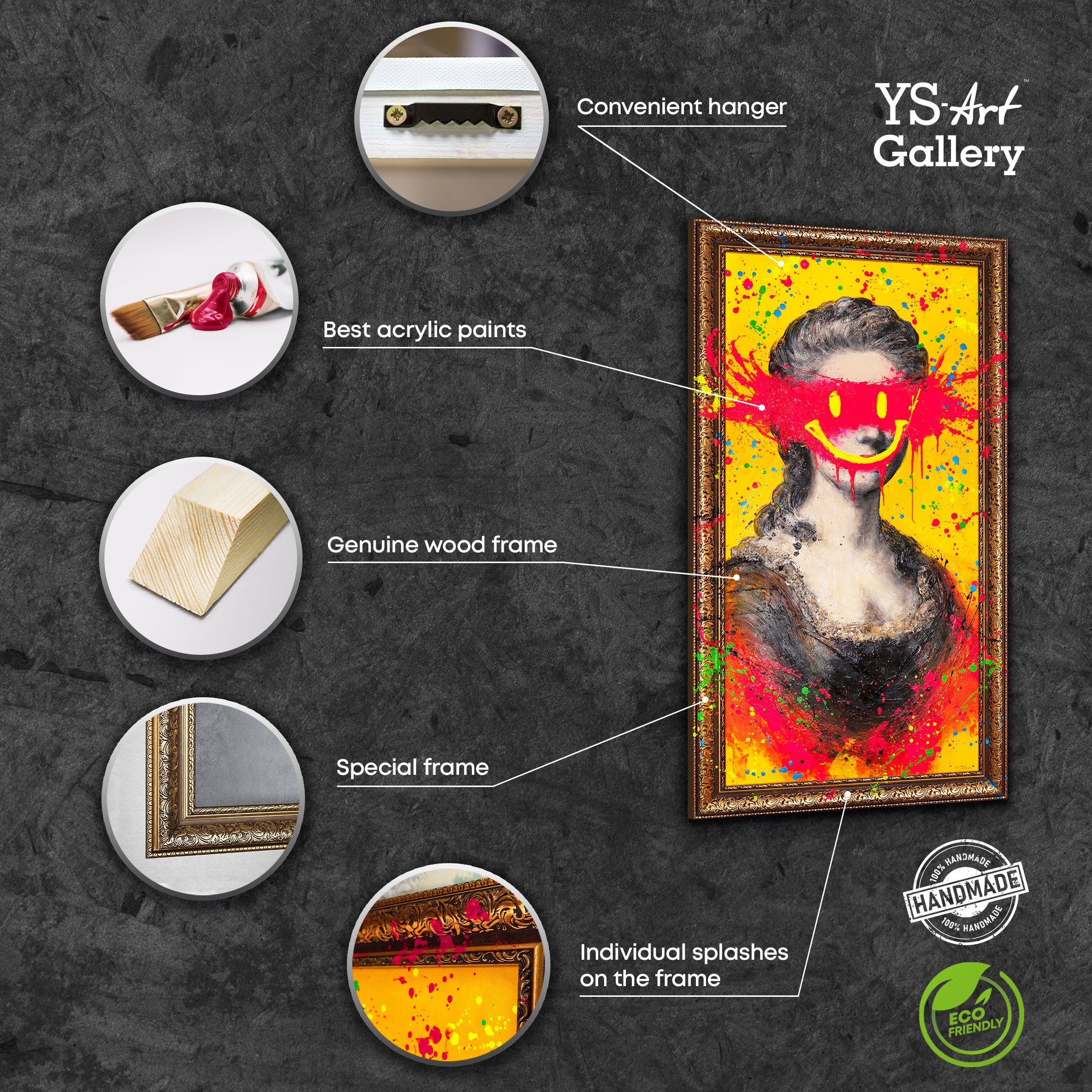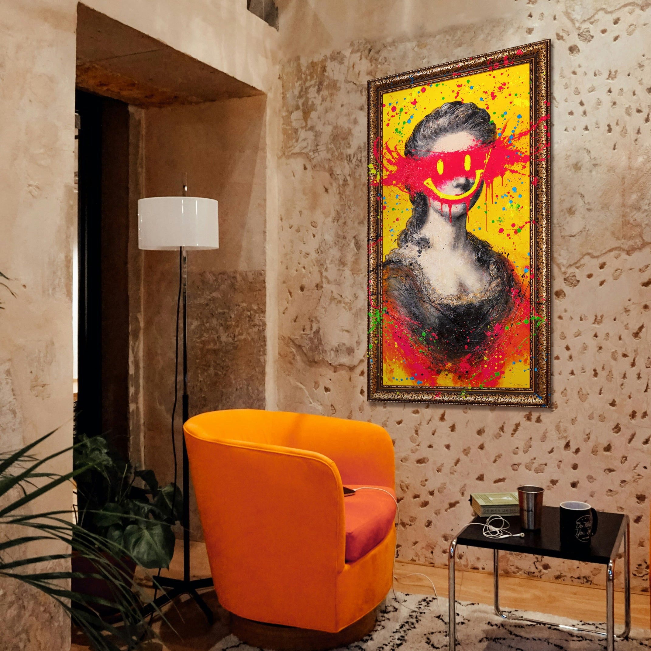 „Madame“ verbindet klassische Eleganz mit rebellischer Street-Art. Auf sonnig-gelbem Hintergrund erscheint ein traditionelles Frauenportrait in Schwarz-Weiß, überlagert von einem knalligen roten Smiley-Tag. Farbspritzer in Blau, Grün und Gelb brechen das Bild auf und machen es zu einer provokativen Pop-Art-Ikone.