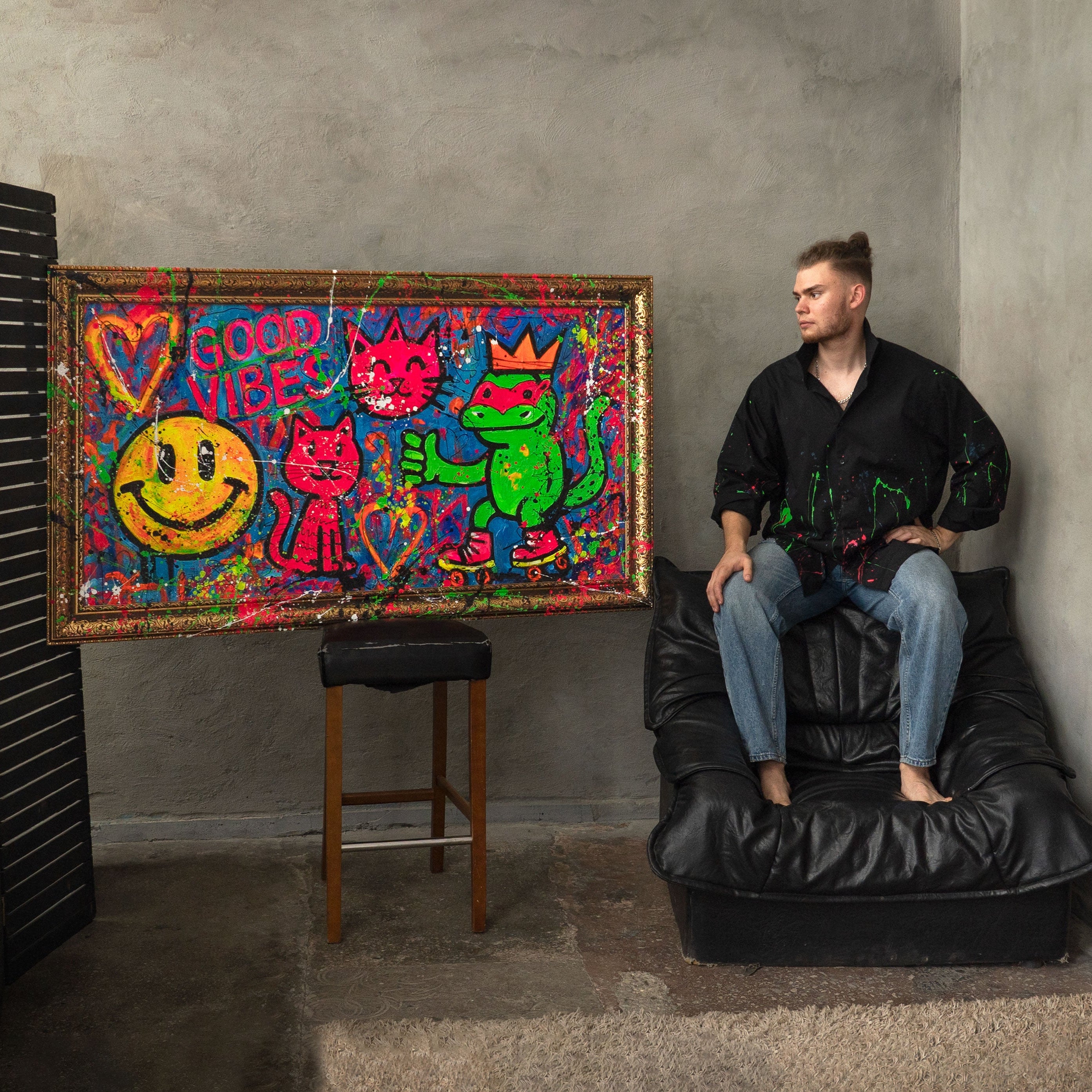 Perfekt für alle, die moderne wanddeko wohnzimmer, ausgefallene pop art bilder oder lebendige graffiti kunstwerke suchen. Jedes Detail ist handgemalt – ein echtes Unikat voller Dynamik und urbanem Lifestyle.