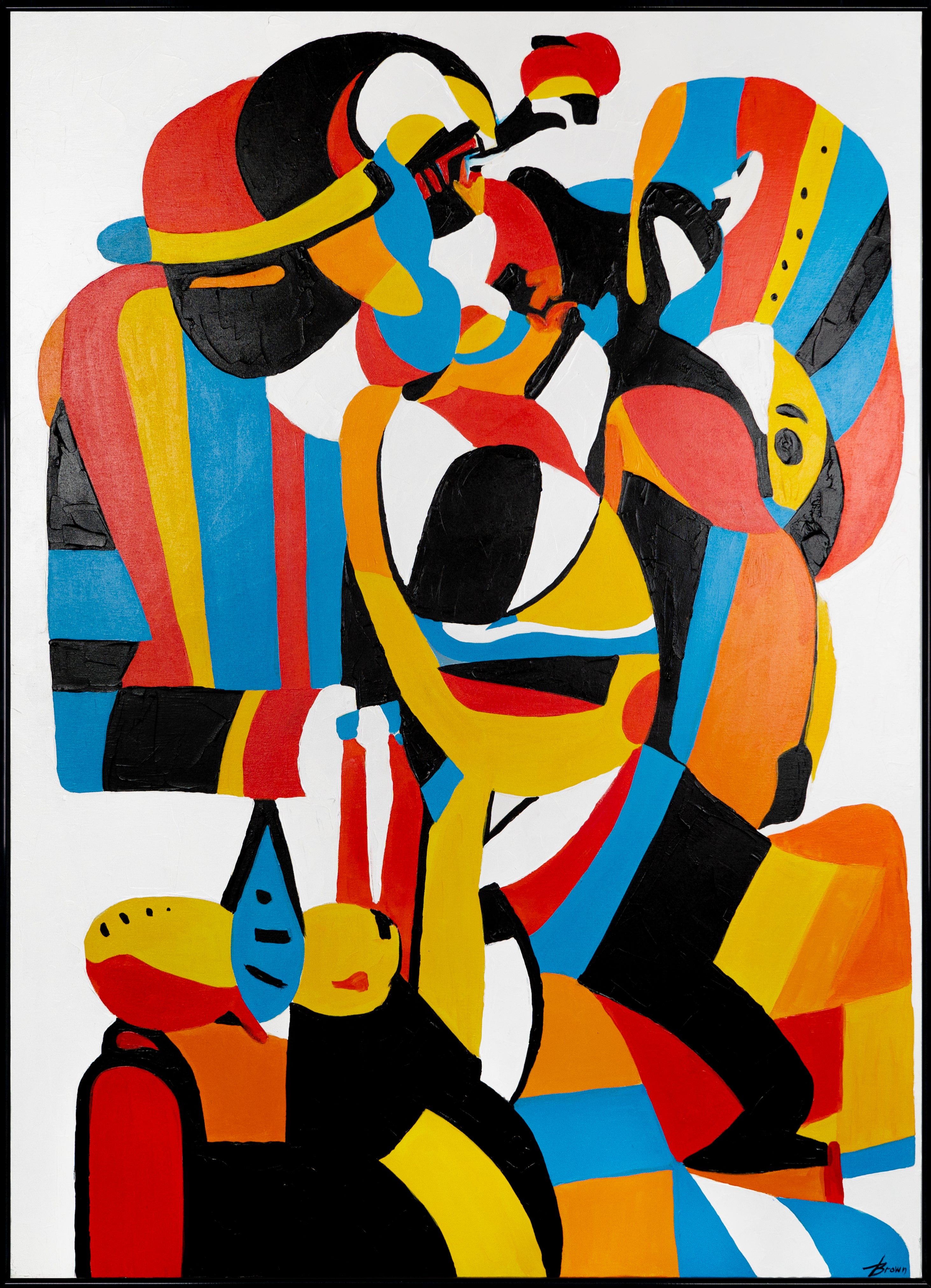Diese farbintensive Komposition zieht mit ihren klaren Formen, intensiven Farbflächen und grafischen Kontrasten sofort alle Blicke auf sich. Das abstrakte Motiv wirkt wie ein ausdrucksstarkes Geflecht aus Körpern, Linien und Bewegungen – dynamisch, kraftvoll und modern. Die bewusst eingesetzten schwarzen Konturen sowie leuchtende Töne in Rot, Gelb, Blau und Orange erzeugen eine visuelle Spannung, die das Bild lebendig erscheinen lässt.