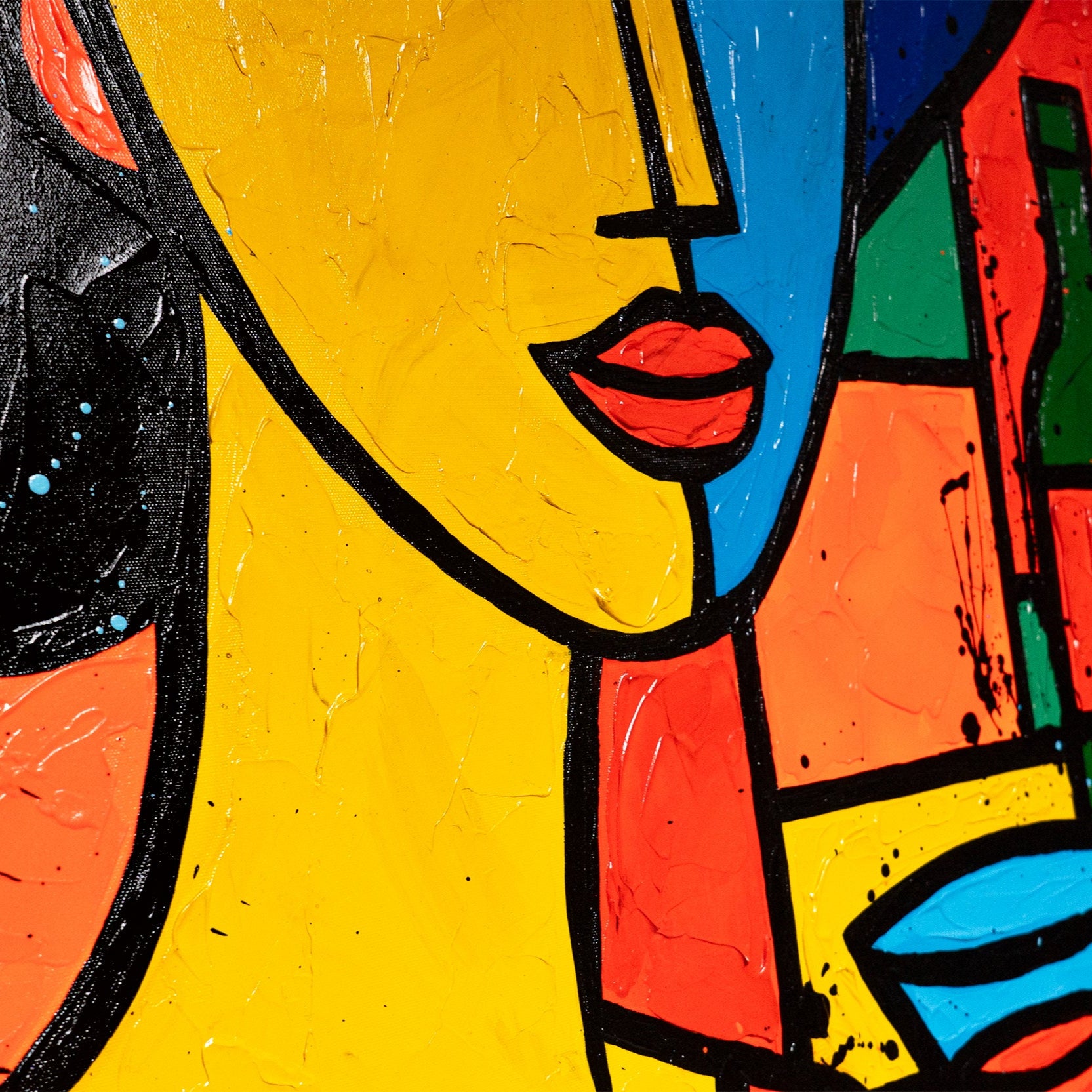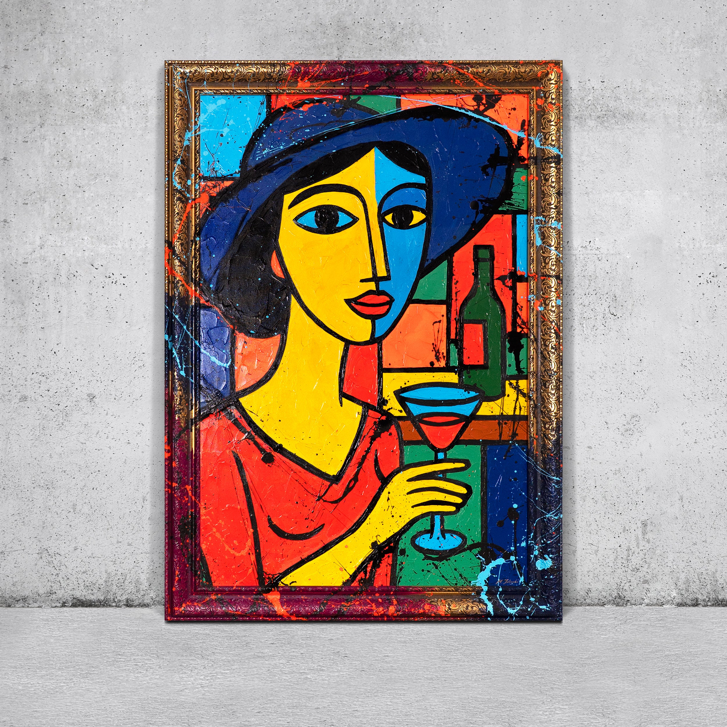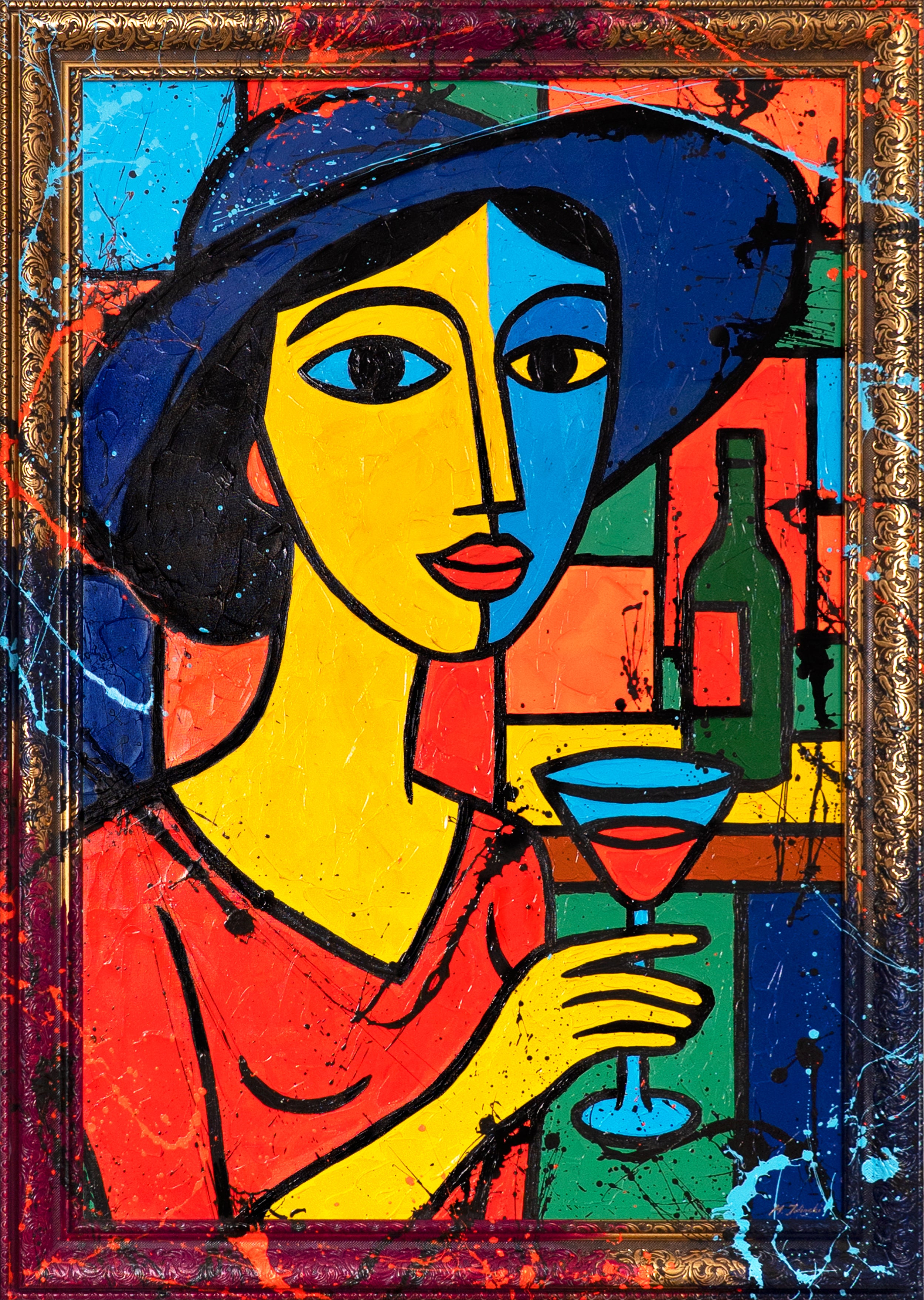 „Dame in der Bar“ zeigt eine stilisierte Frau mit Hut und Glas im kubistisch inspirierten Pop-Art-Stil. Klare Linien, kräftige Farben und kontrastreiche Formen verleihen diesem Gemälde eine unverwechselbare Präsenz. Der Hintergrund in leuchtenden Farbfeldern mit Flasche und Glas verstärkt den modernen Charakter des Bildes.