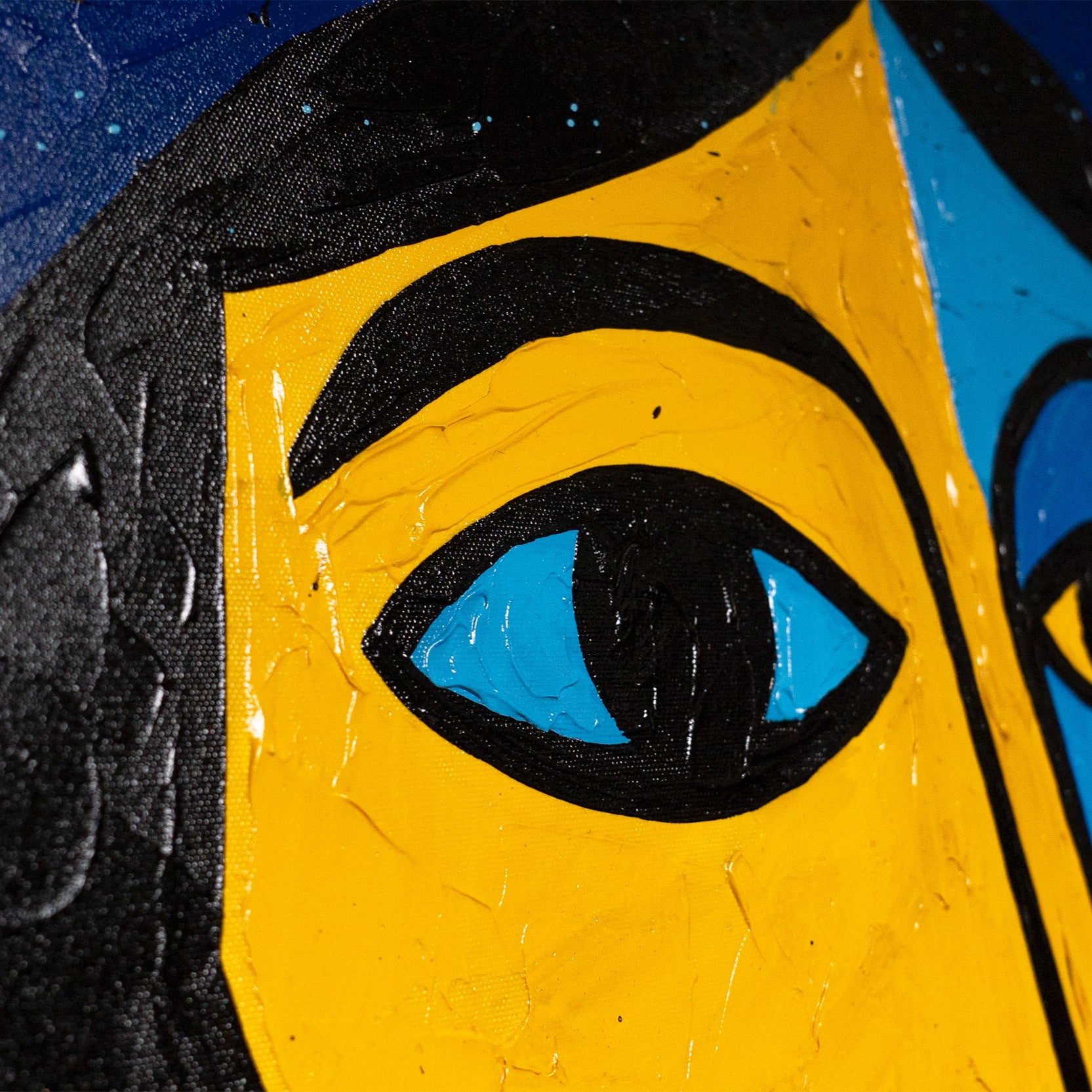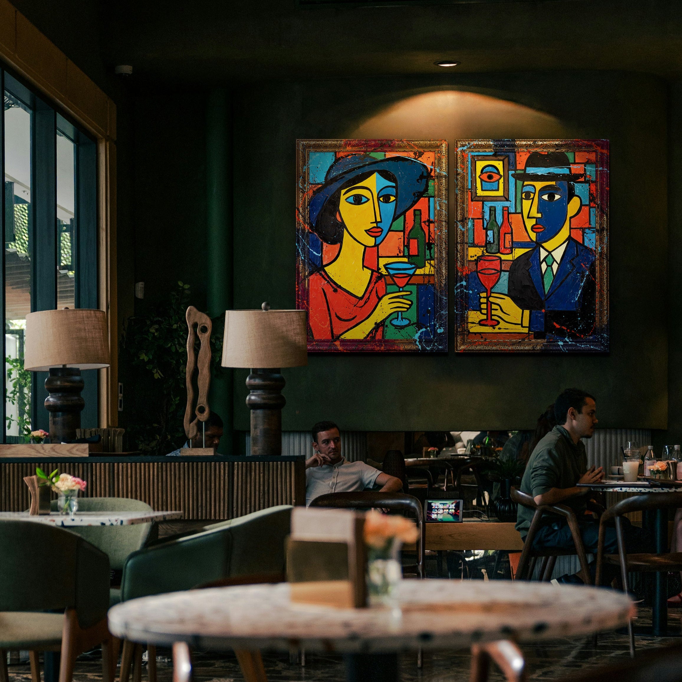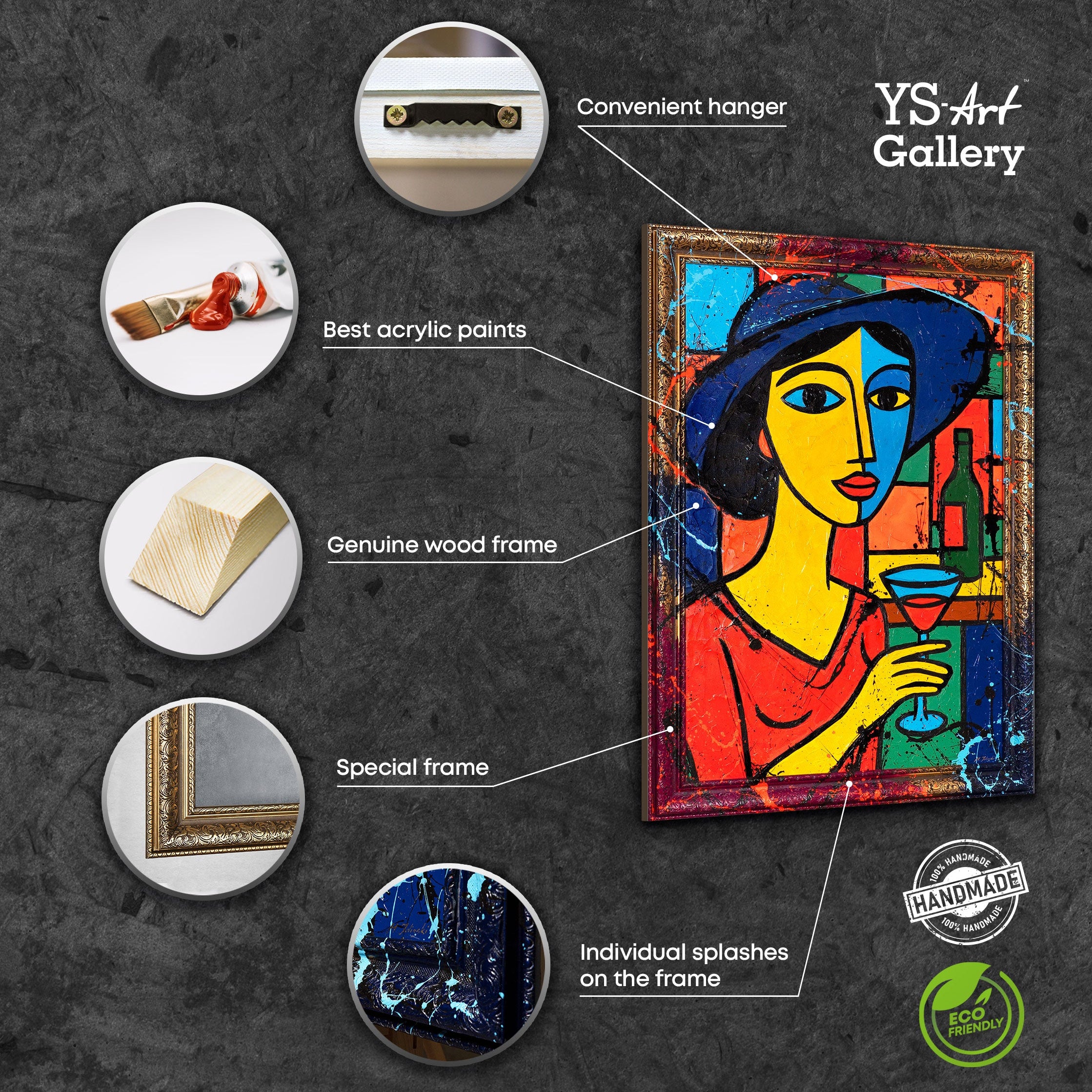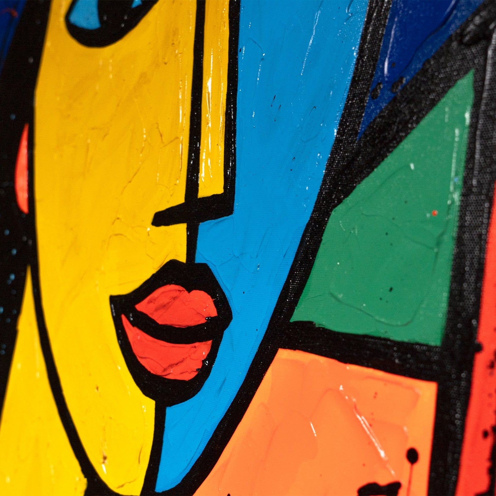 „Dame in der Bar“ zeigt eine stilisierte Frau mit Hut und Glas im kubistisch inspirierten Pop-Art-Stil. Klare Linien, kräftige Farben und kontrastreiche Formen verleihen diesem Gemälde eine unverwechselbare Präsenz. Der Hintergrund in leuchtenden Farbfeldern mit Flasche und Glas verstärkt den modernen Charakter des Bildes.