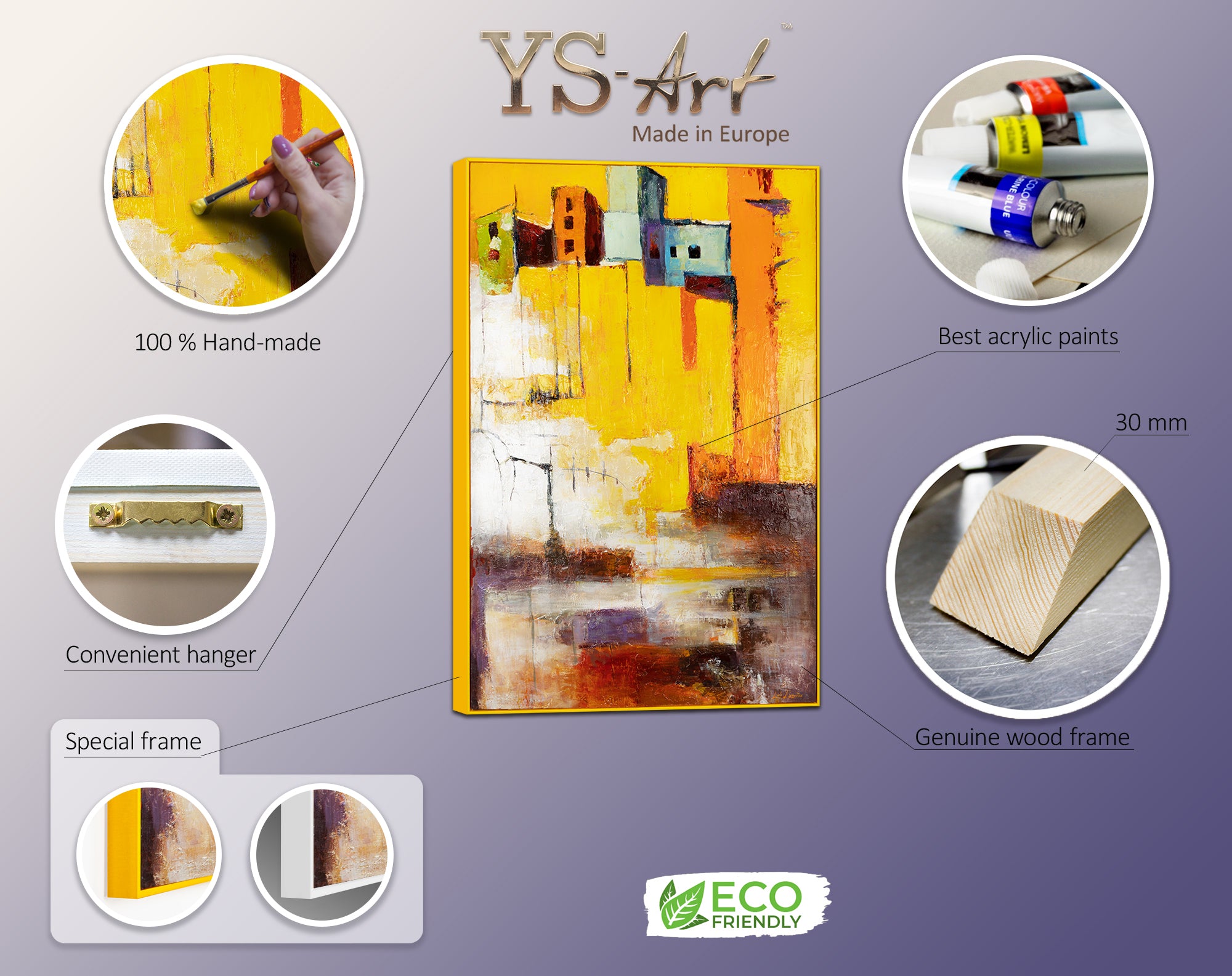 Tauchen Sie ein in die strahlenden Farben dieses handgemalten Acrylbildes „Gelbe Stadt“. Die kraftvollen Gelbtöne kombiniert mit dezenten Akzenten von Orange, Rot und Lila bringen Dynamik und Energie in jeden Raum.