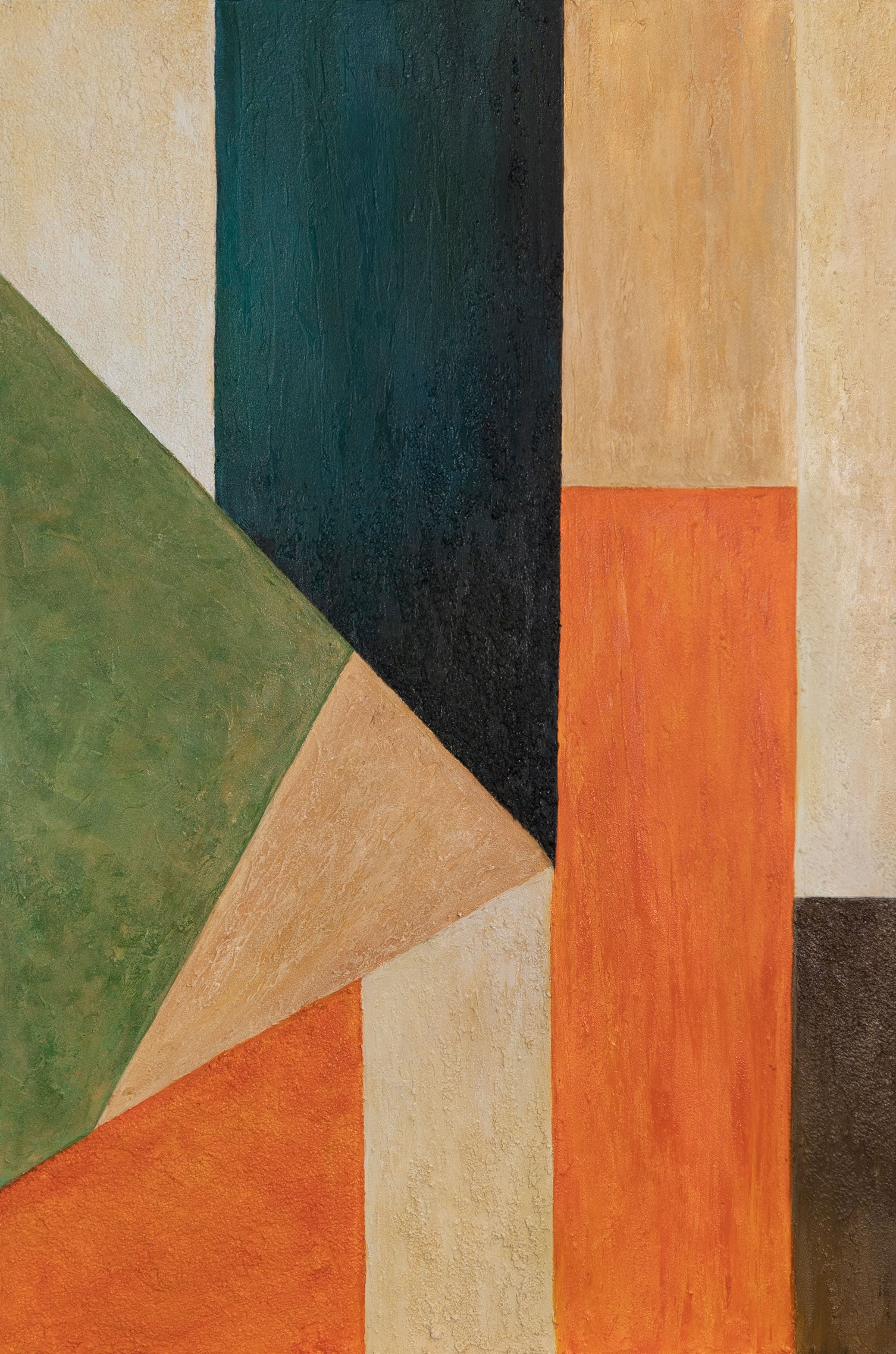 „Ordnung und Bewegung“ vereint klare Linien mit lebendigen Farbakzenten. Geometrische Flächen in Orange, Grün, Schwarz und Beige bilden ein spannungsreiches Zusammenspiel aus Stabilität und Dynamik. Die Struktur des Acryls verleiht der Komposition Tiefe und taktile Ausdruckskraft.