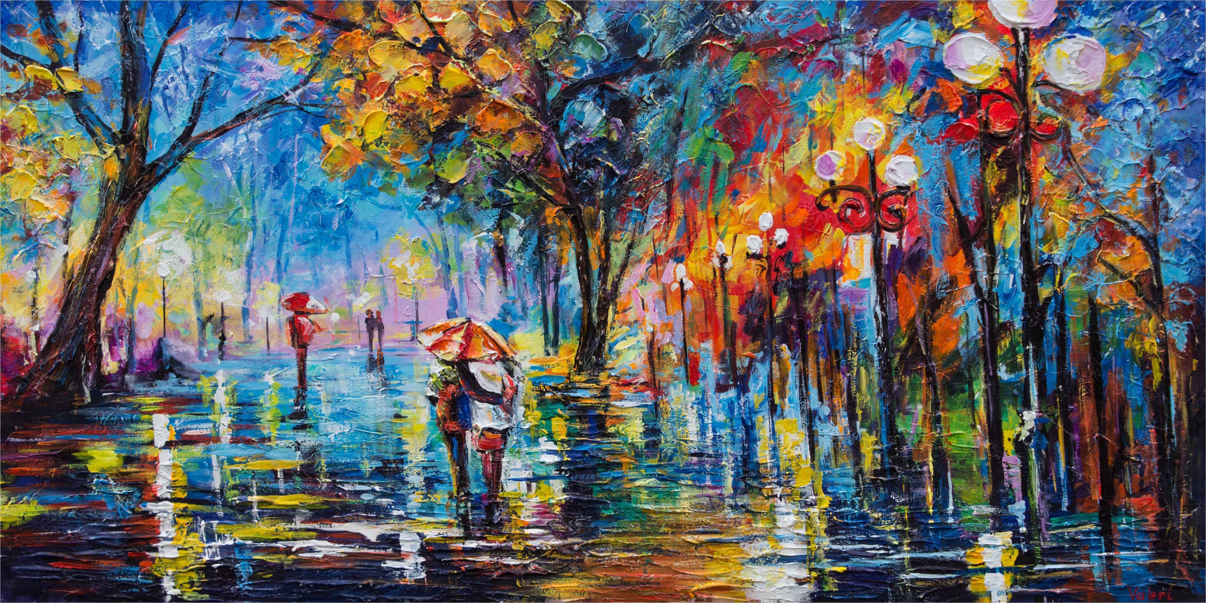 Dieses farbintensive Leinwandbild fängt die Magie eines herbstlichen Spaziergangs in leuchtenden, lebendigen Farben ein. In einem impressionistischen Stil sind Bäume, Lichter und Figuren in einer herbstlich gefärbten Allee dargestellt – mit roten, gelben, blauen und violetten Akzenten, die den Glanz feuchter Straßen im Licht der Laternen widerspiegeln. Die Szene wirkt dynamisch und zugleich poetisch, als würde sie den Klang fallender Blätter und das sanfte Murmeln der Schritte auf dem nassen Boden einfangen.