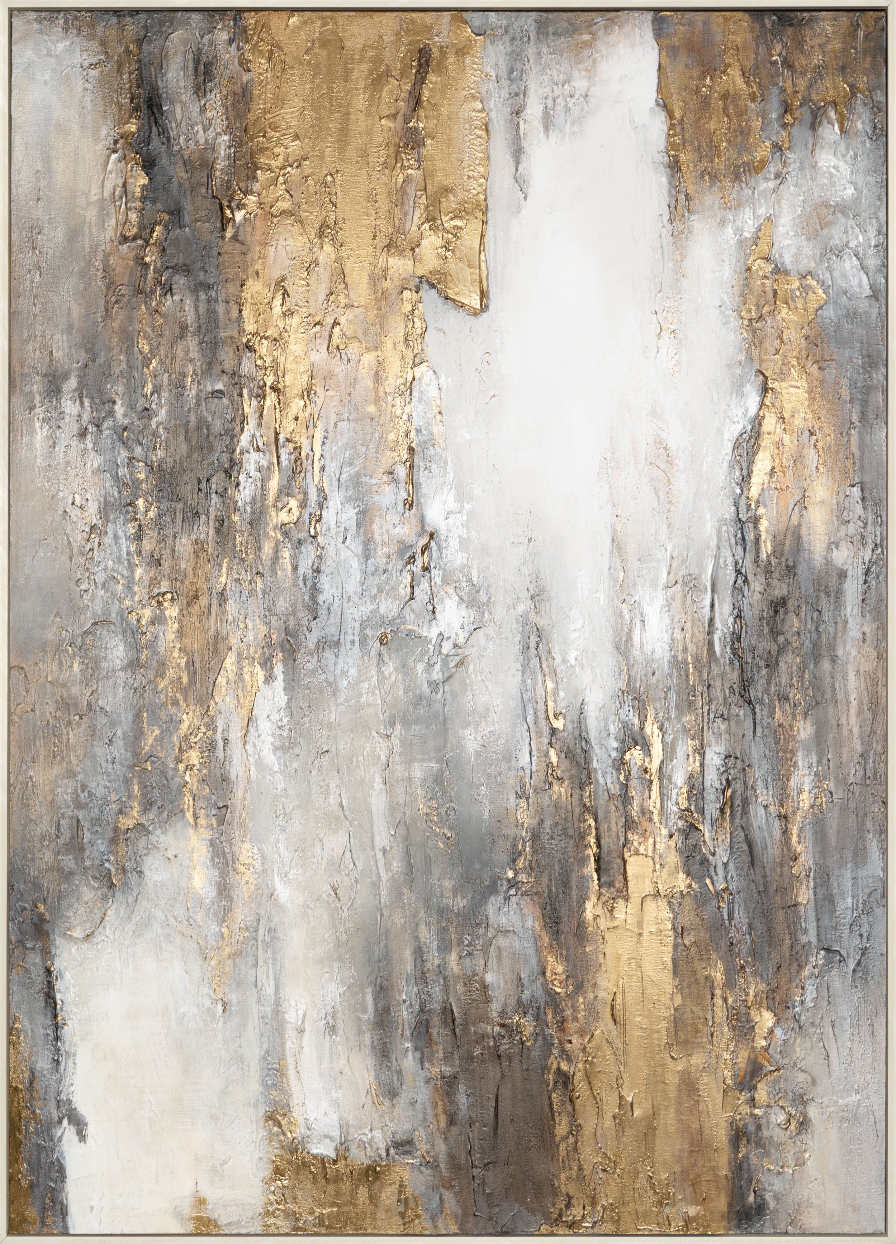 Ein einzigartiges Acrylgemälde, das durch seine strukturierte Oberfläche und die harmonische Farbgebung in Gold, Grau und Beige eine ruhige, zeitlose Ausstrahlung entfaltet. Die vertikale Fließrichtung der Texturen erinnert an sanft herabgleitendes Wasser und vermittelt das Gefühl von innerer Balance und stiller Bewegung. Goldakzente fangen das Licht ein und verleihen der Komposition eine luxuriöse Tiefe.
