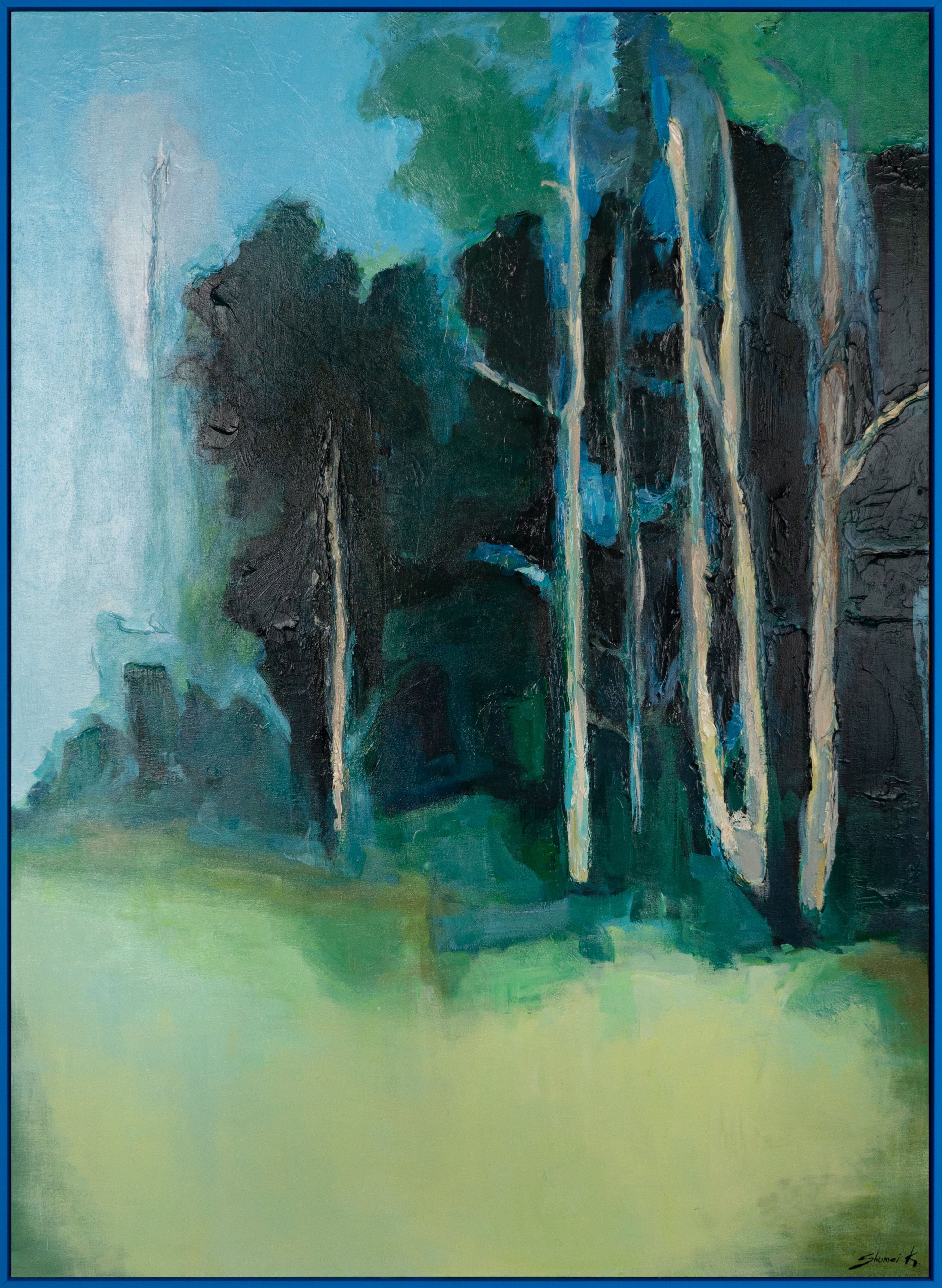 Dieses abstrakte Gemälde zeigt eine ruhige Waldszene mit schlanken Birken, deren weiße Stämme sich vom dunkelgrünen Hintergrund abheben. Die sanften Übergänge von Hell- zu Dunkelblau, durchsetzt mit zarten Grün- und Naturtönen, verleihen der Szene eine geheimnisvolle Tiefe. Die unaufdringliche Farbpalette schafft eine entspannte Stimmung, in der man gedanklich durch stille Waldwege spazieren möchte.