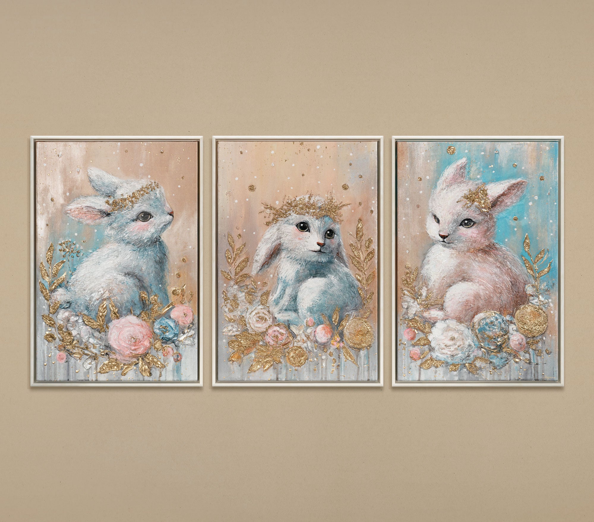 Das Triptychon „Waldkinder“ ist ein zauberhaftes Acryl Leinwandbild, das drei liebevoll gestaltete Motive von Waldtieren in sanften Pastellfarben zeigt. Die handgemalte, strukturierte Oberfläche unterstreicht die feinen Details der Waldkinder und verleiht dem Kunstwerk eine warme, einladende Atmosphäre. Dieses Original-Triptychon bringt eine märchenhafte Stimmung in jedes Kinderzimmer oder jeden ruhigen Wohnraum.