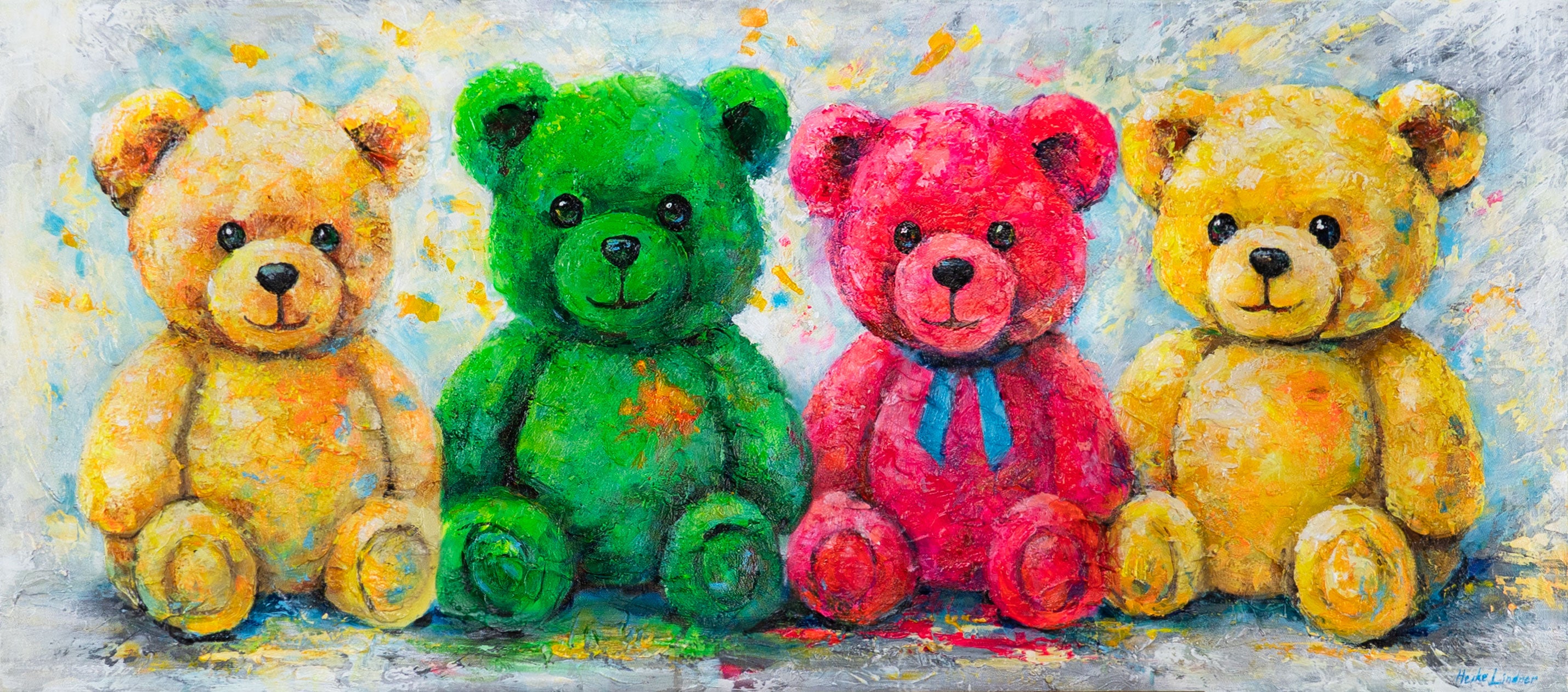„Buntes Glück“ ist ein handgemaltes Acrylbild auf Leinwand mit vier farbenfrohen Teddybären in Gelb, Grün, Pink und Orange. Die plastische Struktur, leuchtenden Farben und liebevollen Details machen dieses Werk zu einer fröhlichen Bereicherung für jedes Zuhause.