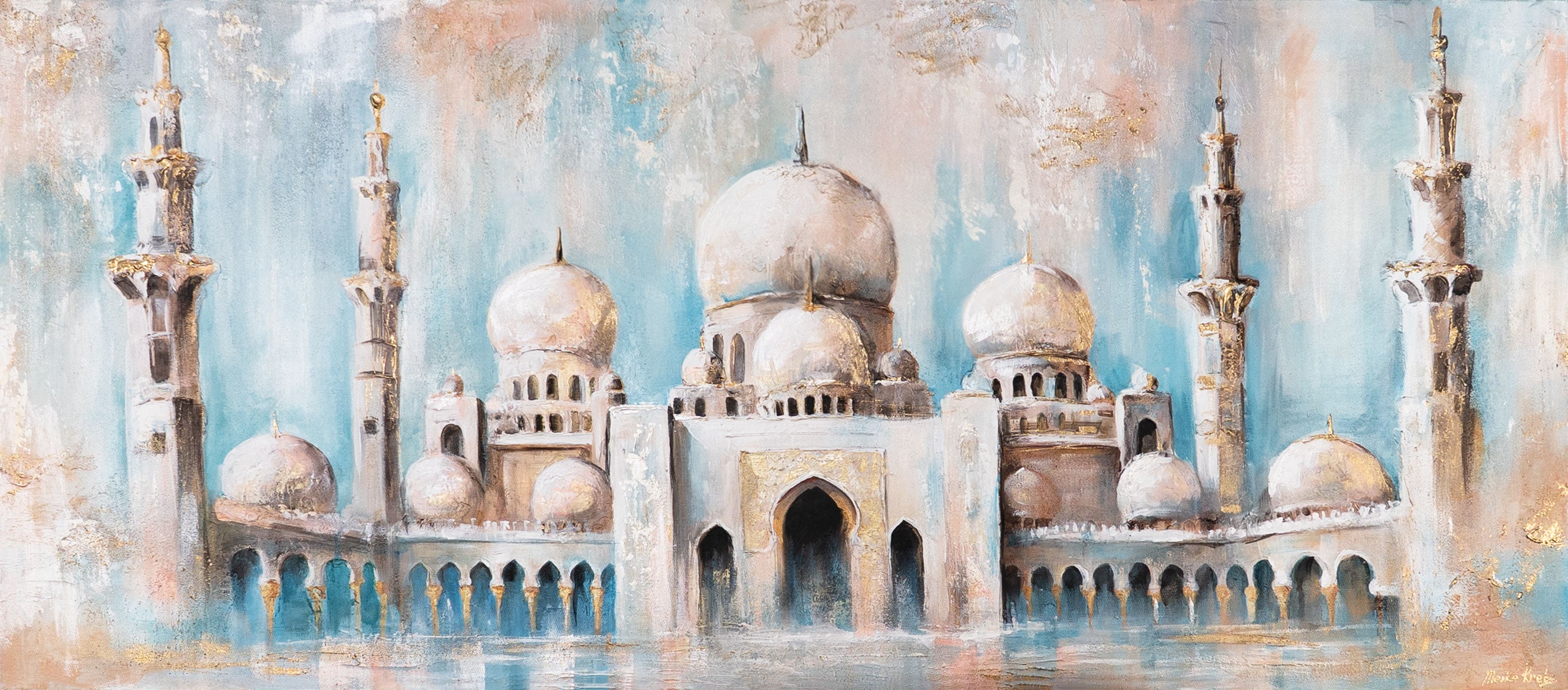 „Pfad des Lichts“ ist ein handgemaltes Acrylbild auf Leinwand, das eine imposante orientalische Architektur in zarten Gold- und Türkistönen zeigt. Die strukturierte Oberfläche lässt Kuppeln, Minarette und Bögen plastisch wirken – wie ein sonnendurchflutetes Fantasiemotiv aus 1001 Nacht.
