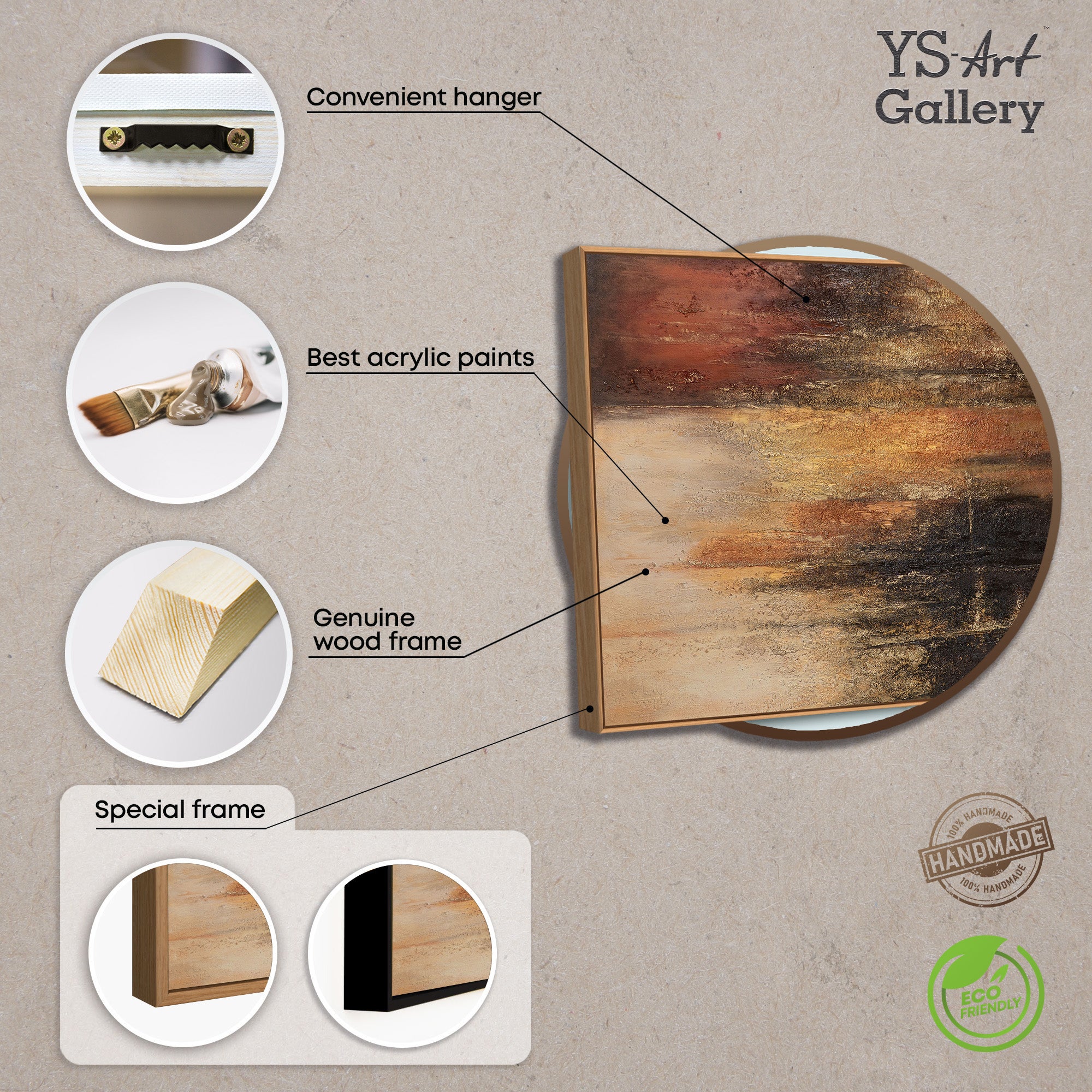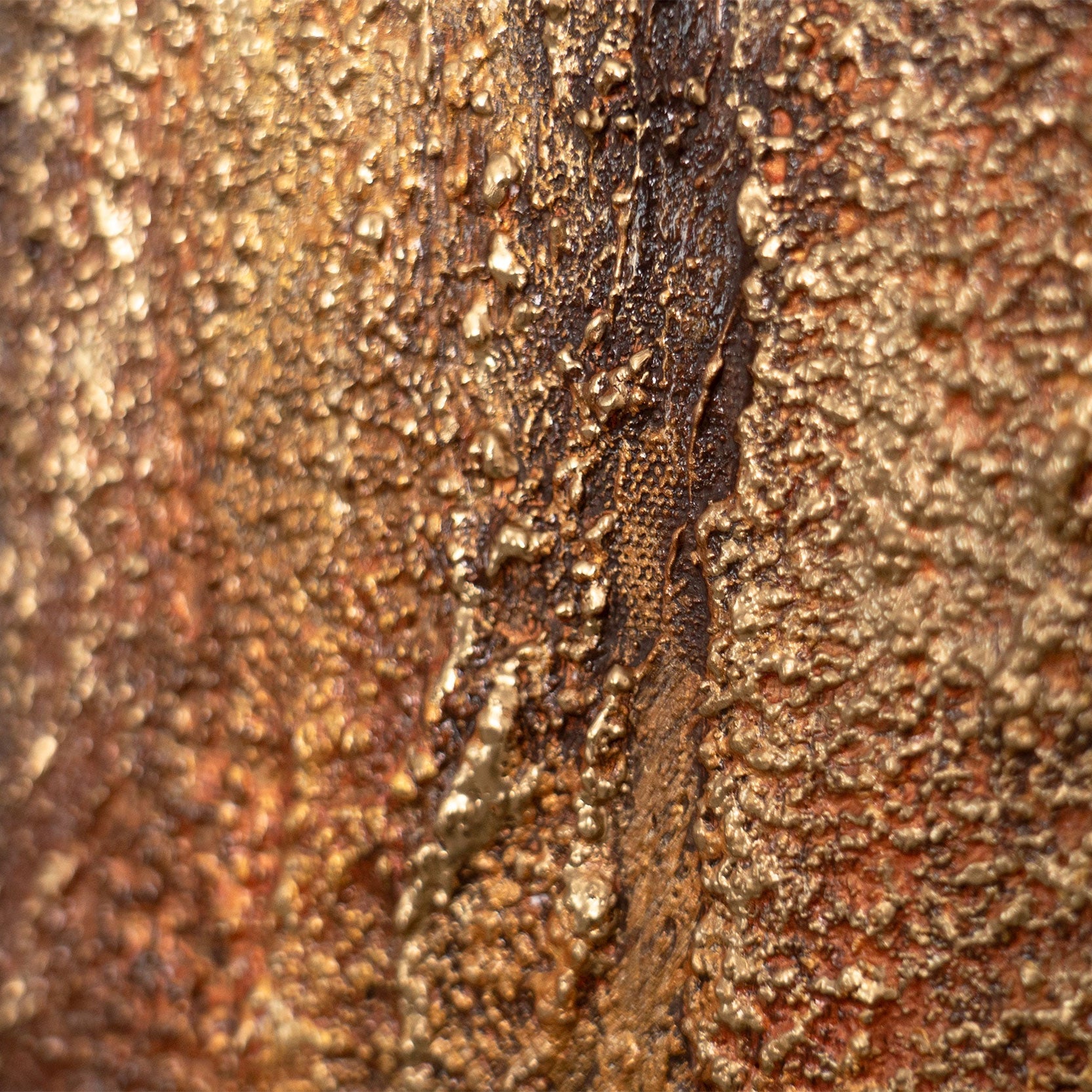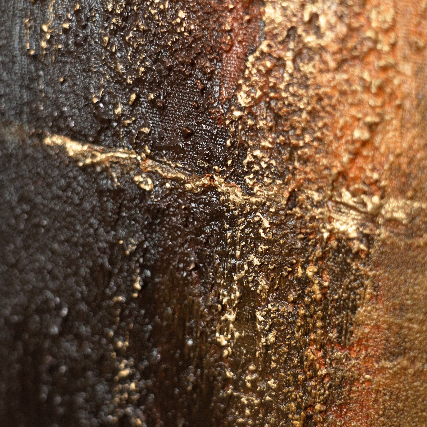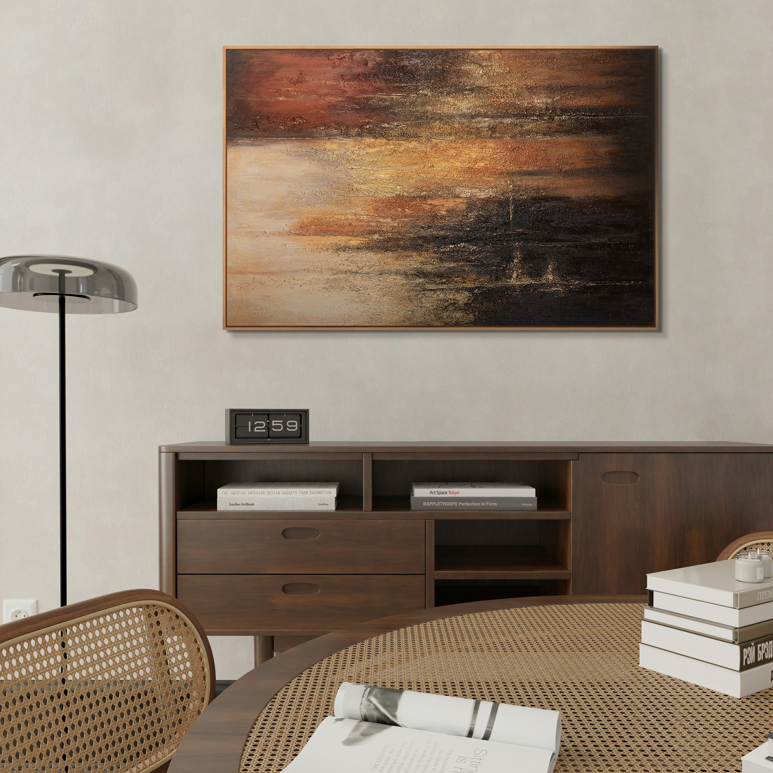 Das handgemalte Leinwandbild wird im Rahmen präsentiert und eignet sich als moderne Wanddekoration für Wohnzimmer, Büro oder repräsentative Räume. Die warme, dunkle Farbpalette unterstreicht hochwertige Interieurs und schafft eine Atmosphäre von Beständigkeit und Ruhe.
