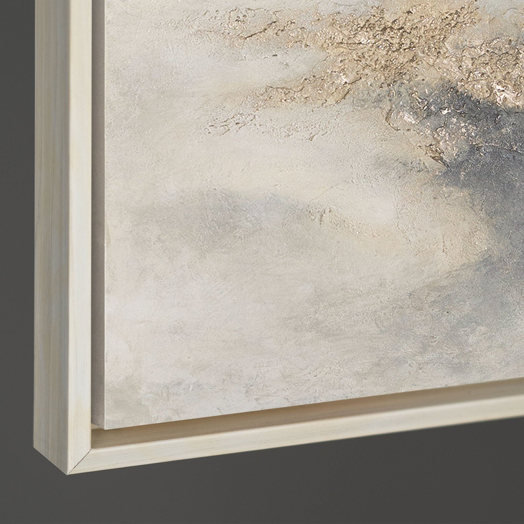 „Wolkenmelodie“ verbindet weiche, wolkenartige Farbverläufe in Beige, Grau und Creme mit kraftvollen, goldenen Strukturbereichen. Die reliefartigen Akzente wirken wie natürlicher Fels oder mineralische Schichten, die sich aus der ruhigen Nebelatmosphäre heraus formen. Die Übergänge aus feinen Nebelschwaden und markanten Strukturen verleihen dem Gemälde Tiefe, Leuchtkraft und eine dynamische, dennoch sanfte Präsenz im Raum.