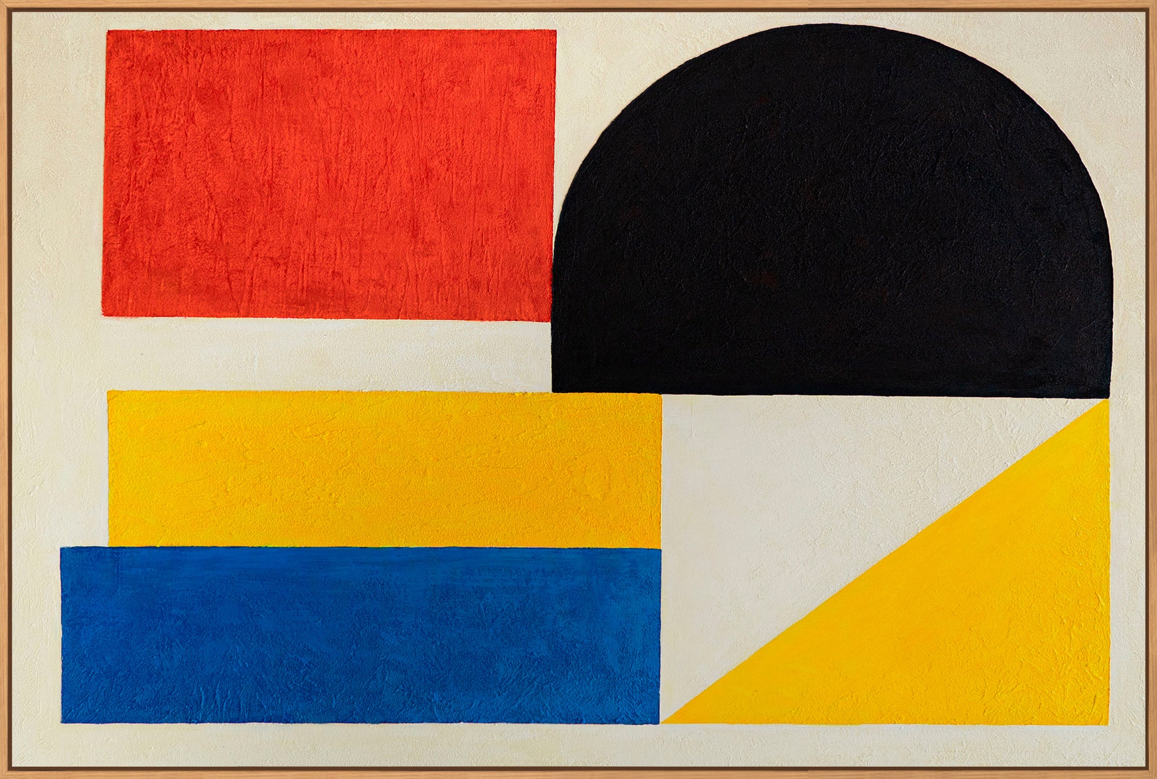 Dieses abstrakte Gemälde lebt von klaren Farbflächen und starken Kontrasten. Intensive Rot-, Gelb- und Blautöne treffen auf tiefes Schwarz und ruhige helle Flächen. Die geometrische Komposition wirkt ausgewogen und kraftvoll zugleich, während die strukturierte Acryloberfläche den handgemalten Charakter deutlich unterstreicht.
