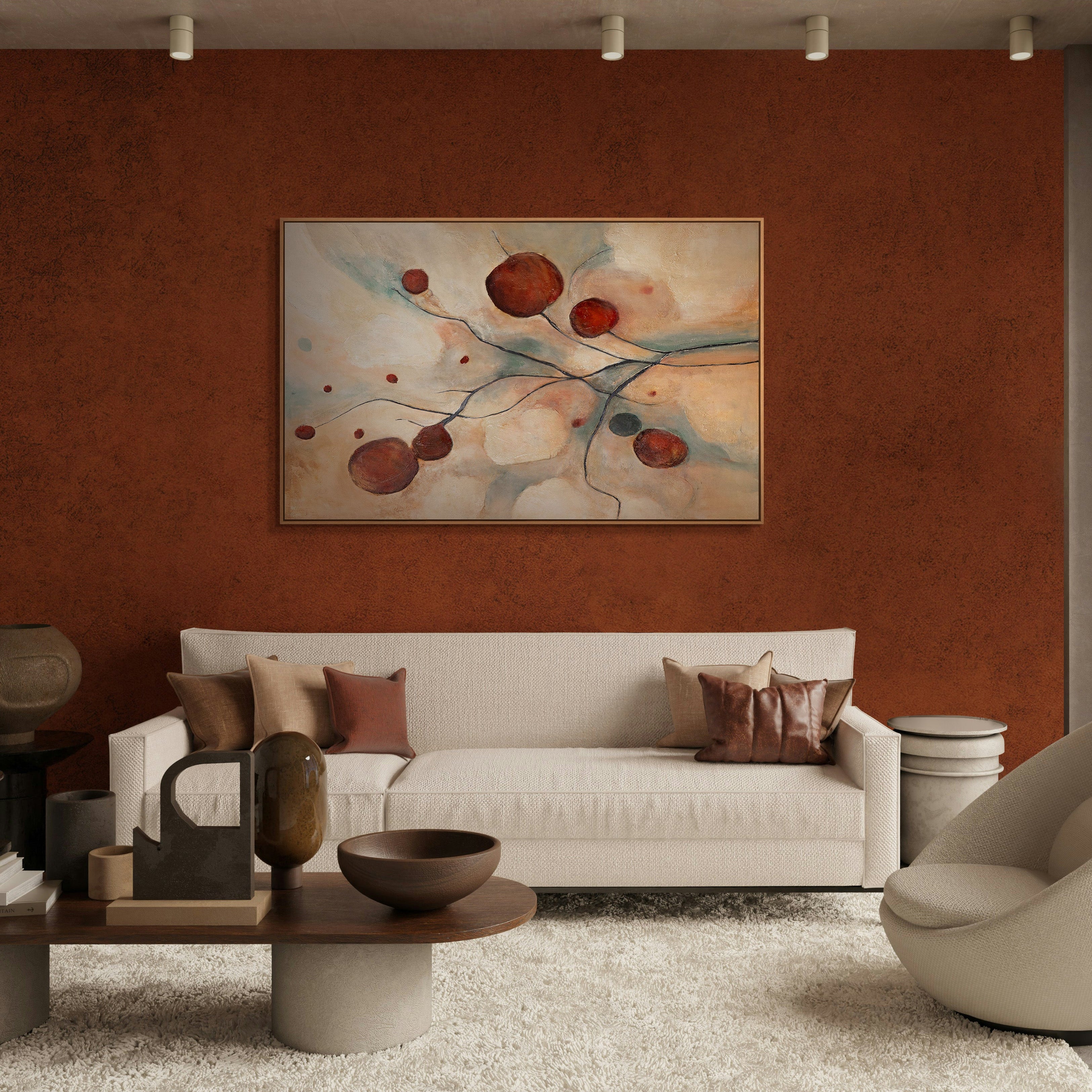 Abstraktes Leinwandbild „Scharlachrote Sternbilder“ in warmen Naturtönen mit Rahmen