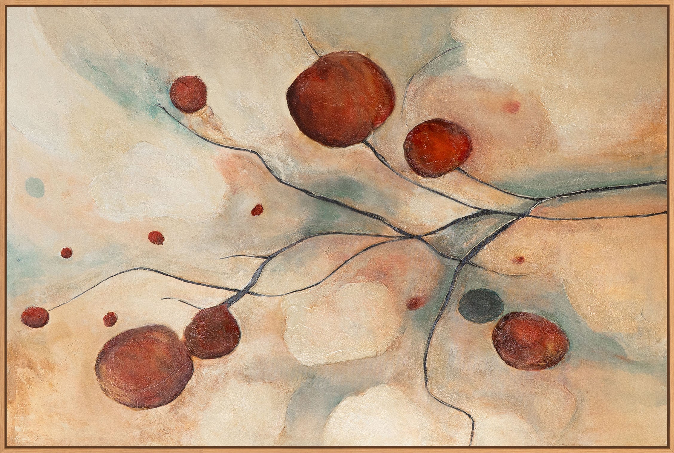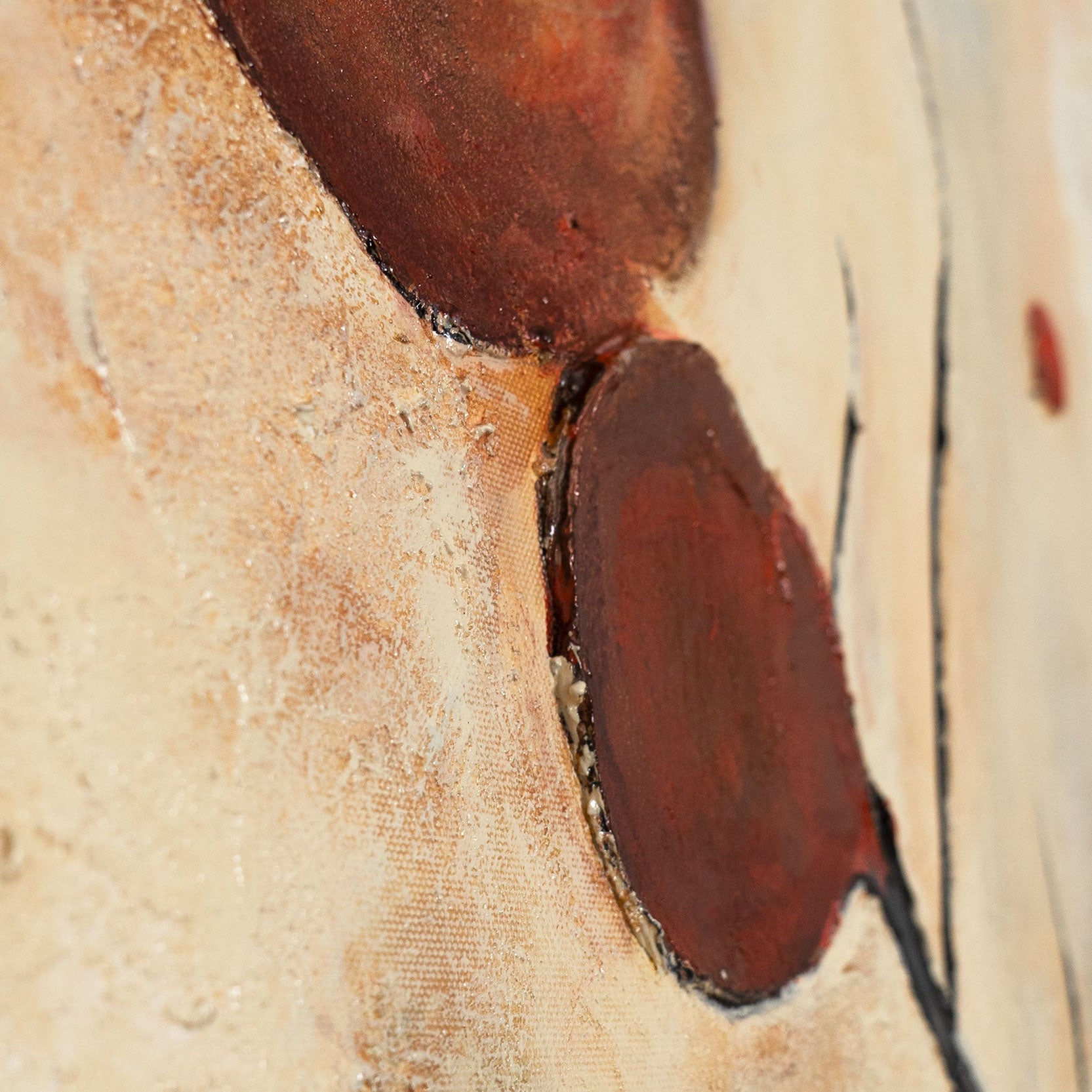 Dieses handgemalte abstrakte Wandbild verbindet sanfte Naturtöne mit ausdrucksstarken scharlachroten Akzenten. Die schwebenden Formen und feinen Linien erinnern an Sternbilder und verleihen dem Gemälde eine ruhige, harmonische Bewegung. Die strukturierte Oberfläche erzeugt Tiefe und macht das Bild lebendig, ohne aufdringlich zu wirken.
