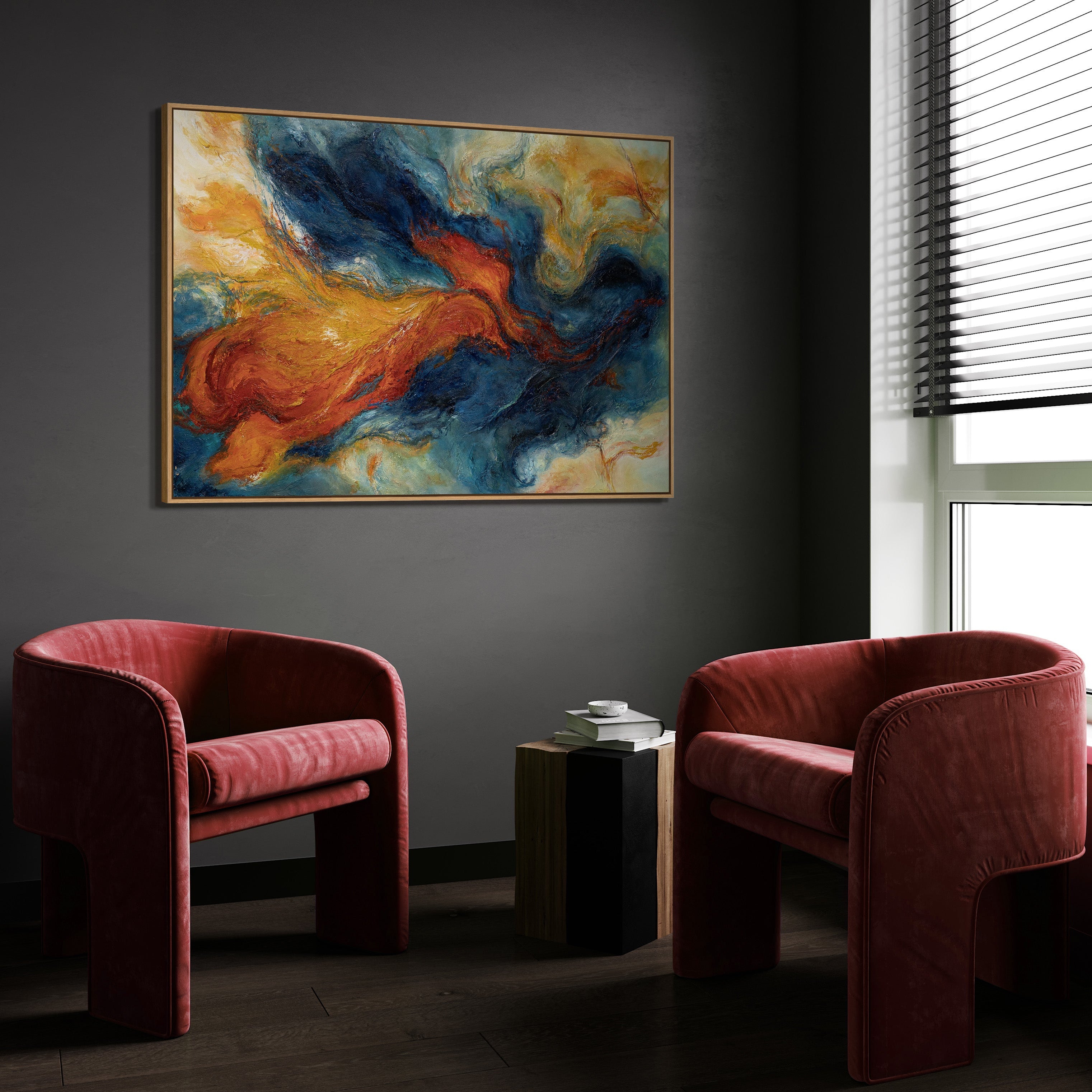 Expressives Acrylbild in Blau Rot – Abstrakte Wandkunst mit Rahmen „Verschmelzung der Energien“
