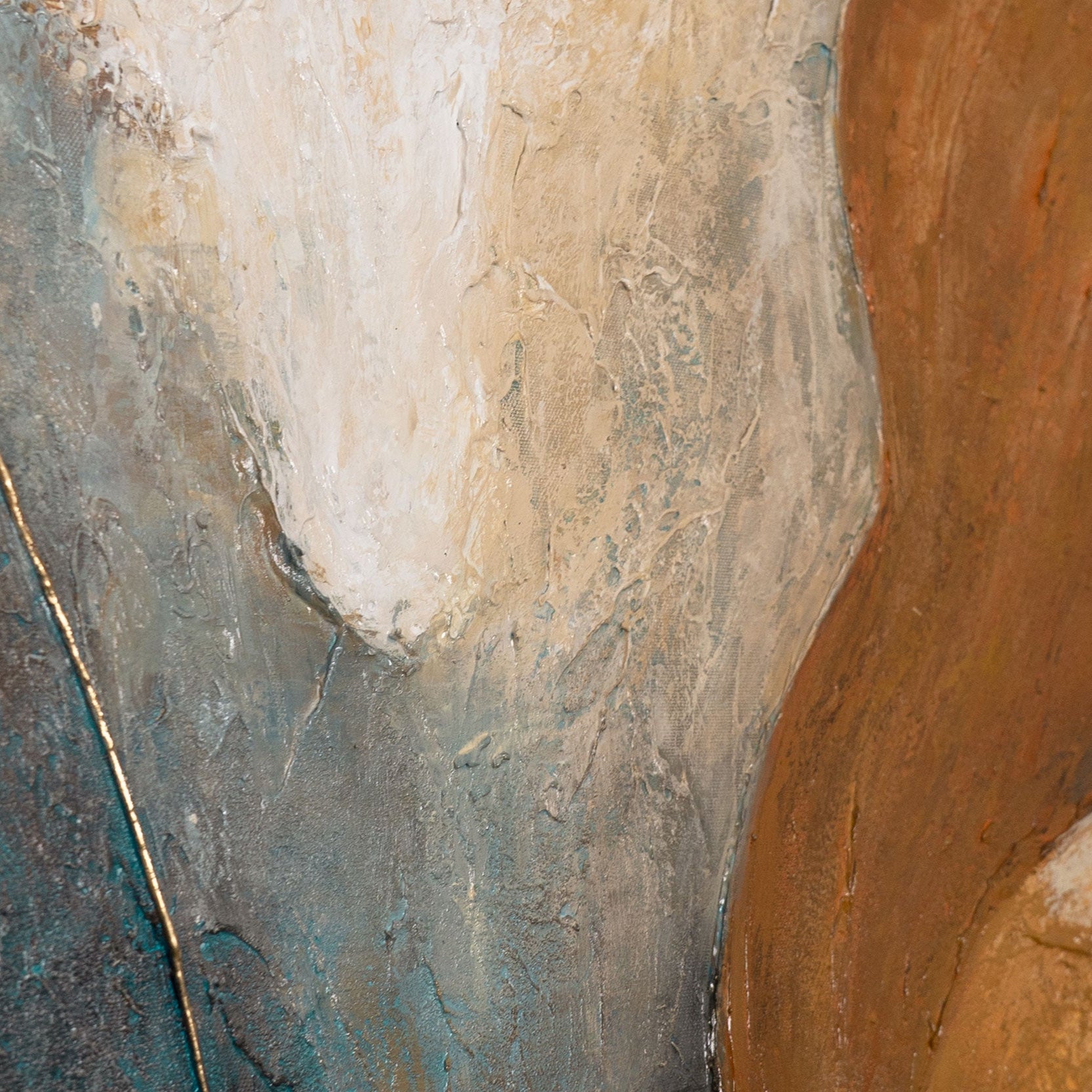 „Wind und Gold“ ist ein faszinierendes Acrylgemälde, das durch seine fließenden Formen und die kontrastreiche Farbpalette begeistert. Warme Brauntöne treffen auf tiefe Blauschattierungen, während feine Goldakzente Bewegung und Eleganz in die Komposition bringen. Die strukturierte Oberfläche verleiht dem Werk Tiefe und Lebendigkeit, sodass es zu einem besonderen Blickfang wird.