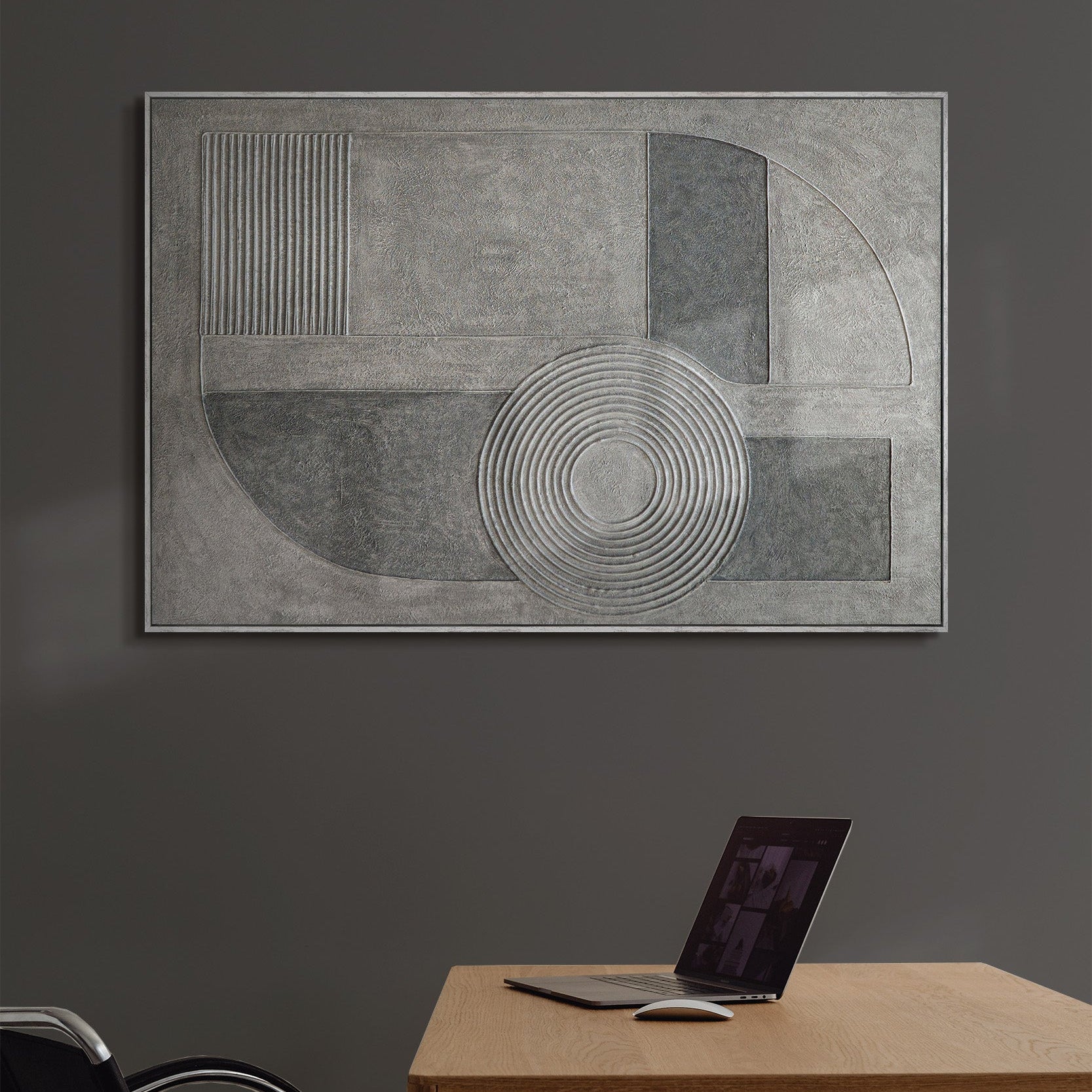 Das abstrakte Gemälde „Grauer Akkord“ entfaltet seine Wirkung durch ruhige geometrische Formen, konzentrische Kreise und eine fein strukturierte Oberfläche. Verschiedene Grautöne verbinden sich zu einer harmonischen Komposition, die Tiefe und Ausgewogenheit ausstrahlt, ohne visuell zu dominieren. Die reliefartige Acrylmalerei erzeugt ein spannendes Wechselspiel aus Licht, Schatten und Materialität.