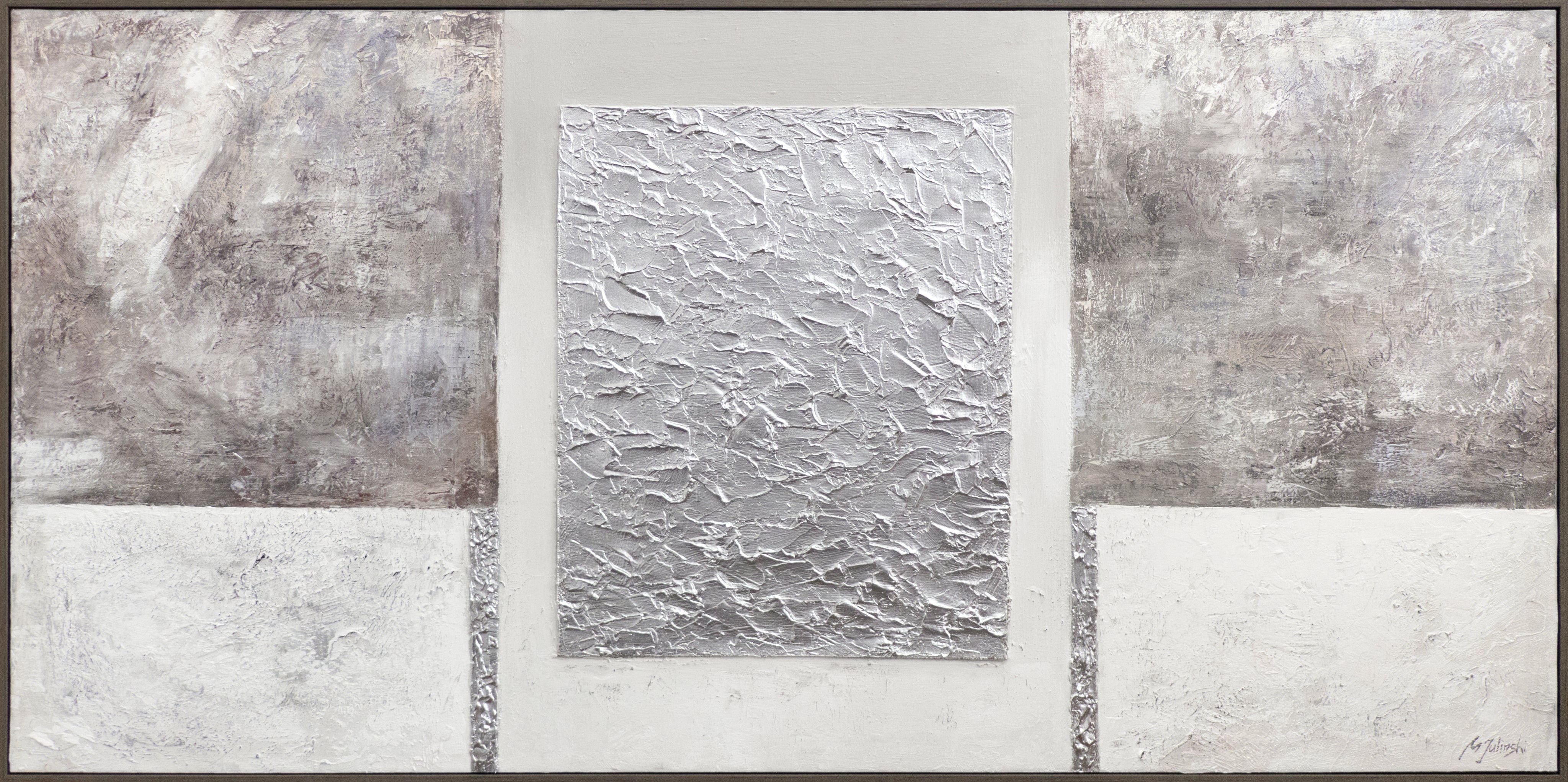 • Detail des zentralen silbernen Rechtecks mit Relieftextur
