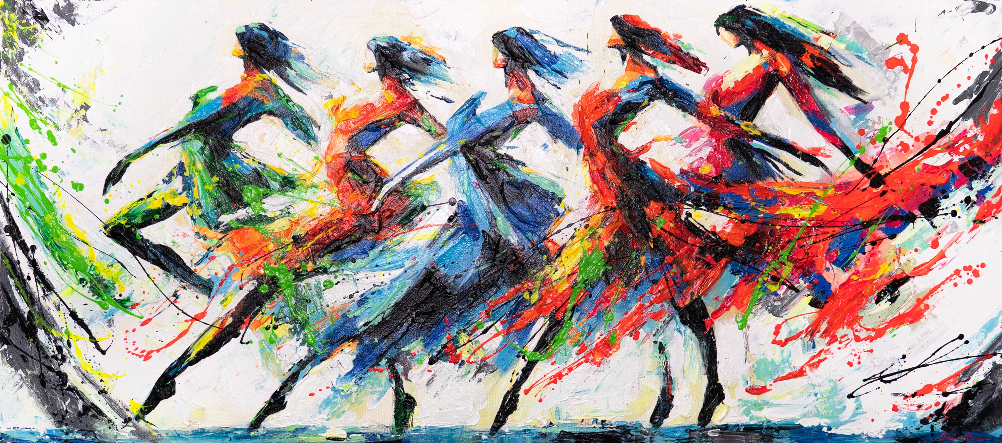 Dieses kunstvolle Acrylgemälde fängt die Eleganz und Lebendigkeit tanzender Frauen in explosiven Farbtönen ein. Die abstrakten Pinselstriche in Rot, Grün, Blau und Gelb verleihen dem Werk eine dynamische Bewegung und eine starke emotionale Ausdruckskraft.