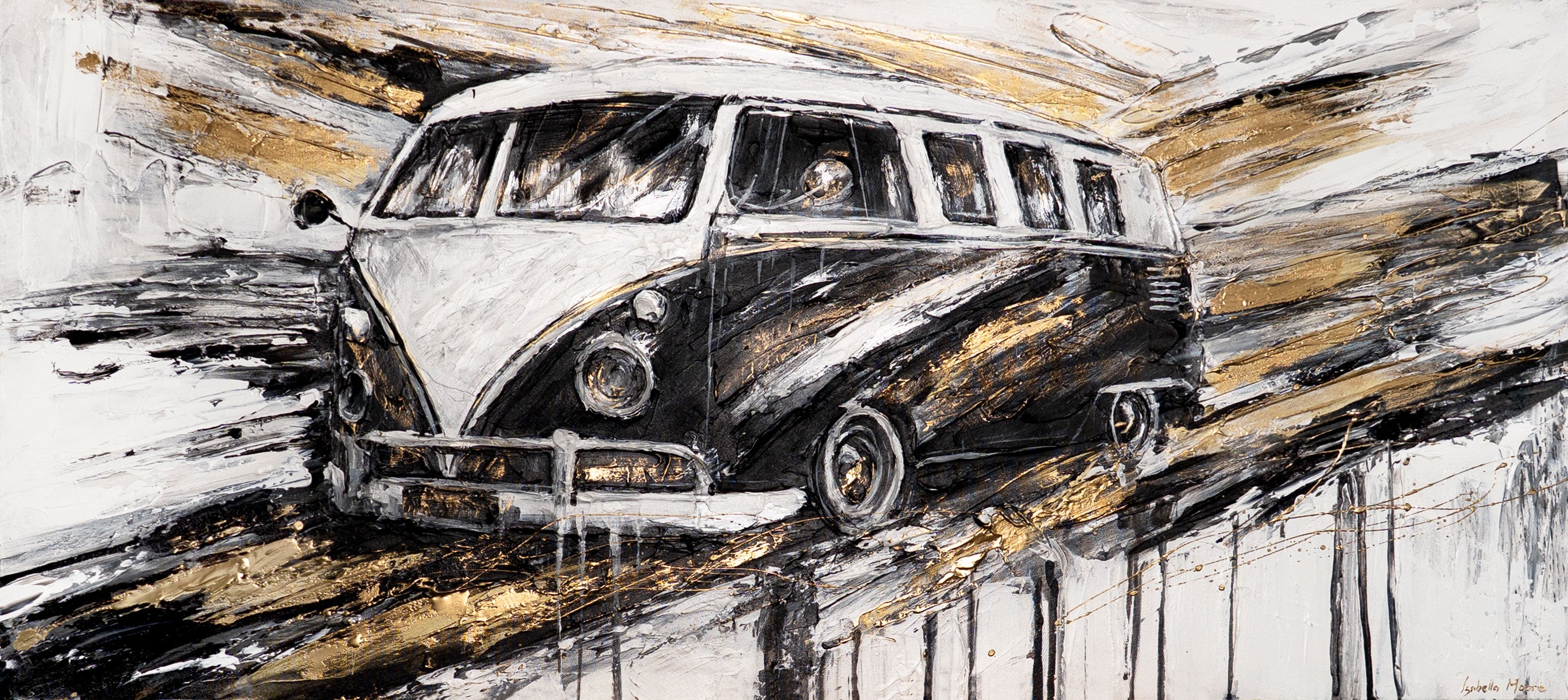 „Straße der Zeit“ ist ein dynamisches, handgemaltes Acrylbild, das ein Retro-Fahrzeug in Bewegung darstellt. Die starke Textur und die kontrastreiche Farbpalette aus Schwarz, Weiß und Gold vermitteln Energie und Nostalgie zugleich. Dieses Kunstwerk verbindet modernes Design mit klassischem Flair.