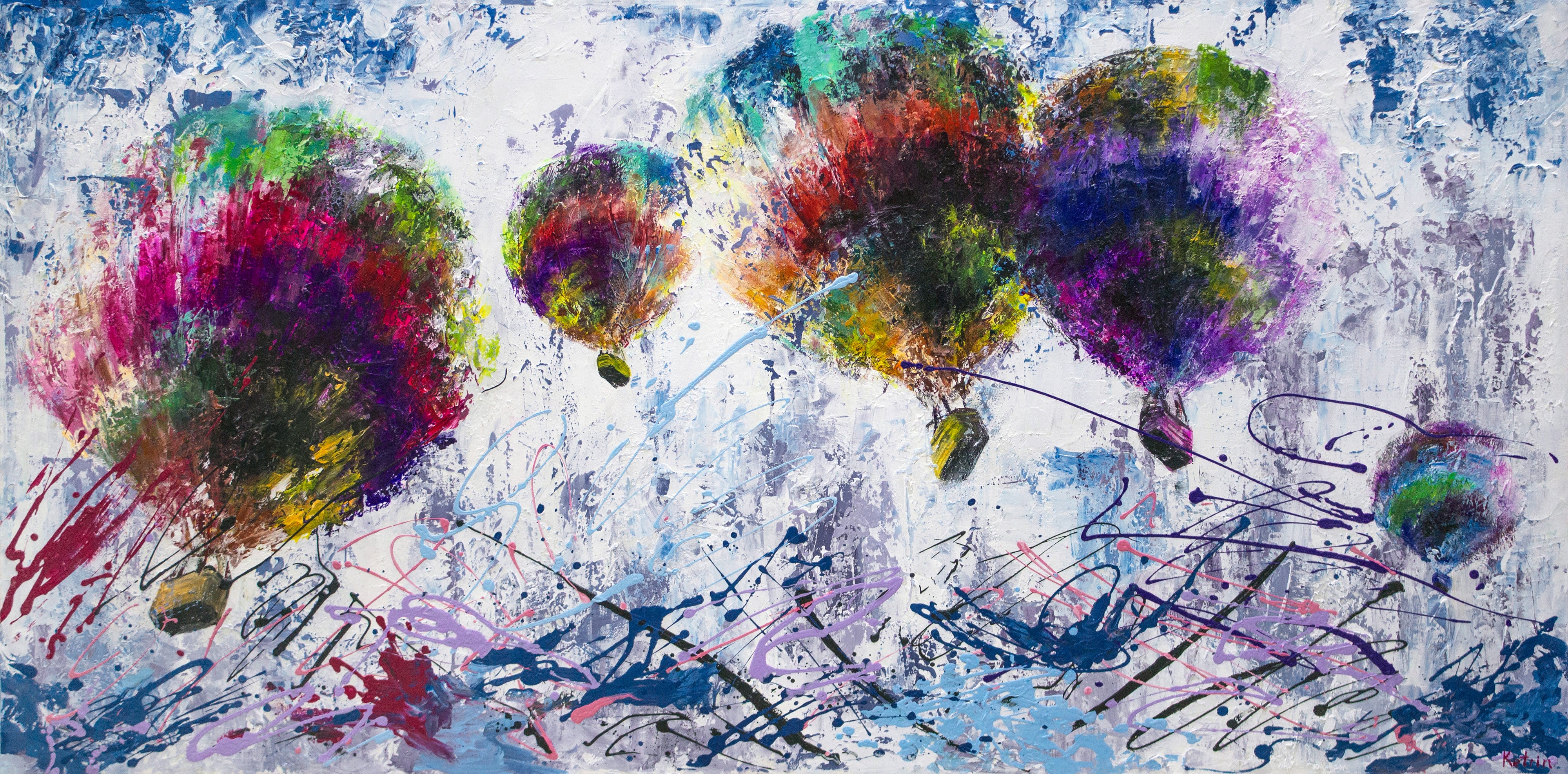 Das Acrylbild „Freiflug“ zeigt eine lebendige Komposition bunter Heißluftballons, die mit dynamischen, expressiven Pinselstrichen in Acrylfarben auf Leinwand festgehalten sind. Die kräftigen Farben und die strukturierte Oberfläche erzeugen eine spielerische und gleichzeitig moderne Atmosphäre, die dem Bild eine besondere Lebendigkeit verleiht. Dieses Kunstwerk bringt frischen Wind und Energie in jeden Raum und erzählt die Geschichte von Freiheit und Abenteuer.