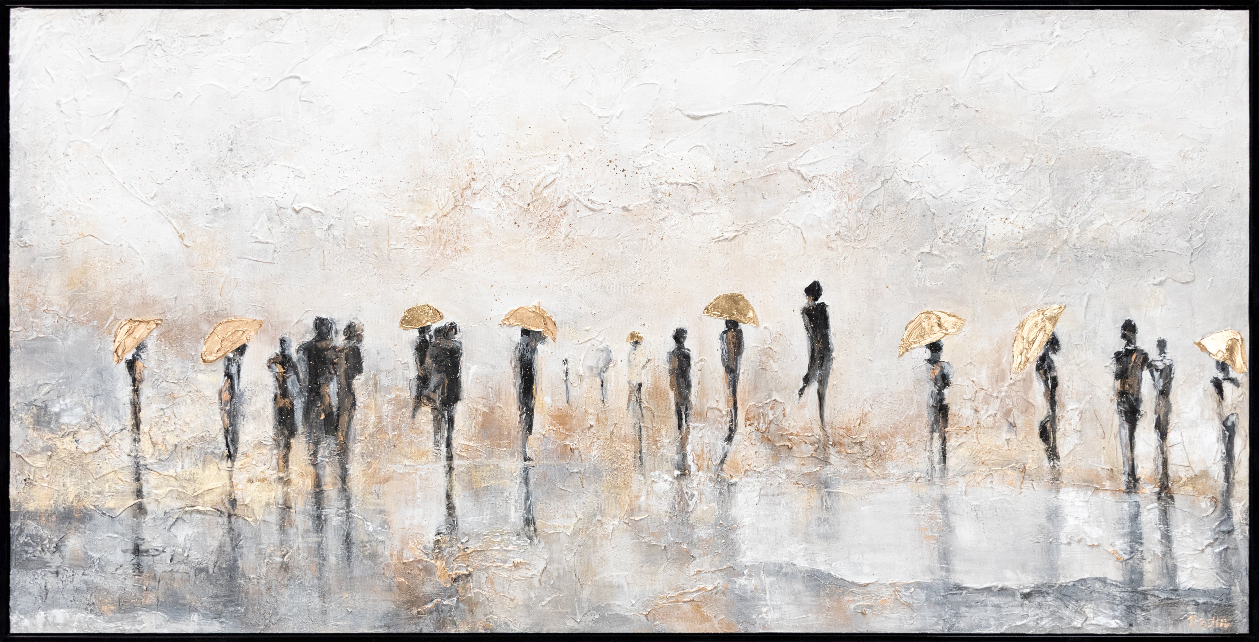 Handgemalte Acrylmalerei mit Rahmen – Abstrakte Menschen mit goldenen Regenschirmen
