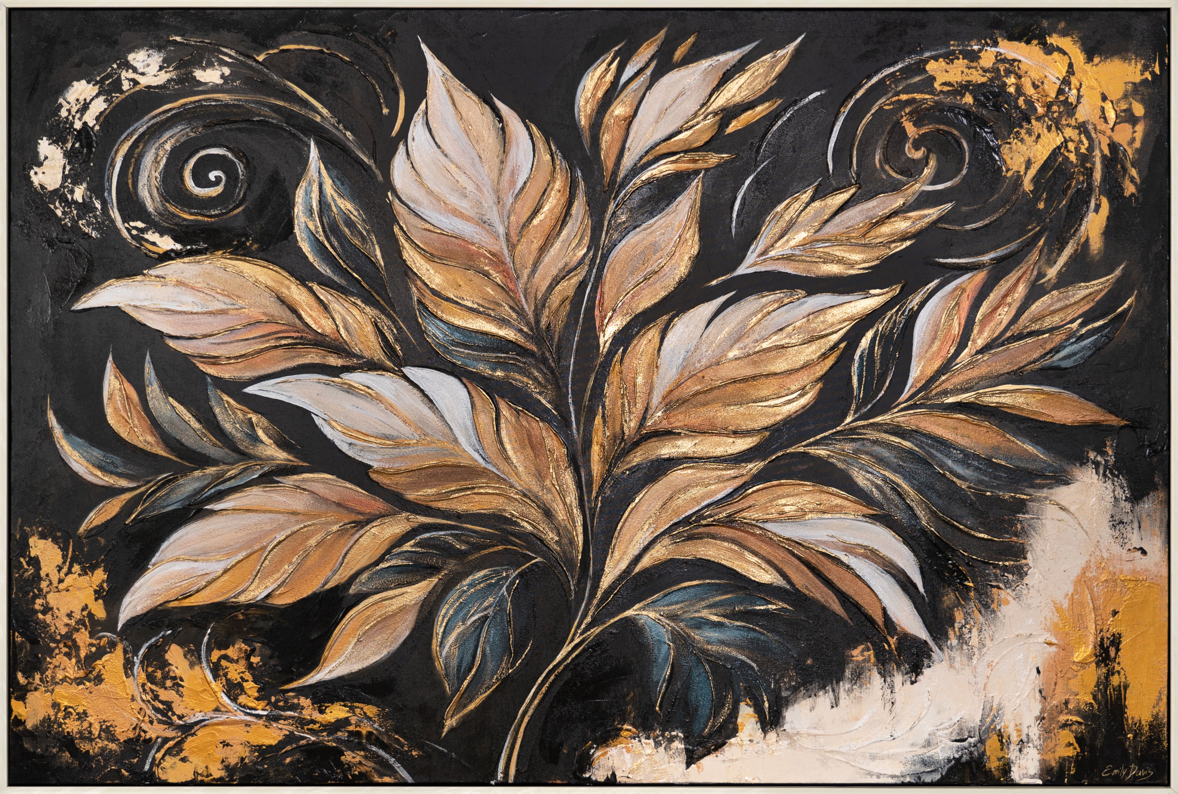 Das handgemalte Leinwandbild „Goldene Blätter“ fasziniert durch eine moderne, abstrakte Komposition aus goldglänzenden Blättern auf tiefschwarzem Hintergrund. Die kunstvolle Strukturierung der Oberfläche verleiht dem Bild eine lebendige, dreidimensionale Tiefe, die jeden Raum mit edlem Flair bereichert.