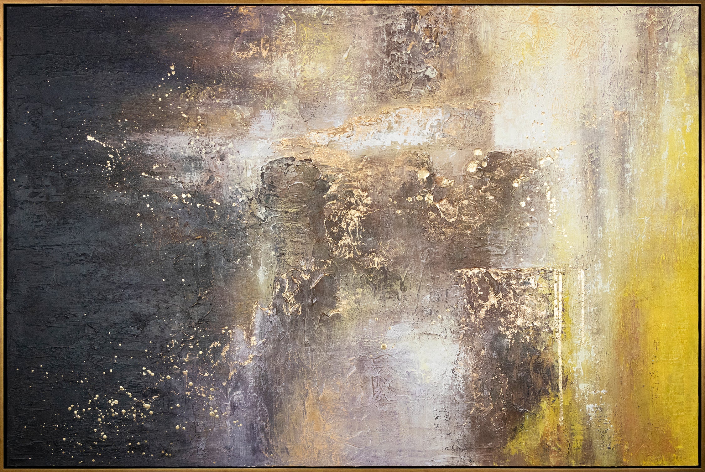 Dieses beeindruckende abstrakte Gemälde auf Leinwand vereint moderne Kunst mit goldenen und dunklen Akzenten und bringt Tiefe und Eleganz in jedes Raumdesign.