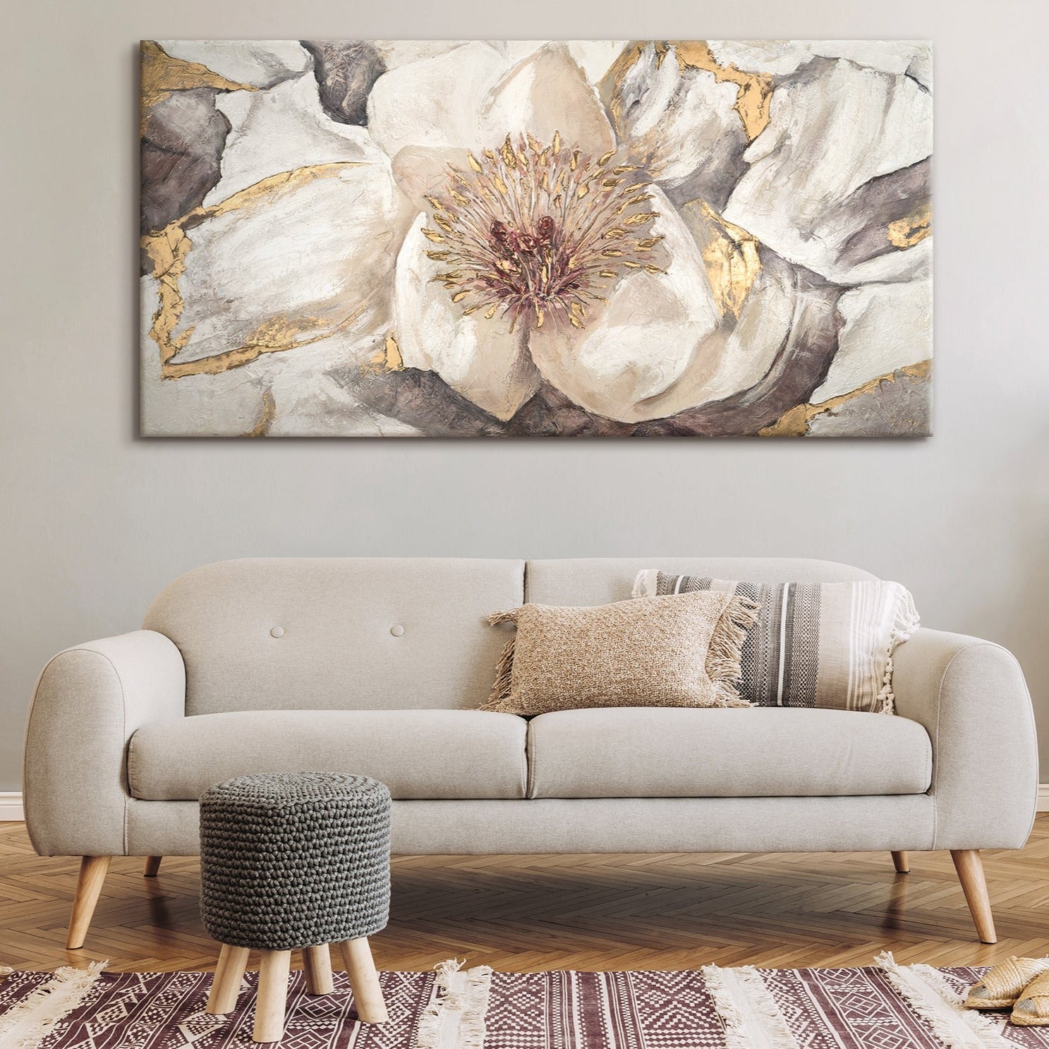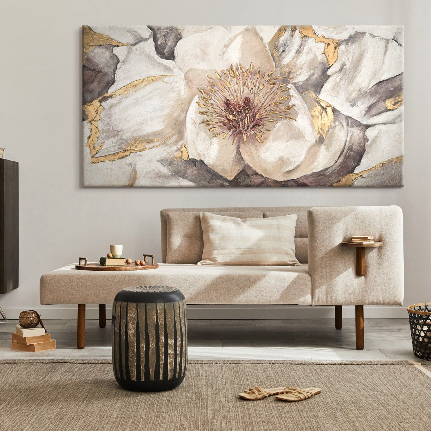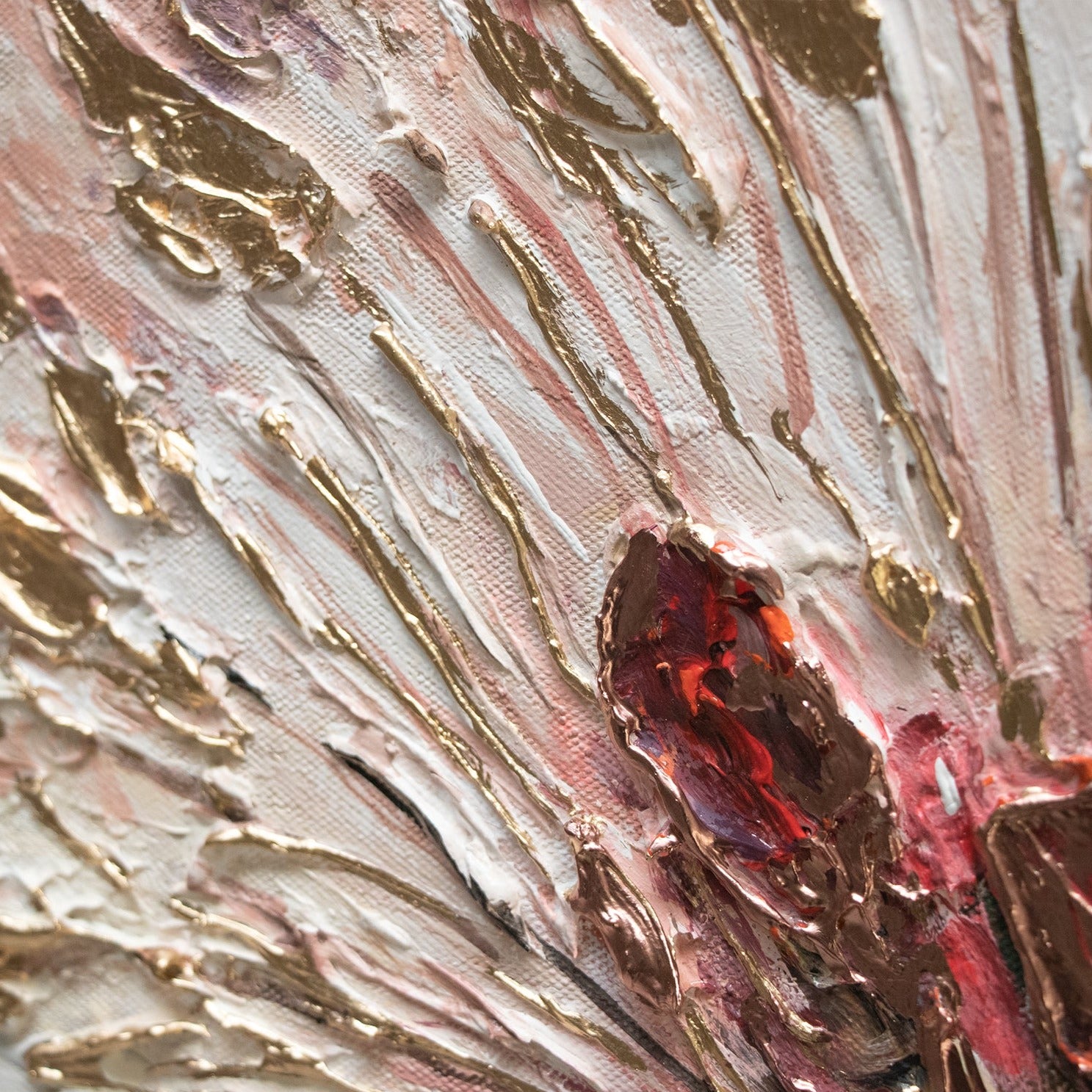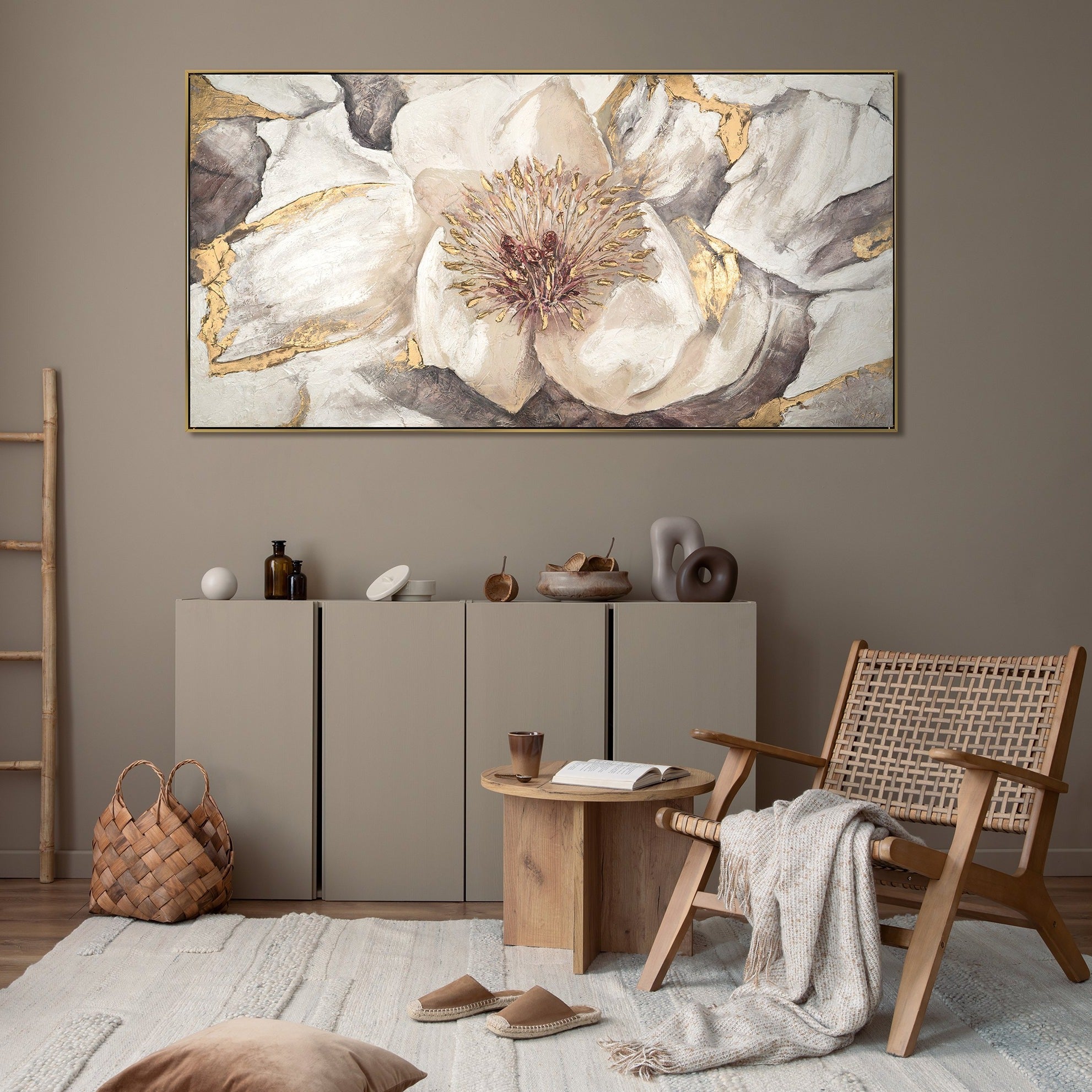 Erleben Sie die exquisite Kunstfertigkeit dieses handgemalten Blumen-Bildes auf Leinwand. Die harmonischen Farben und die goldenen Details bringen eine elegante und beruhigende Atmosphäre in Ihr Zuhause. Jedes Detail dieses Kunstwerks ist 100% handgefertigt und macht es zu einem einzigartigen Unikat. Genießen Sie die kostenlose Lieferung direkt zu Ihnen nach Hause.