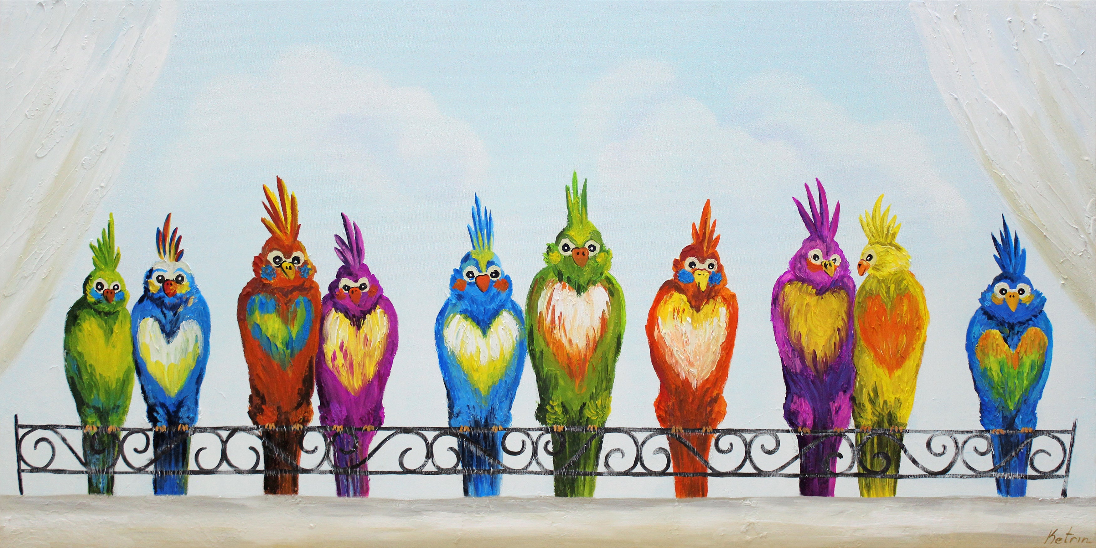 Das Leinwandbild „Lustige Vögel“ zeigt eine charmante Reihe bunter Papageien, die lebendig und fröhlich auf einem Geländer sitzen. Mit der Acrylfarbe auf hochwertiger Leinwand handgemalt, bringt dieses Bild Farbe und gute Laune in jeden Raum. Die kräftigen Farben, kombiniert mit der strukturierten Oberfläche, erzeugen eine lebendige und fröhliche Atmosphäre, die besonders gut in Kinderzimmer oder verspielte Wohnbereiche passt.