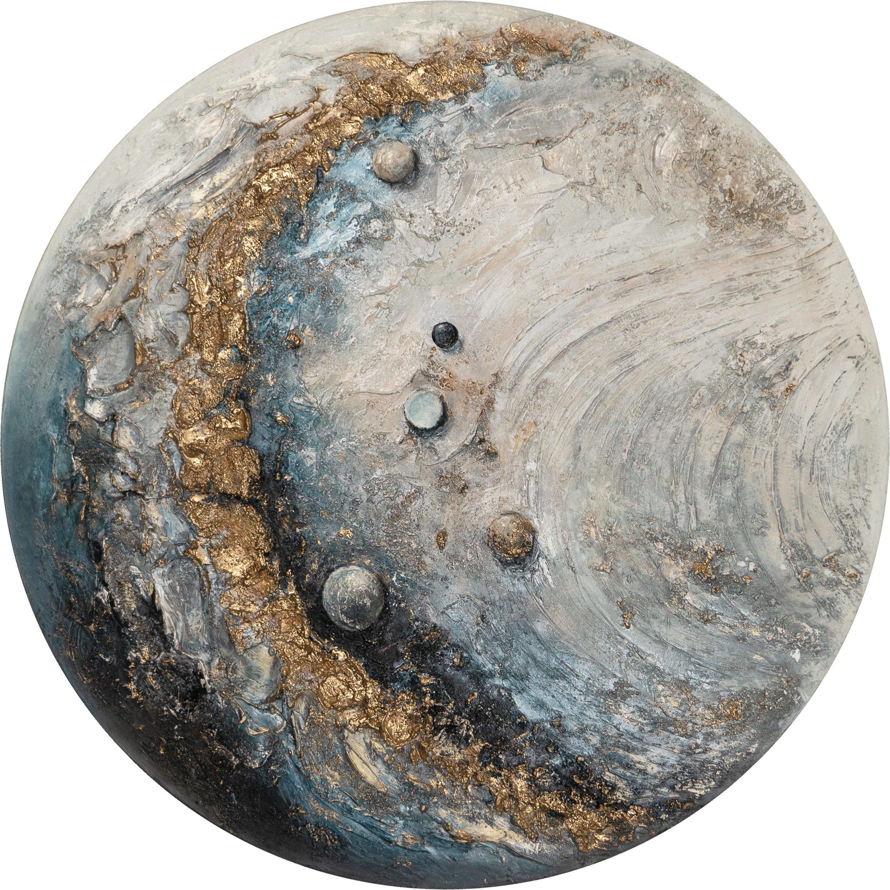 Entdecken Sie die Magie der Goldsphere, eines handbemalten runden Kunstwerks, das im Dunkeln Licht ausstrahlt. Dieses texturierte Meisterwerk kombiniert auf eindrucksvolle Weise Gold-, Weiß- und Brauntöne zu einer von den Planeten inspirierten Ästhetik. Es eignet sich perfekt für Schlafzimmer, Wohnzimmer oder Büros und ist eine zeitlose Ergänzung für jede Einrichtung.