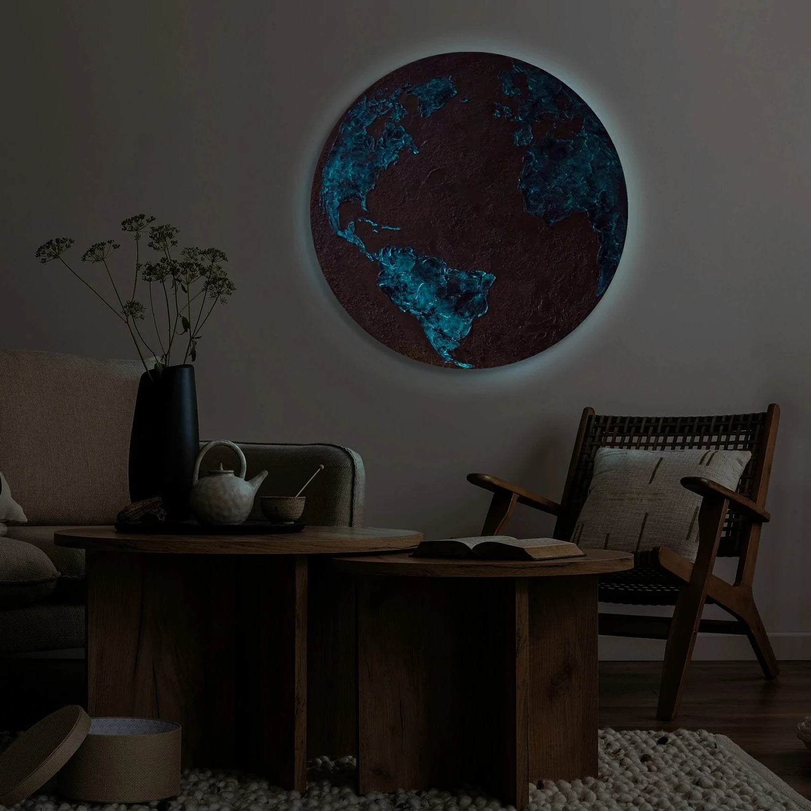 Bereichern Sie Ihr Zuhause oder Büro mit dem eleganten "Silberner Planet" - ein rundes Acryl Gemälde in Form eines Planeten, das in der Dunkelheit dank spezieller Leuchtfarbe strahlt. Diese moderne Kunst besticht durch eine Kombination von silbernen und erdigen Tönen, die eine kühle und zugleich dynamische Atmosphäre schaffen. Das Gemälde ist 100% handgemalt und wird durch einen eleganten Rahmen hervorgehoben.