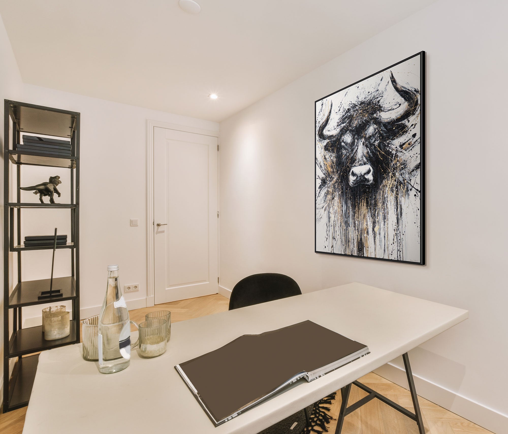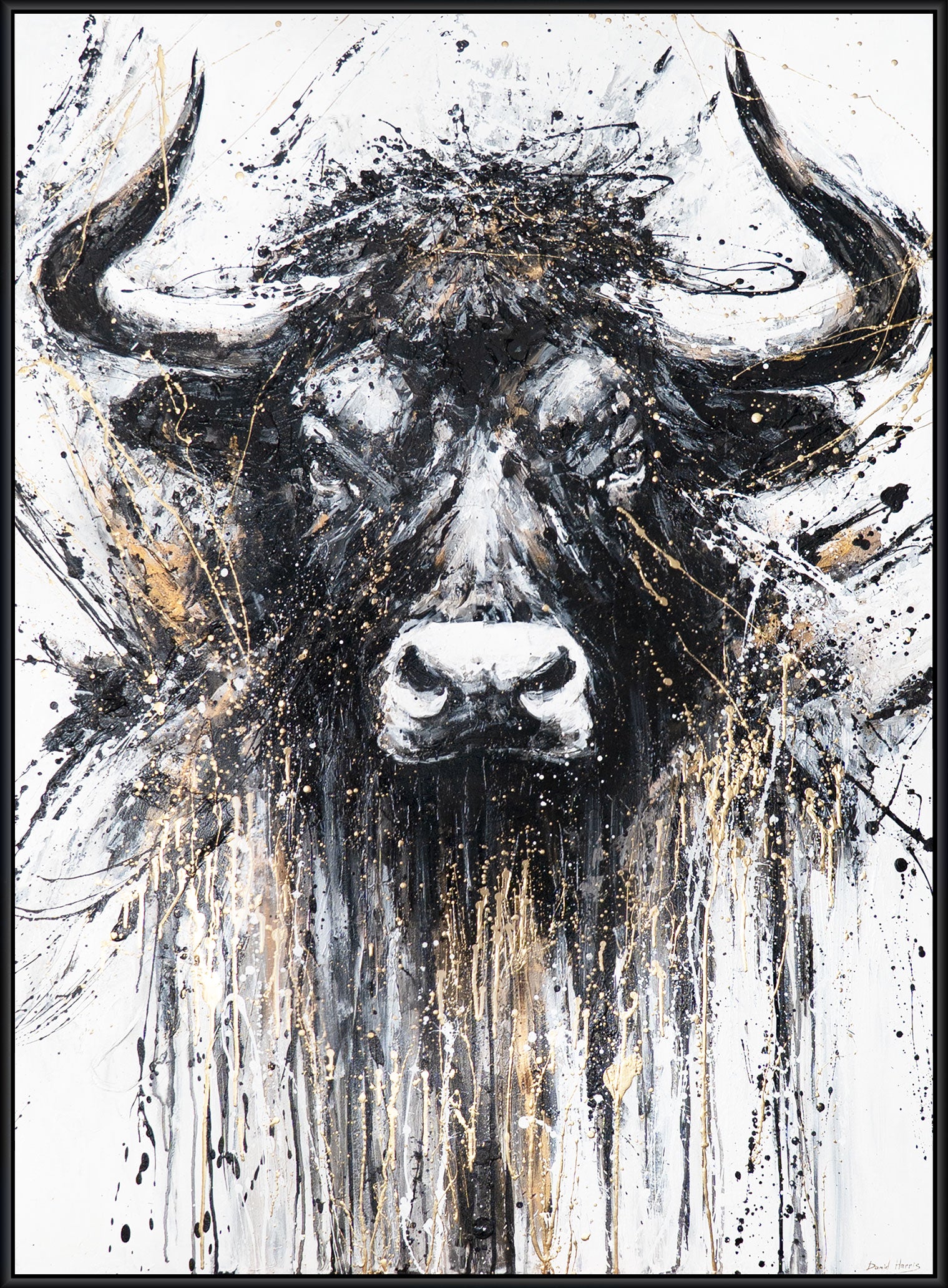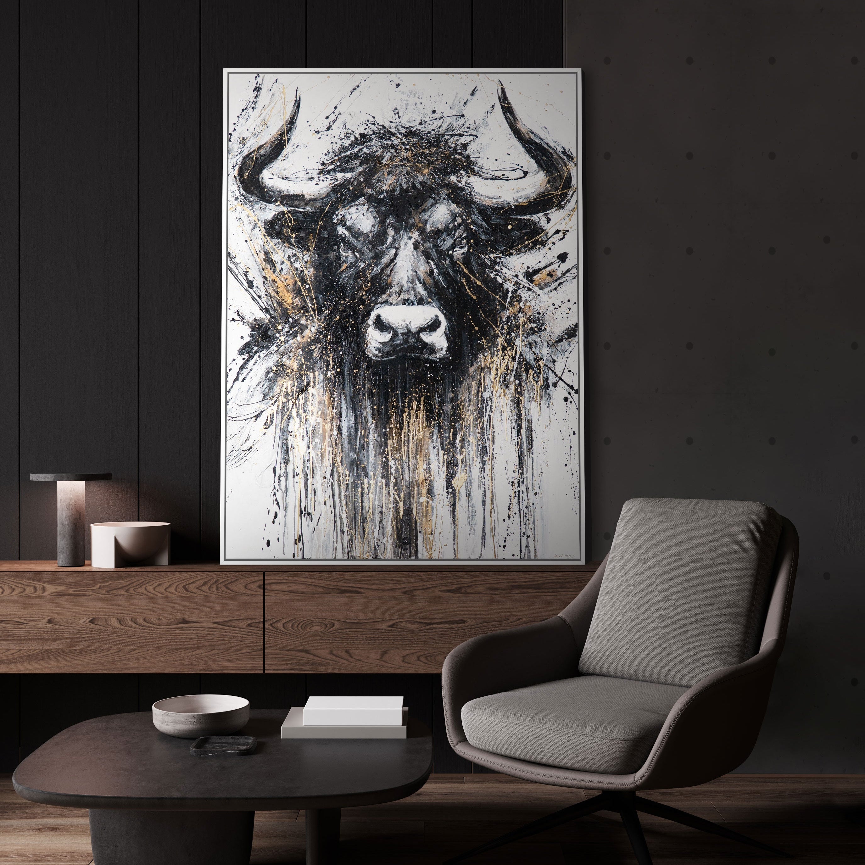 Dieses eindrucksvolle Leinwandbild zeigt einen frontal blickenden Bullen – majestätisch, ruhig und zugleich voller innerer Kraft. In reduzierter Farbpalette aus Schwarz, Weiß und Gold erschafft der Künstler eine dynamische Textur mit energiegeladenen Pinselbewegungen und markanten Details. Goldene Spritzer verleihen dem Werk Eleganz und Spannung, während die ausdrucksstarken Augen des Tiers den Betrachter direkt anziehen.