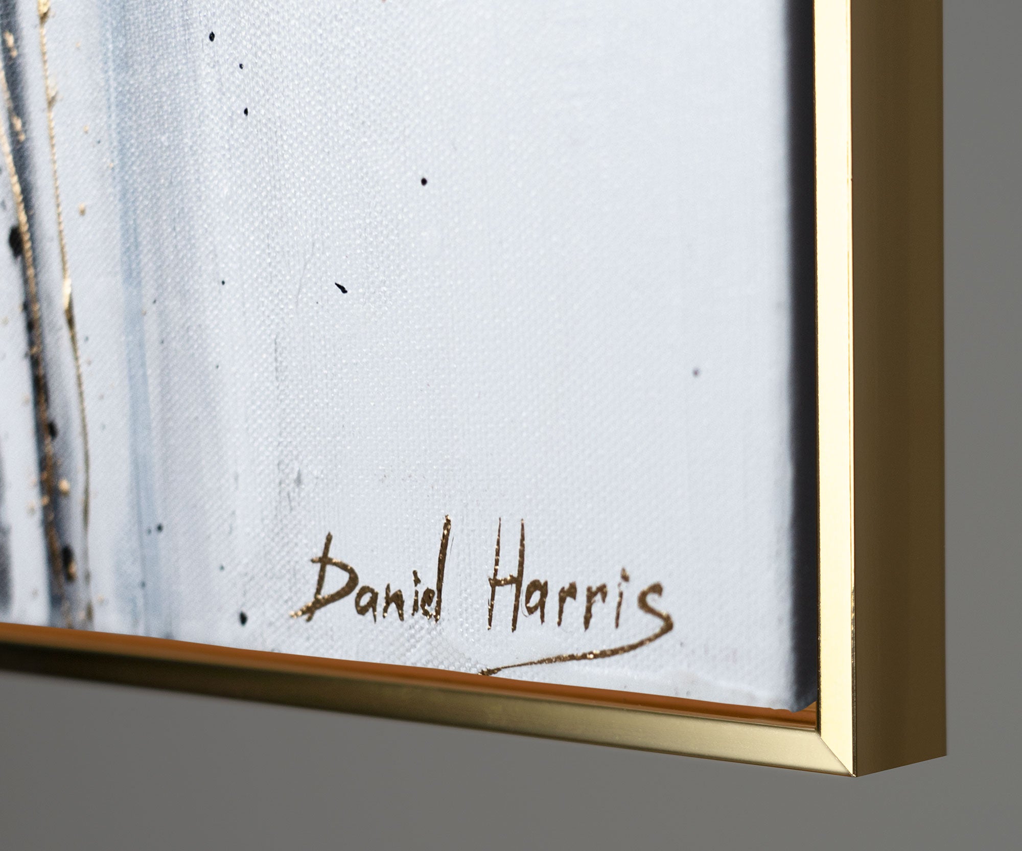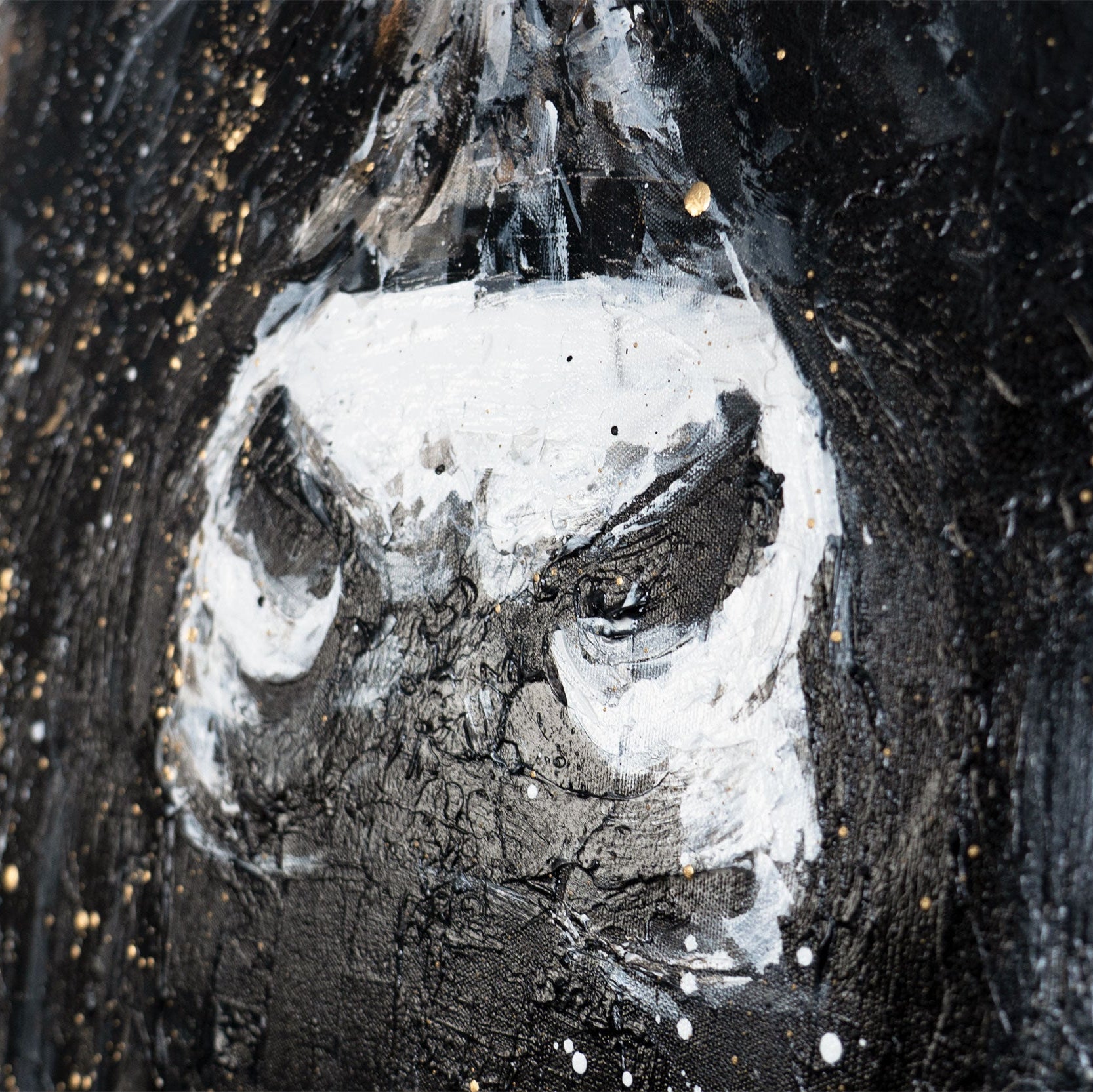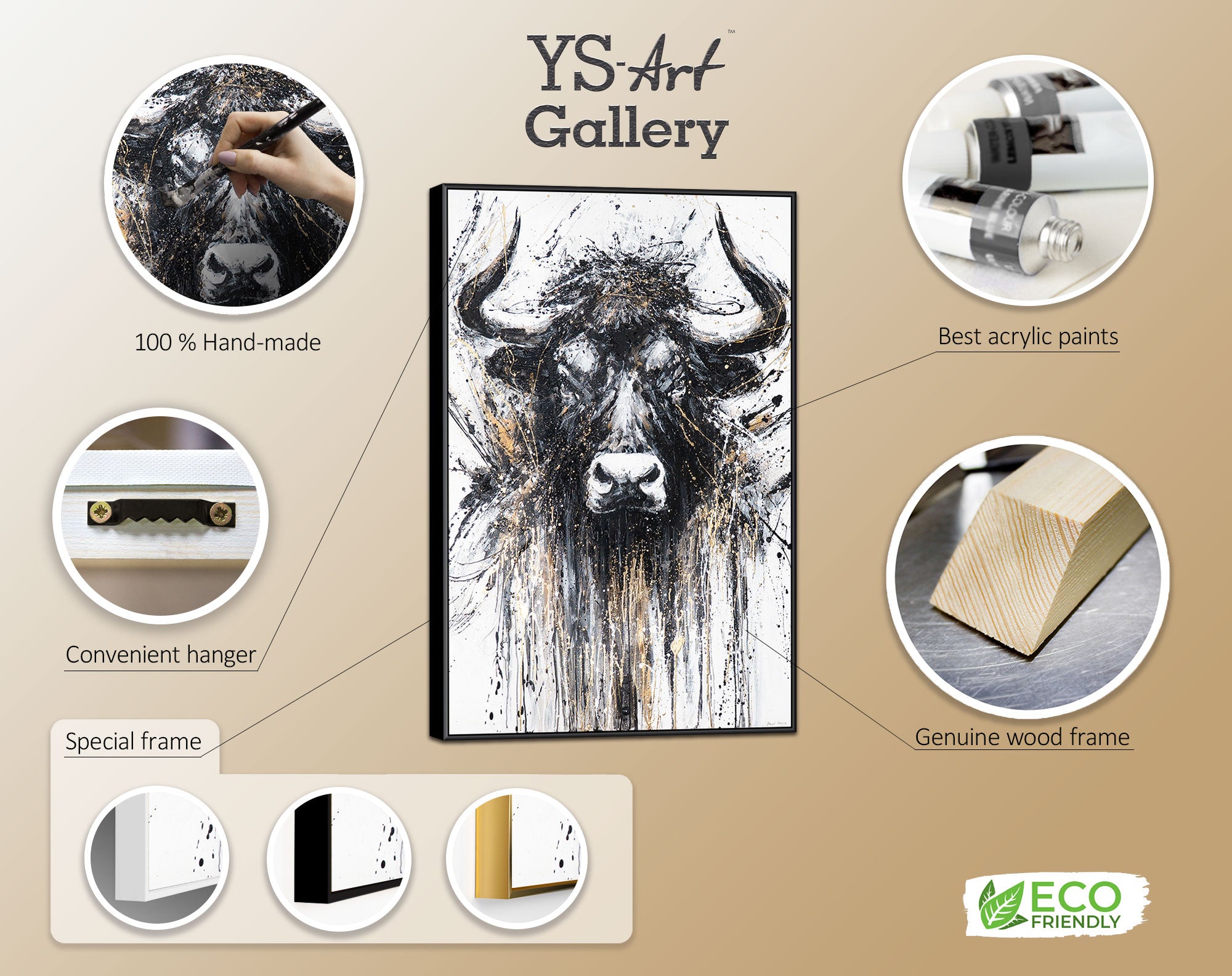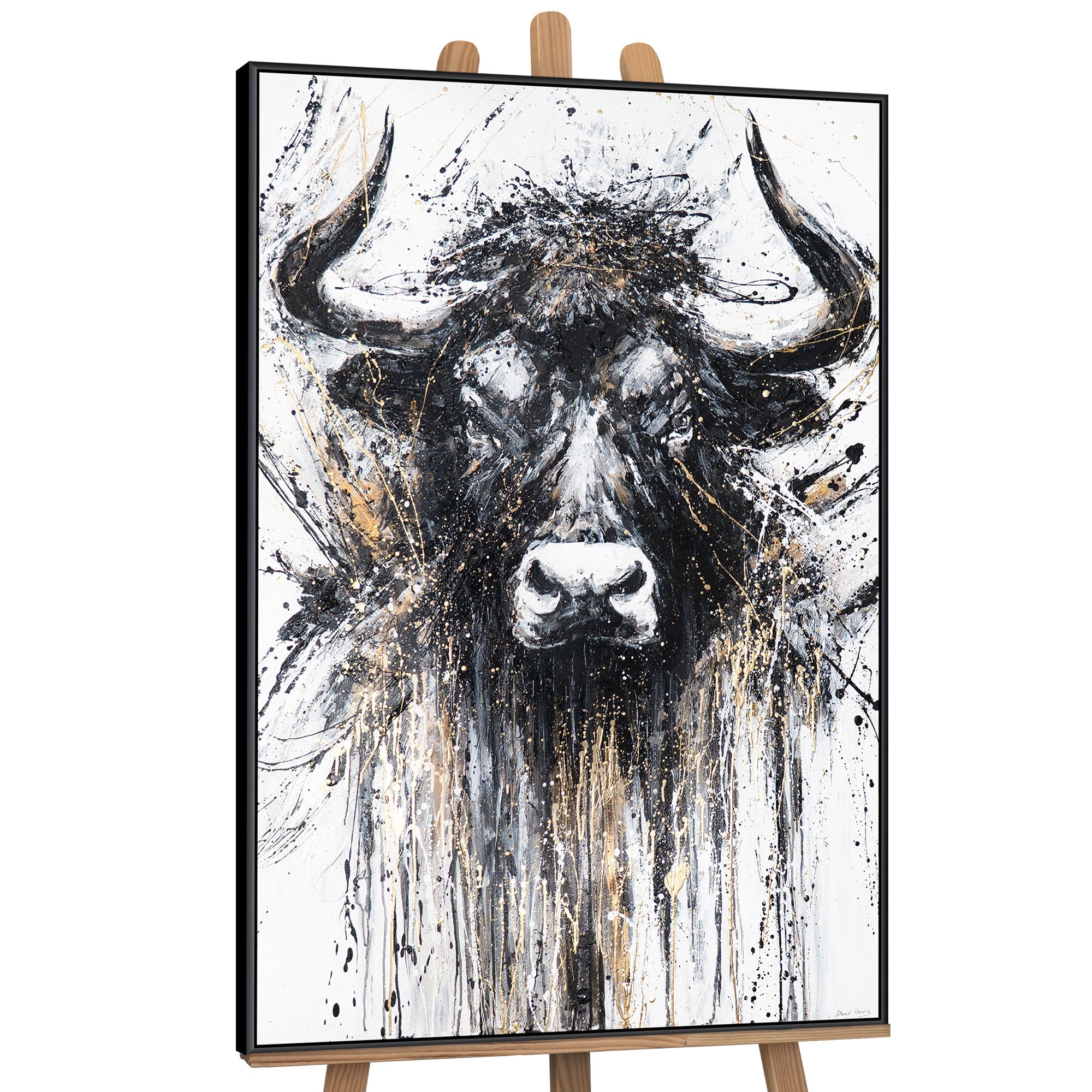 Dieses eindrucksvolle Leinwandbild zeigt einen frontal blickenden Bullen – majestätisch, ruhig und zugleich voller innerer Kraft. In reduzierter Farbpalette aus Schwarz, Weiß und Gold erschafft der Künstler eine dynamische Textur mit energiegeladenen Pinselbewegungen und markanten Details. Goldene Spritzer verleihen dem Werk Eleganz und Spannung, während die ausdrucksstarken Augen des Tiers den Betrachter direkt anziehen.