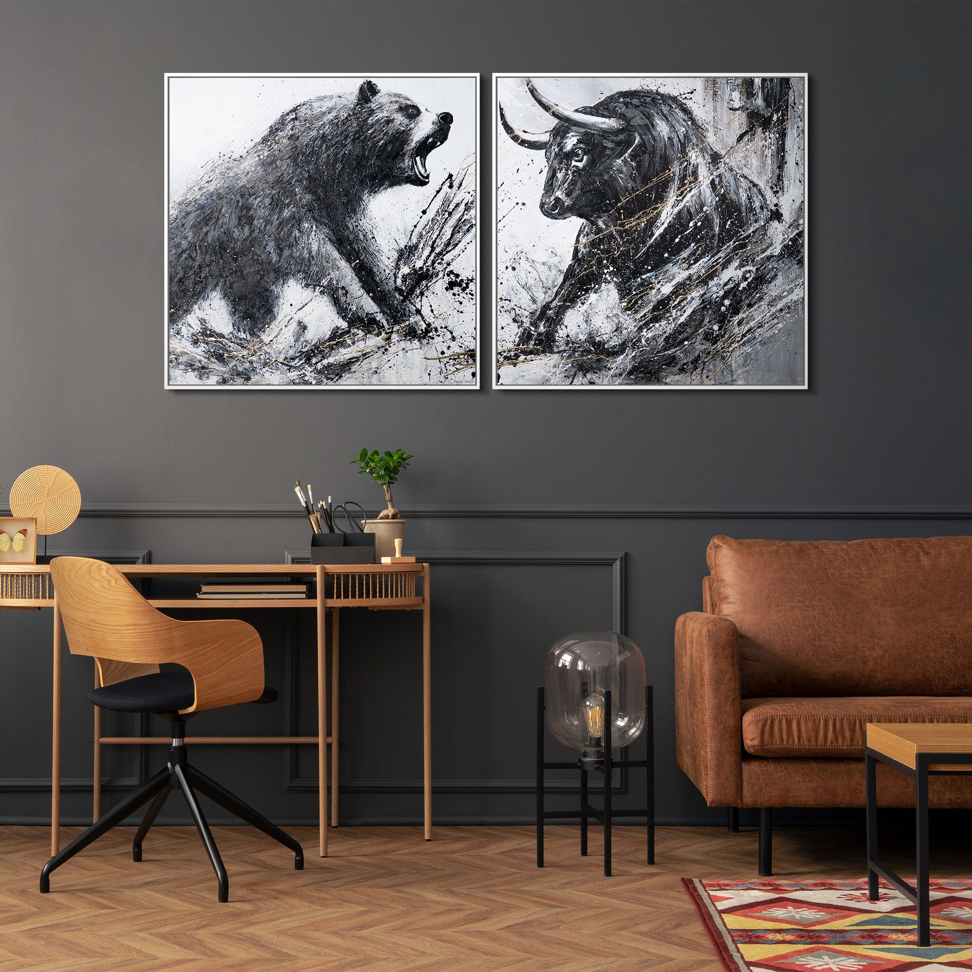 Handgemaltes Diptychon mit Bulle & Bär mit Rahmen - Büro wanddeko