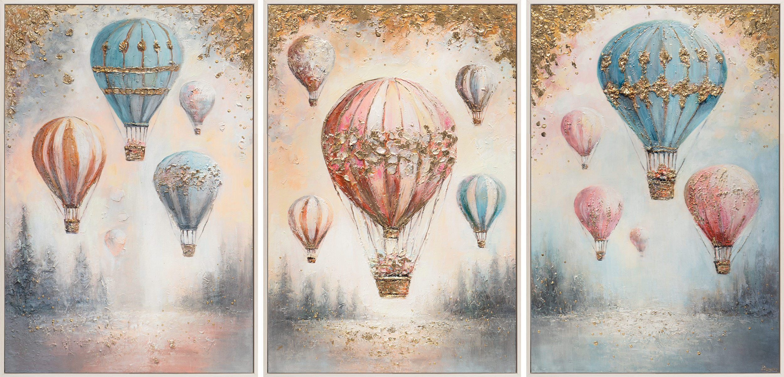 Das dreiteilige Leinwandbild „Luftige Träume“ ist ein bezauberndes Acryl-Triptychon, das mit sanften Pastelltönen und liebevollen Ballon-Motiven Kinder- und Babyzimmer in eine verträumte Atmosphäre taucht. Die handgemalte Struktur verleiht jedem der drei Teile eine lebendige Tiefe und betont die filigranen Details der Goldakzente und der flauschigen Wolkenlandschaft. Dieses Kunstwerk erzeugt ein Gefühl von Leichtigkeit und Geborgenheit, das perfekt für die Gestaltung von behaglichen Rückzugsorten für die Kleinsten ist.