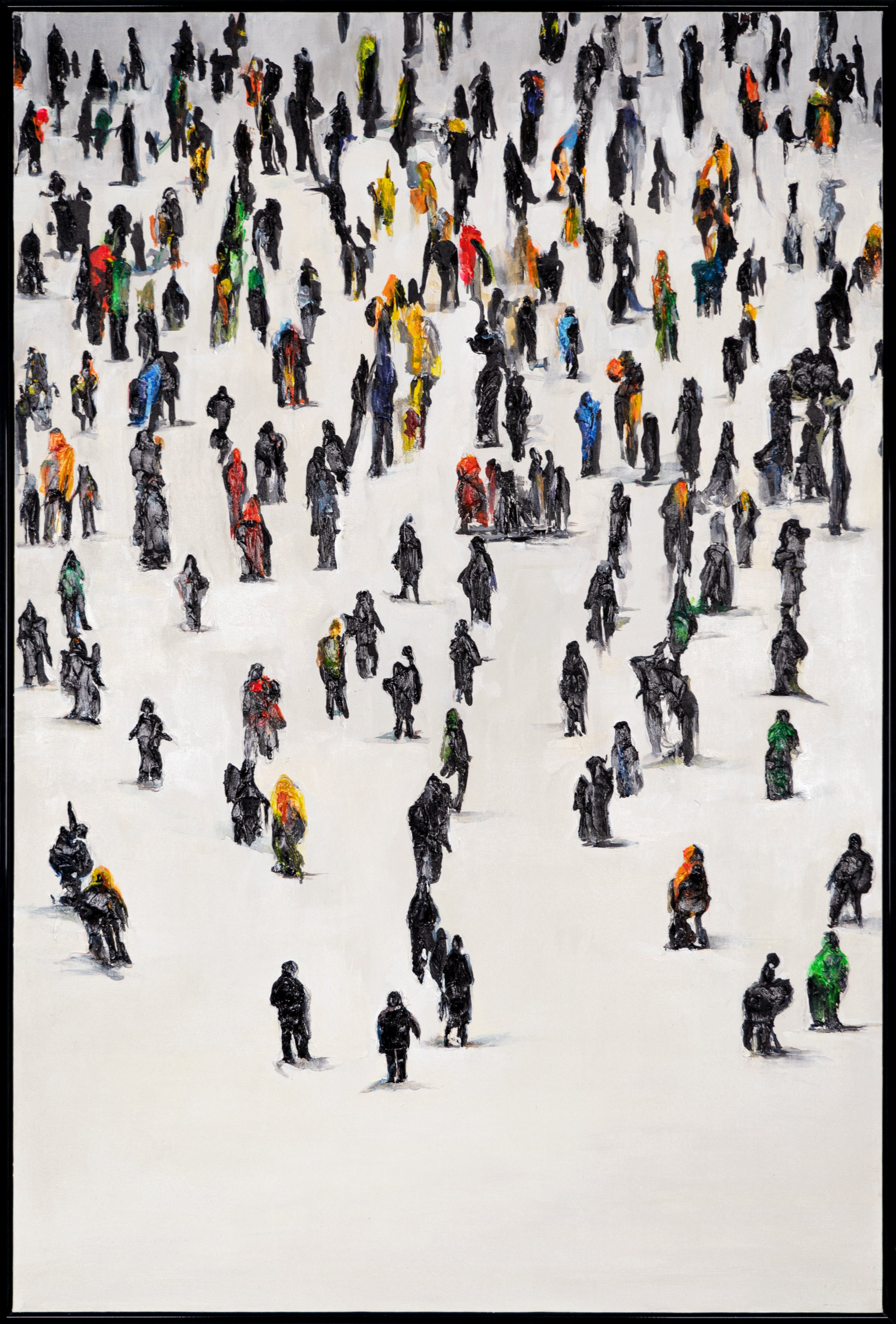 Bereichern Sie Ihr Zuhause oder Büro mit diesem farbenfrohen, abstrakten Kunstwerk, das die Dynamik einer Menschenmenge darstellt. Das Bild besticht durch kräftige Farbtöne und ausdrucksstarke Pinselstriche. Es ist 100% handgemalt und wird durch einen eleganten Rahmen hervorgehoben.