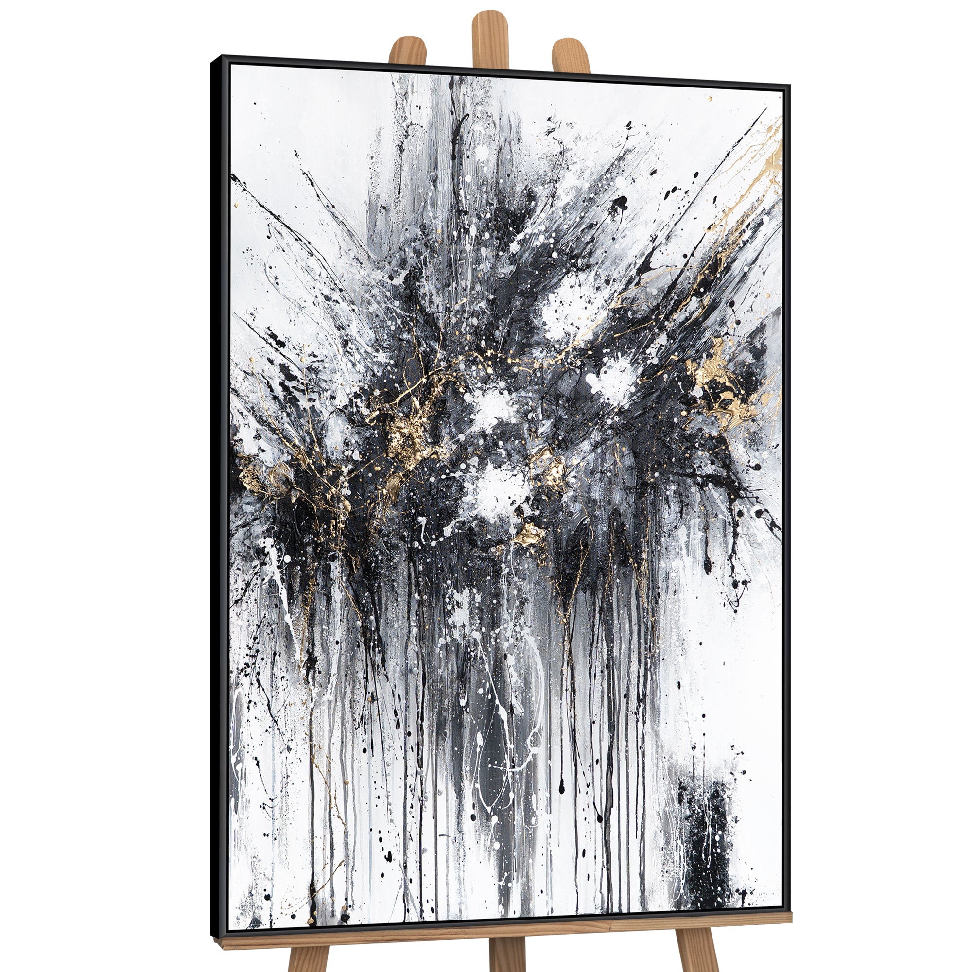 Ein dynamischer Ausbruch aus Linien, Tropfen und Farbexplosionen dominiert dieses abstrakte Kunstwerk in Schwarz, Weiß und Gold. Das Gemälde wirkt wie eine spontane Energieentladung auf der Leinwand – kraftvoll, unkontrolliert und doch harmonisch im Zusammenspiel. Die goldenen Akzente verleihen der Komposition einen Hauch von Eleganz und Tiefe, während die strukturierte Oberfläche das Licht unterschiedlich reflektiert.