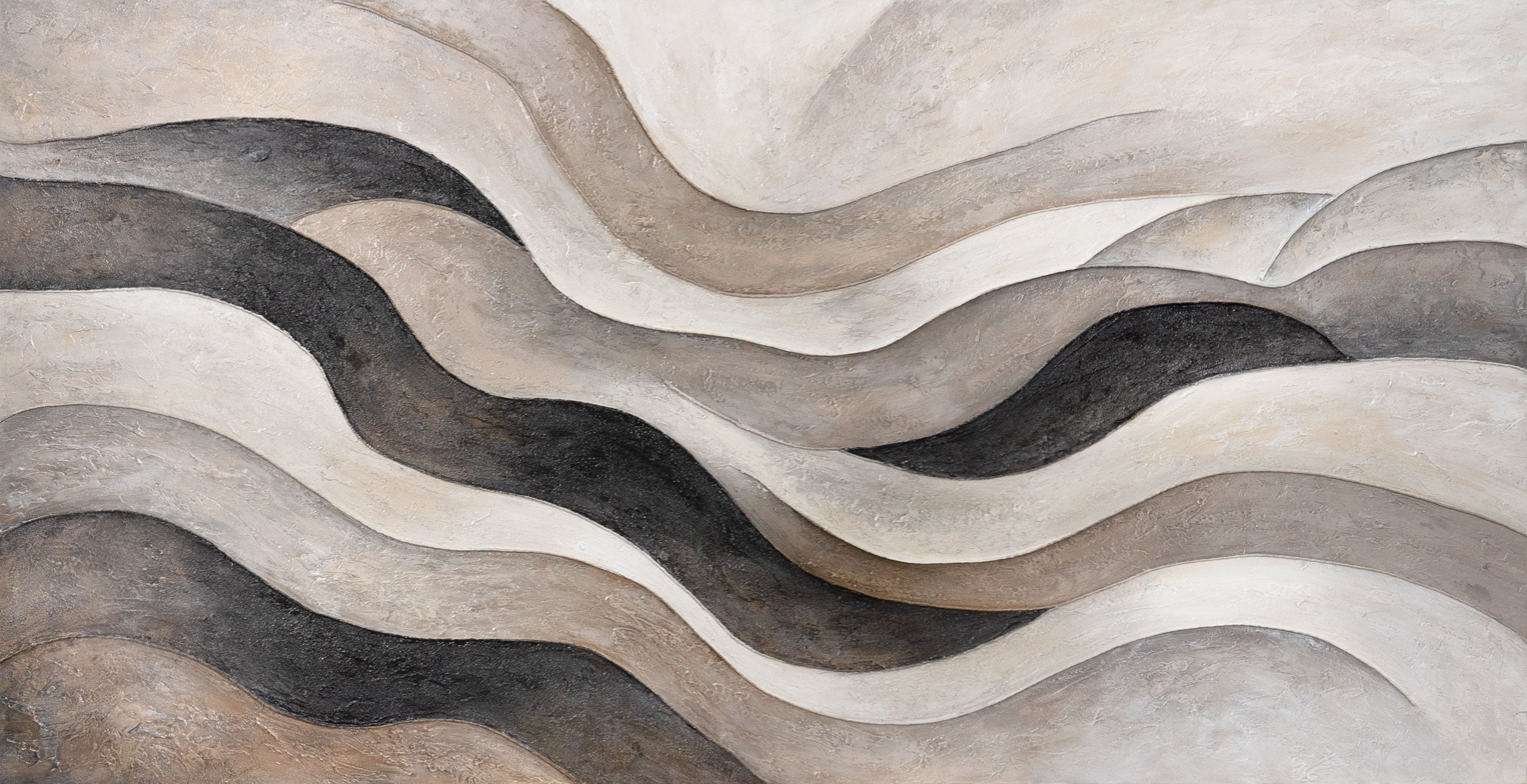 „Sandwellen“ ist ein handgemaltes Acrylbild auf Leinwand, das durch seine organischen Formen und die feine Relief-Struktur beeindruckt. In sanften Tönen von Beige, Creme, Grau und Schwarz entstehen geschwungene Linien, die an natürliche Dünenlandschaften erinnern. Jeder Pinselstrich bringt Tiefe und Bewegung in die Komposition, wodurch ein harmonisches Spiel aus Licht und Schatten entsteht.