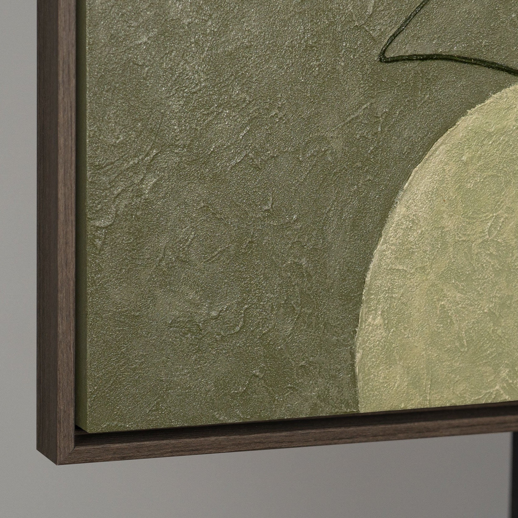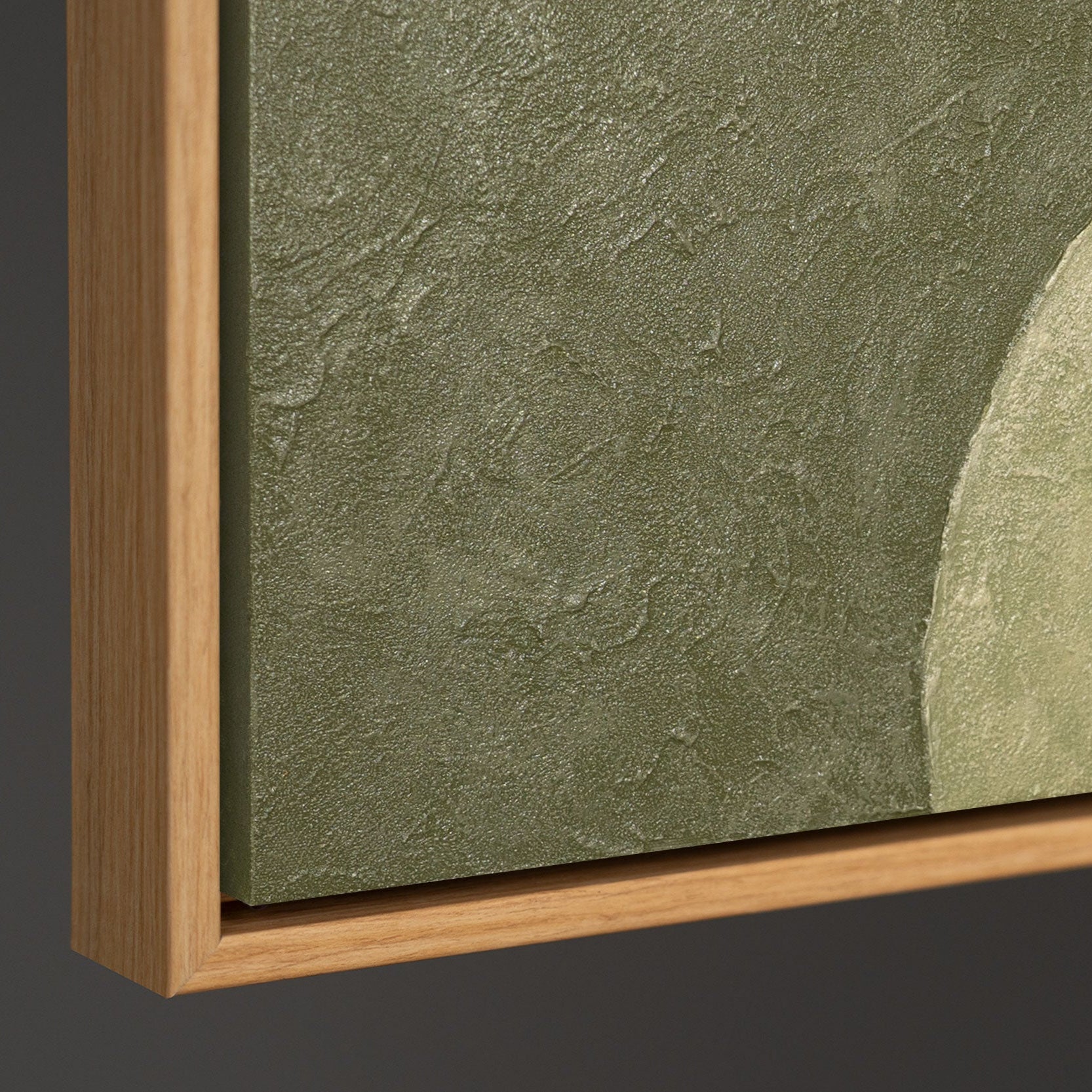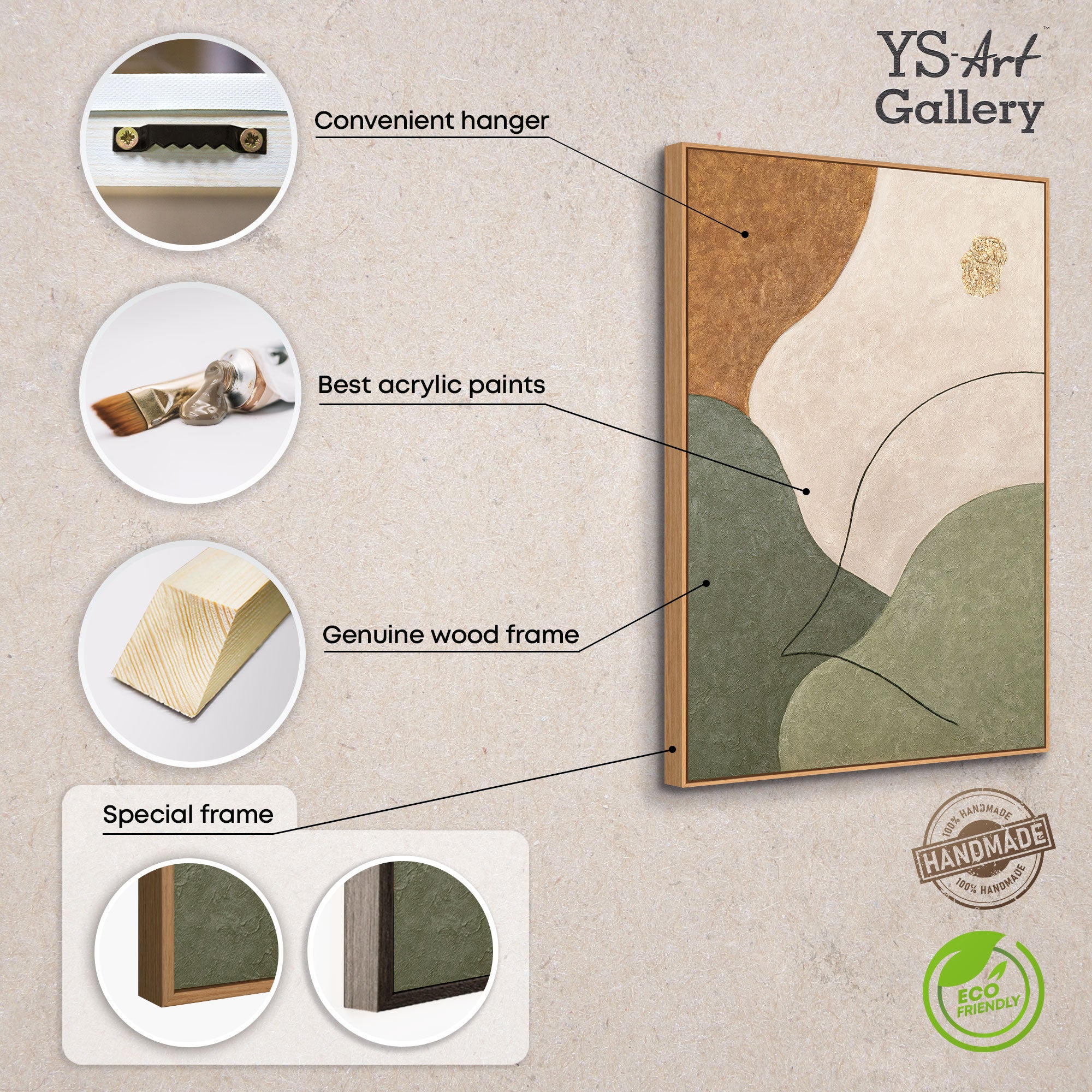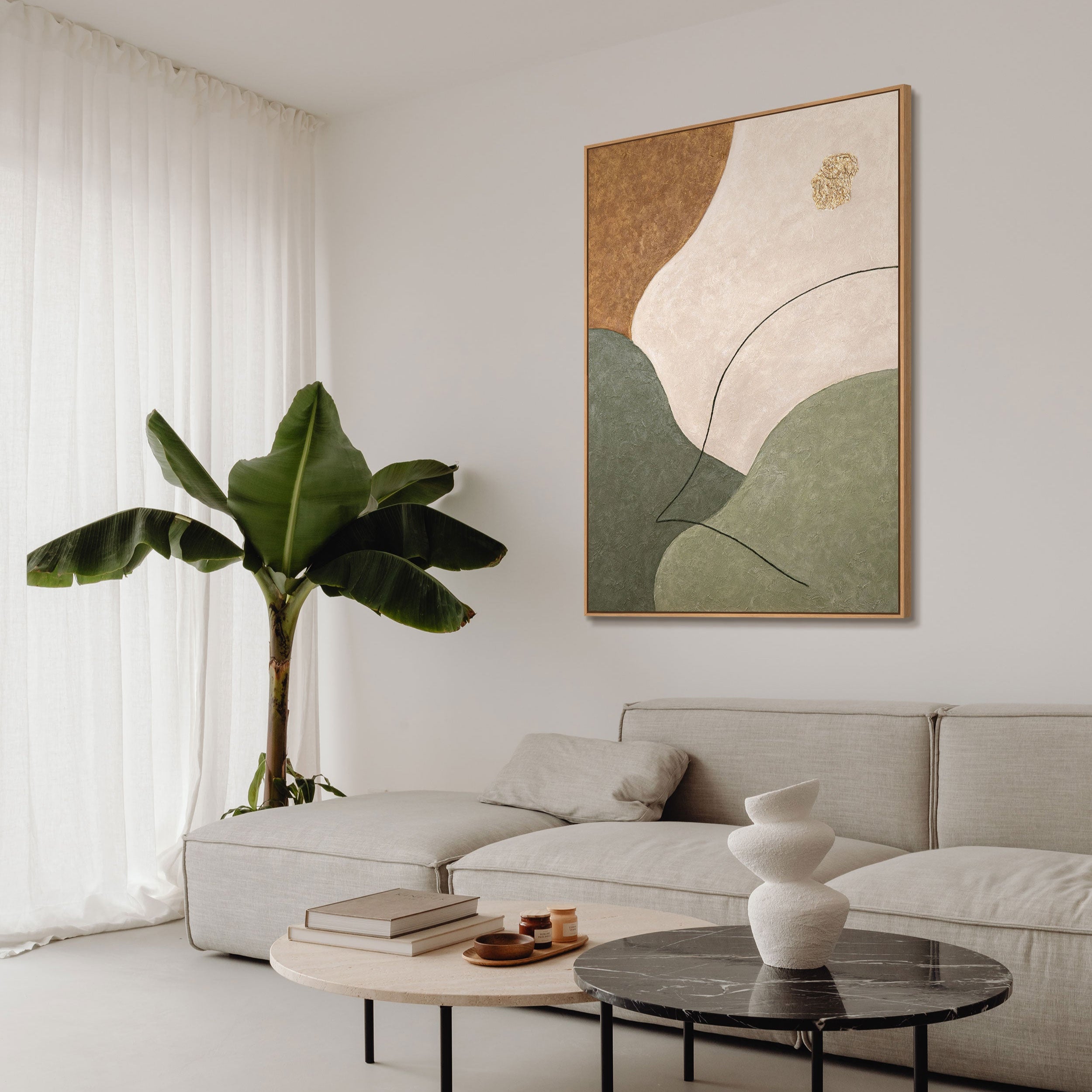 Bringen Sie Eleganz und Ruhe in Ihr Zuhause mit diesem handgefertigten abstrakten Wandbild. Die harmonische Kombination aus warmem Braun, sanftem Beige, beruhigendem Grün und einem goldenen Akzent macht dieses Gemälde zu einem echten Blickfang.