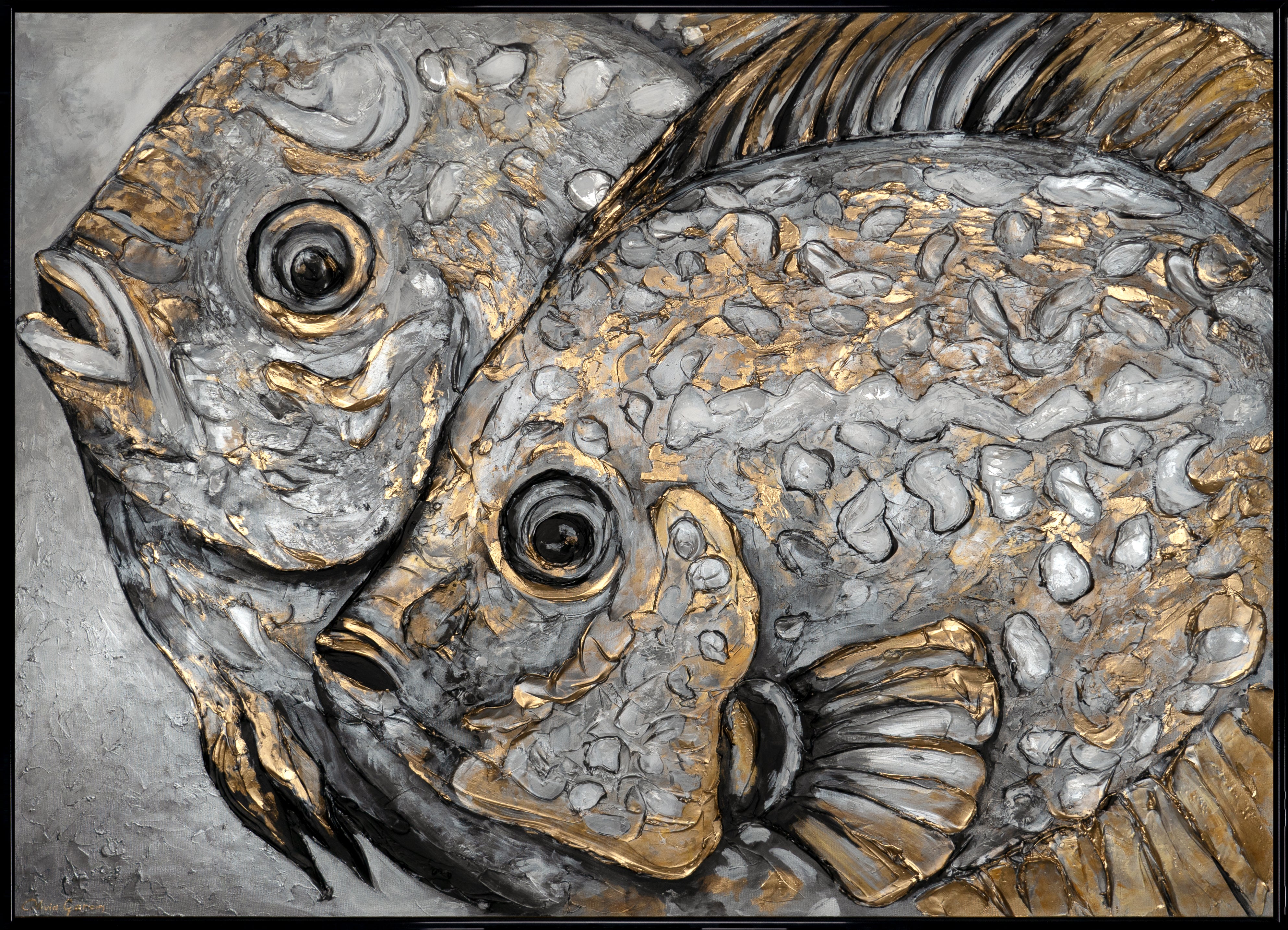 • Acrylgemälde mit Fischen und Goldakzenten Handgemalte Kunst auf Leinwand mit Rahmen Magische Fische