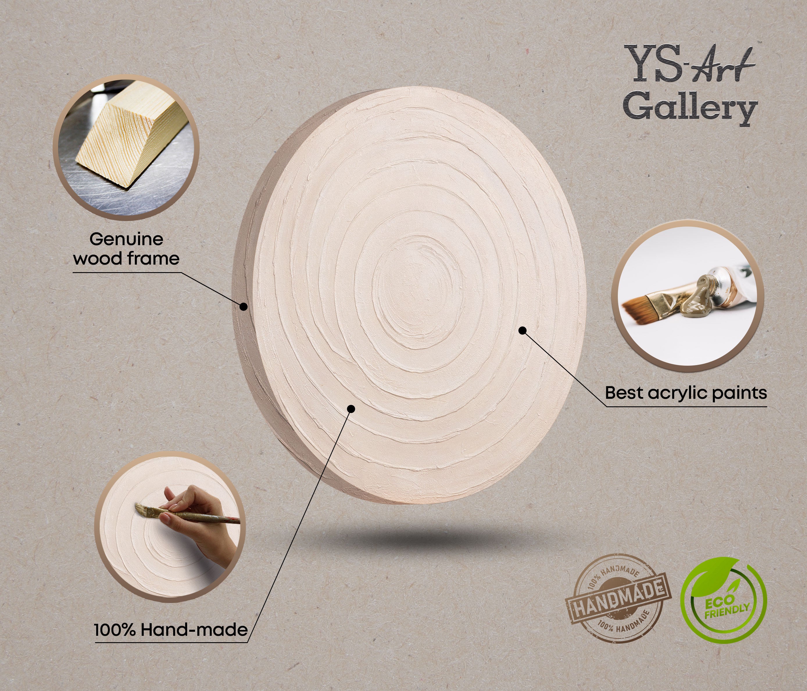 - Materialien: Acrylfarben auf runder Leinwand, auf Keilrahmen gespannt (ohne Außenrahmen)